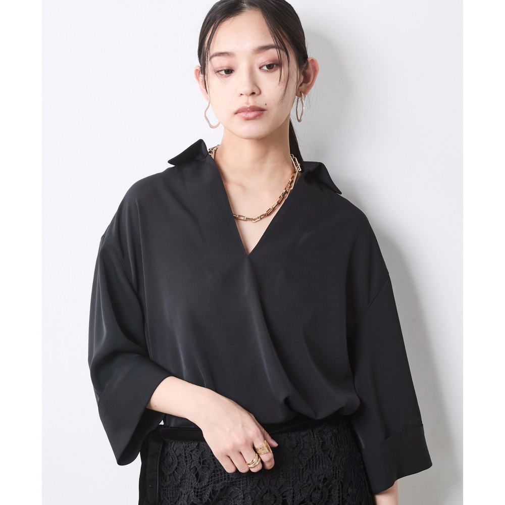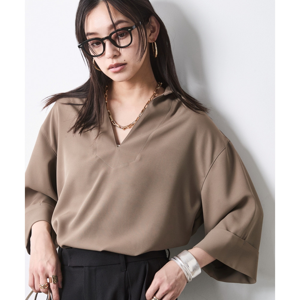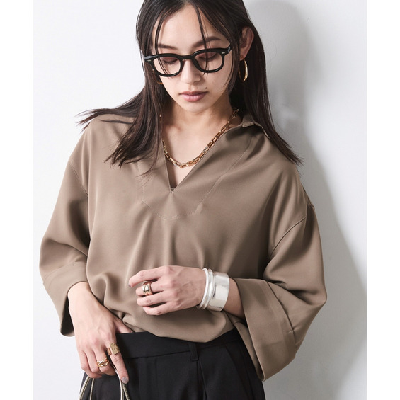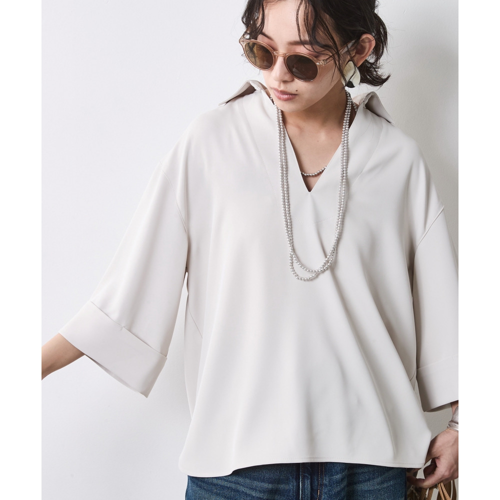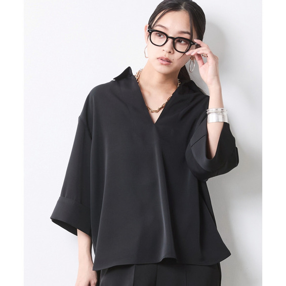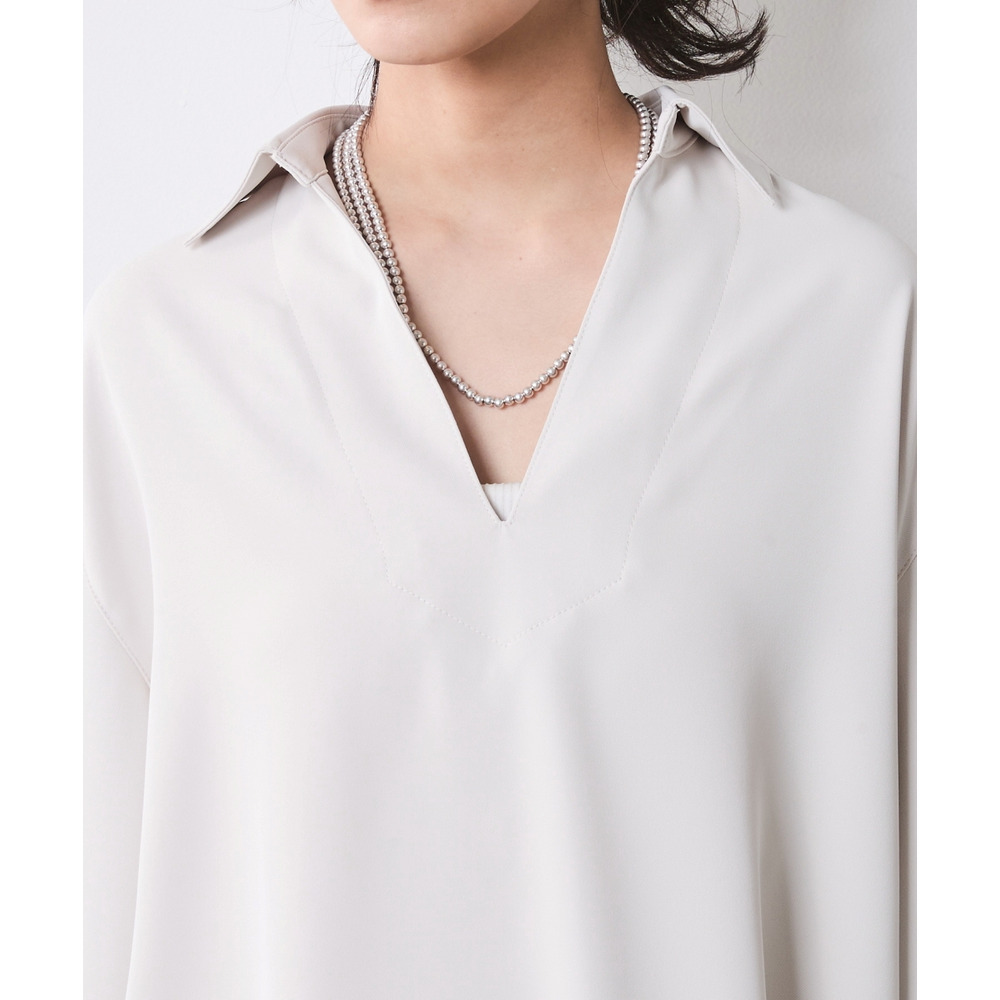 顔まわりをスッキリと見せるスキッパーデザインのブラウスです。