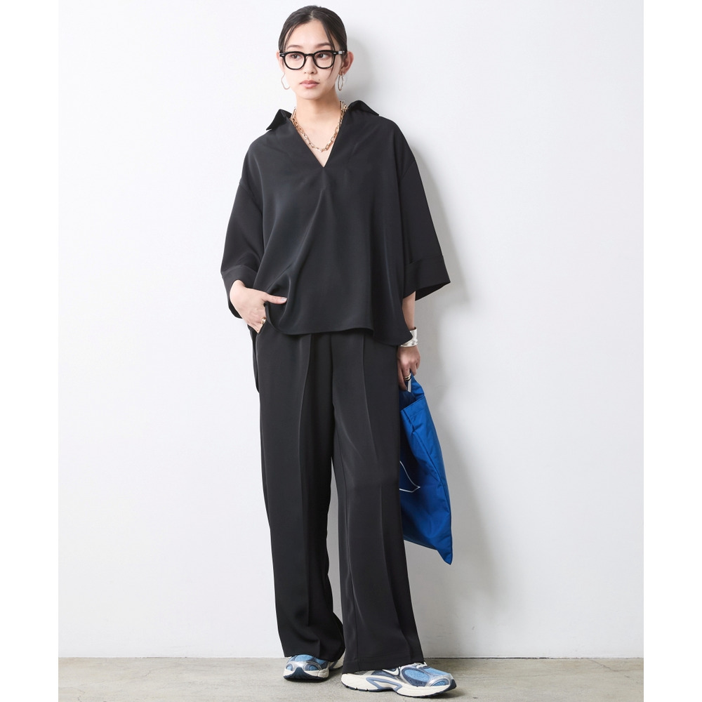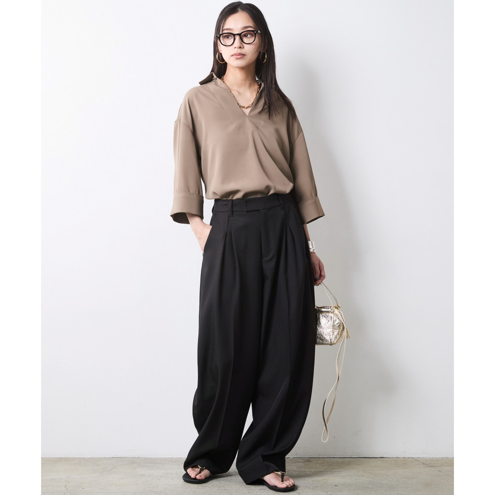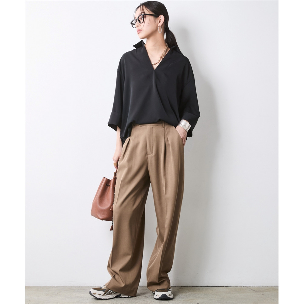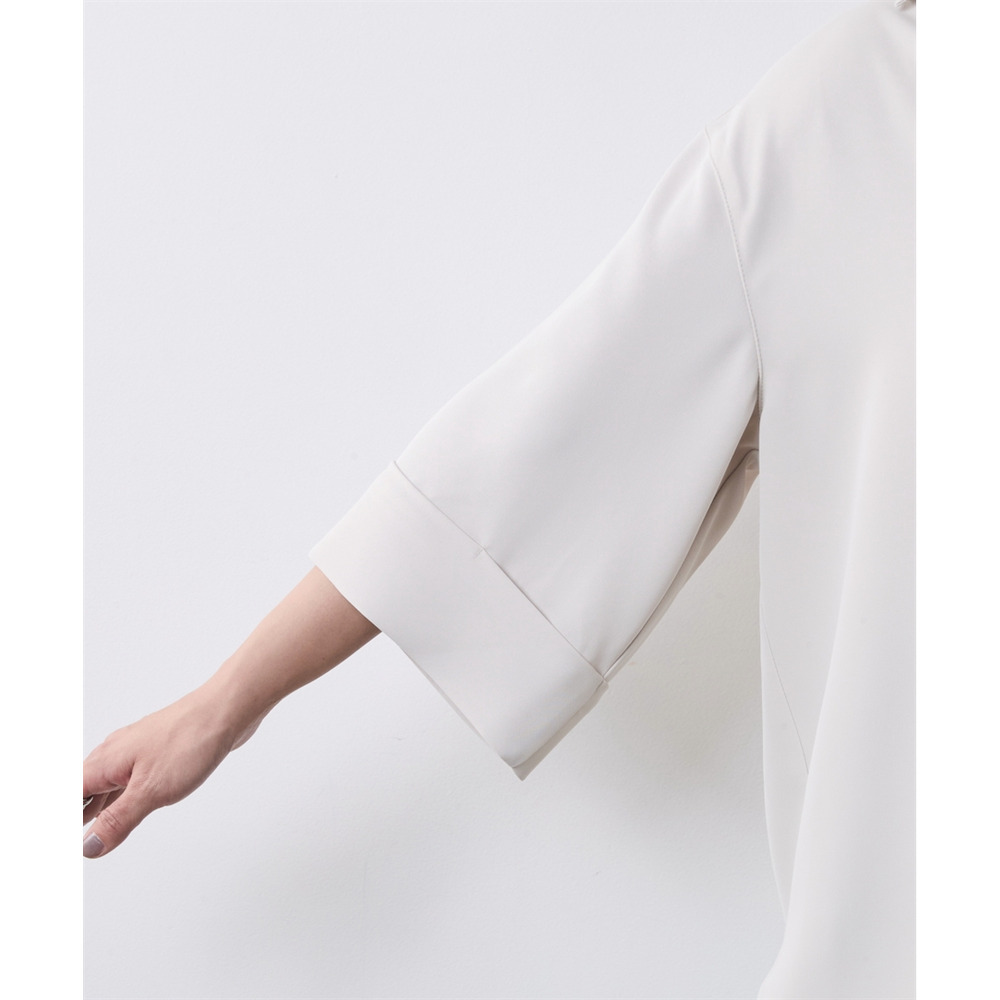 顔まわりをスッキリと見せるスキッパーデザインのブラウスです。