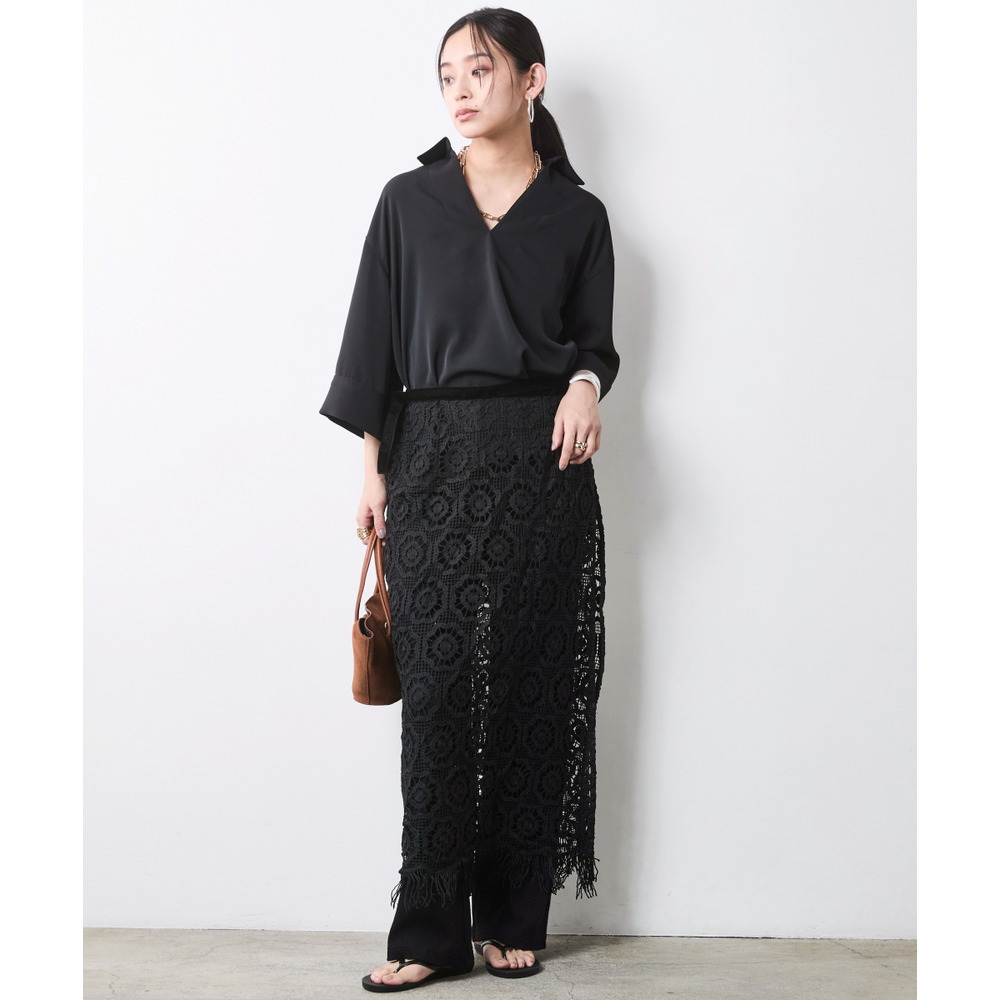 襟元のシャープさとレースの甘さが絶妙に溶け合い、大人の品格漂うレディな装いに仕上がります。