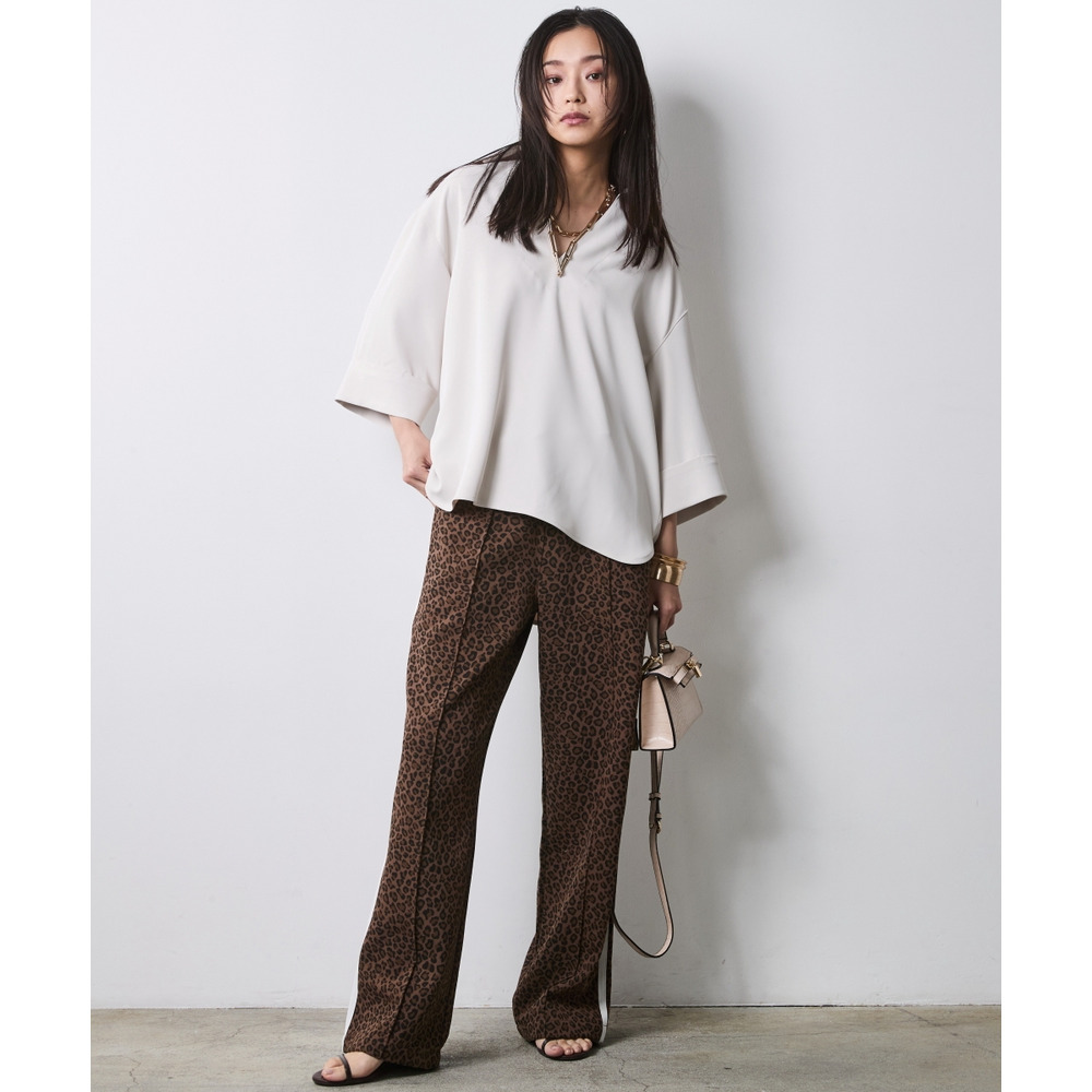 Urban Spice Casual:グレージュのブラウスを「レオパードトラックパンツ」でカジュアルダウン。