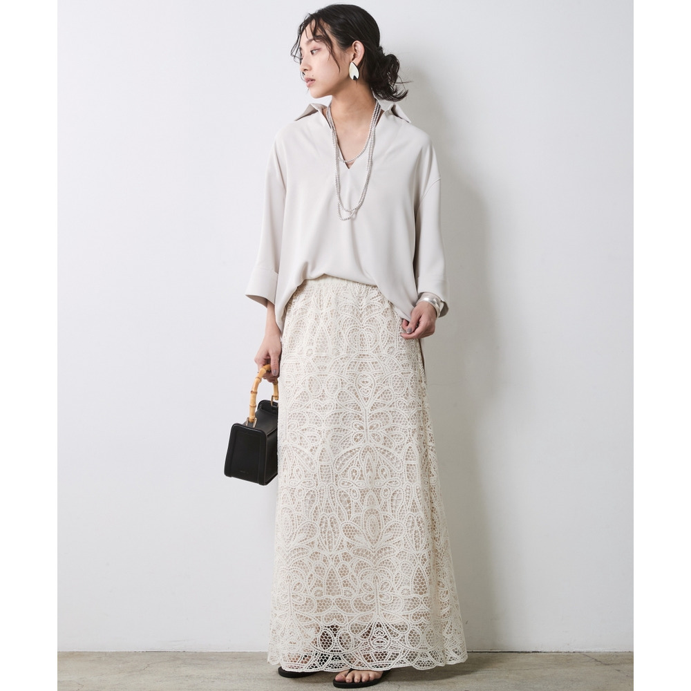 Feminine Lace Layered:アイボリーのブラウスに「レースマキシスカート」を合わせて。