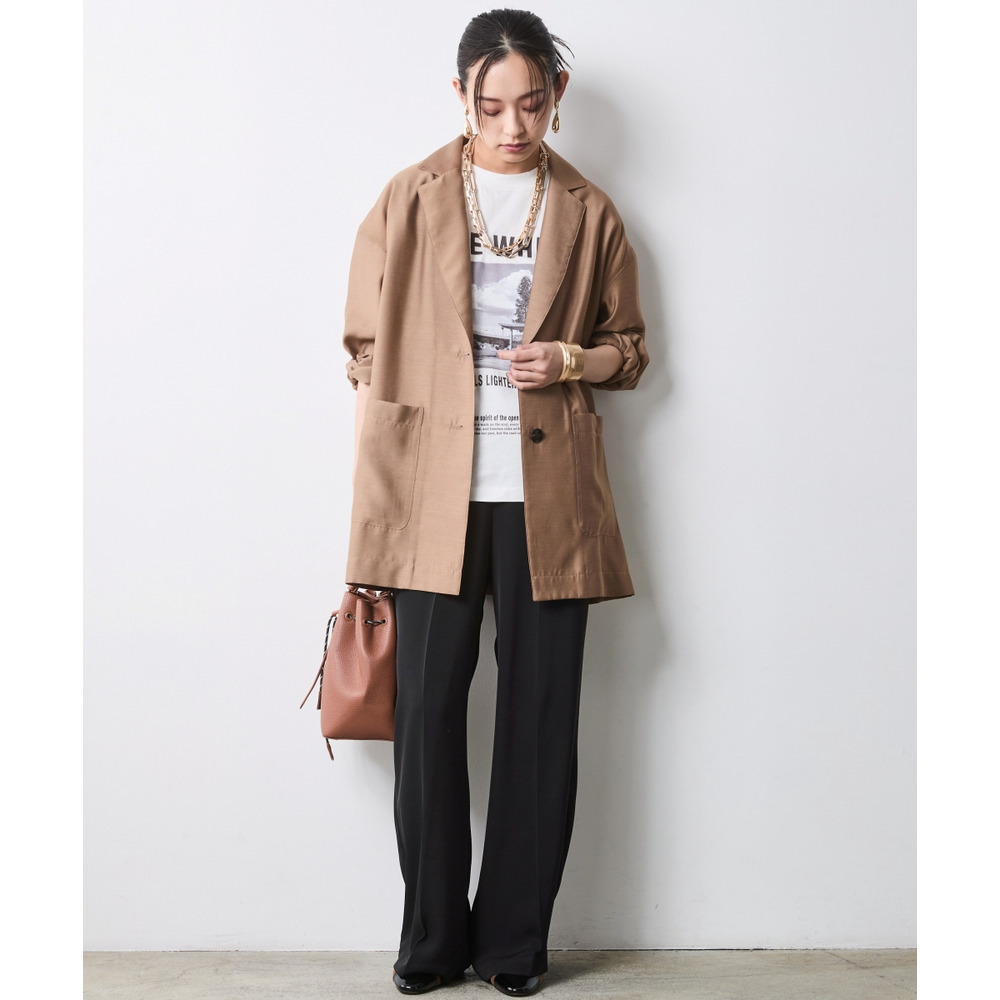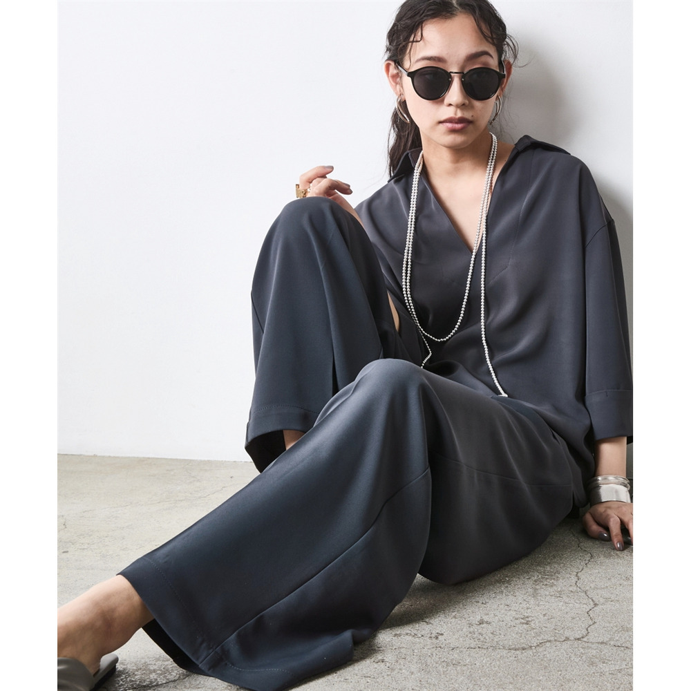 身体のラインを拾わないワイド設計ながら、素材の重みで裾に向かってすとんと真っ直ぐに落ちるシルエットを採用。
