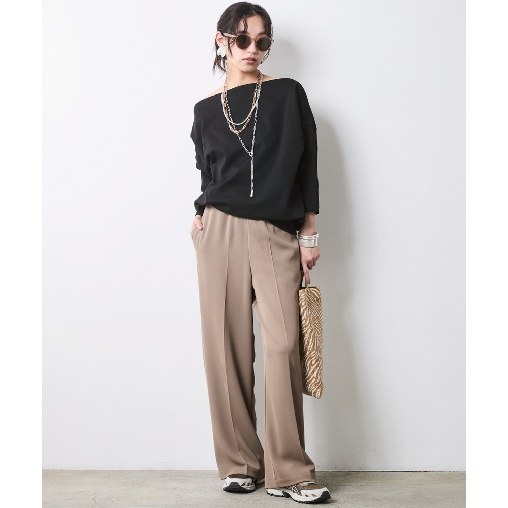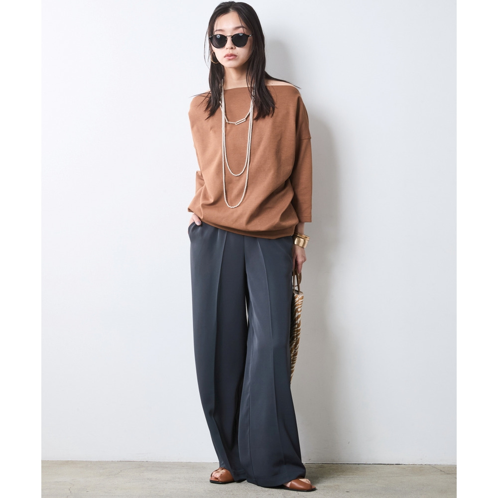あえてボートネックを肩から落として着ることで、パンツの重厚感とデコルテの抜け感が絶妙なバランスを生み、洗練されたモードスタイルが完成します。