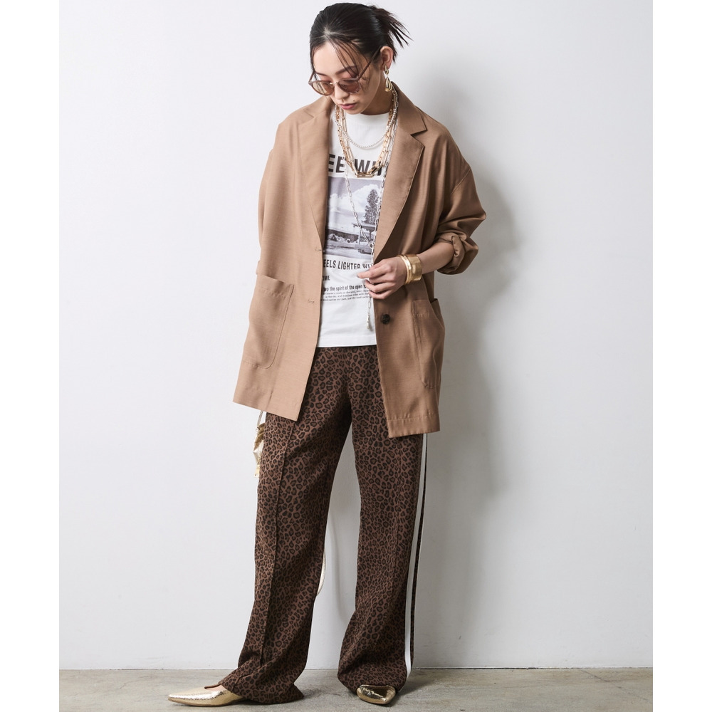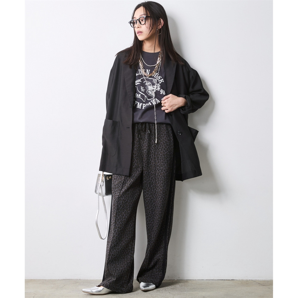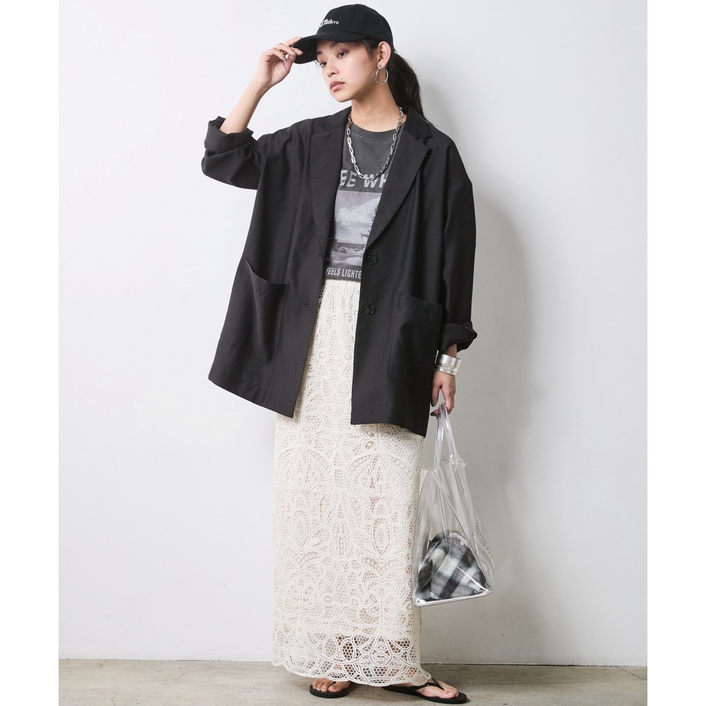インパクトのあるボトムスも、透け感のあるジャケットを合わせることで重たさが軽減され、都会的でエッジの効いた装いに仕上がります。