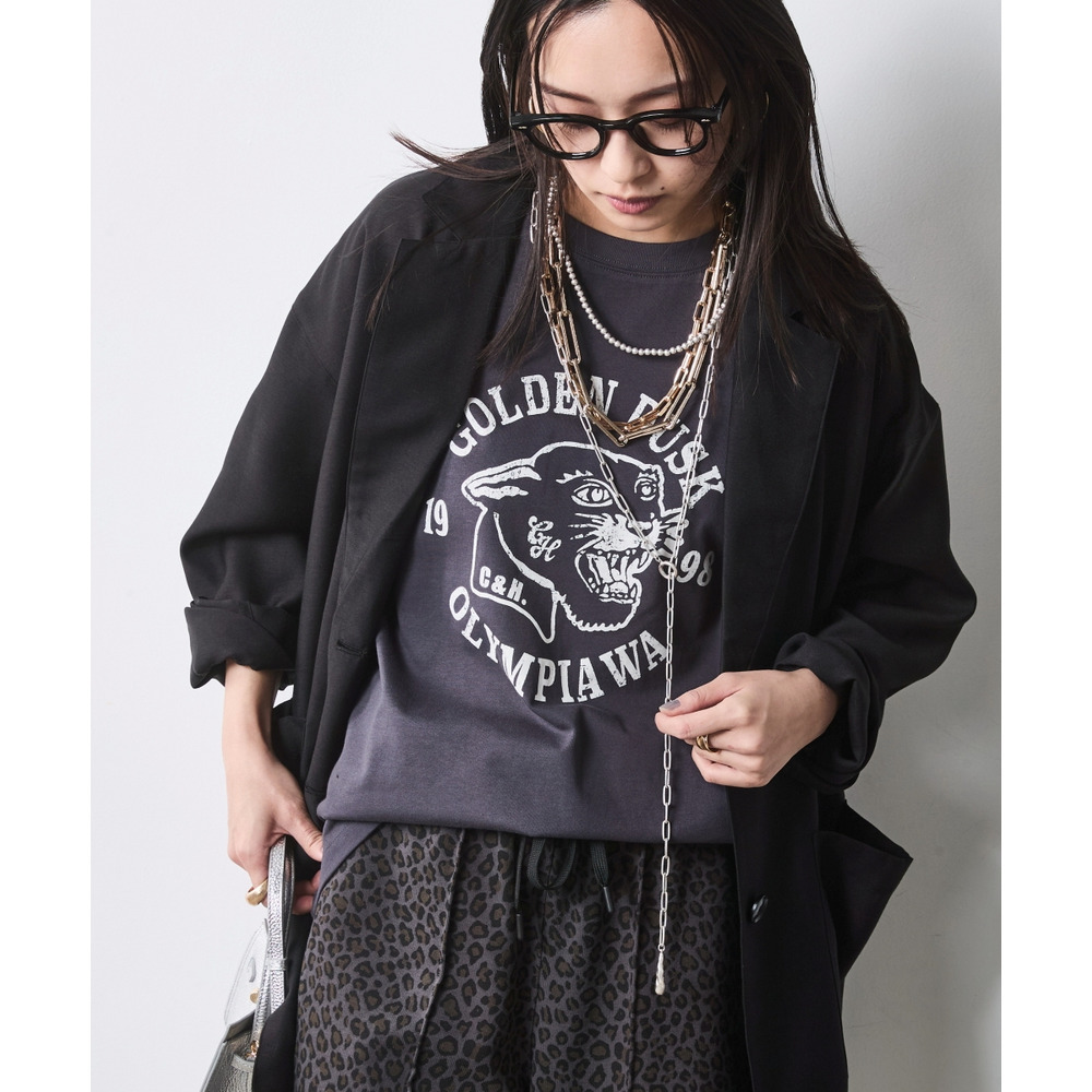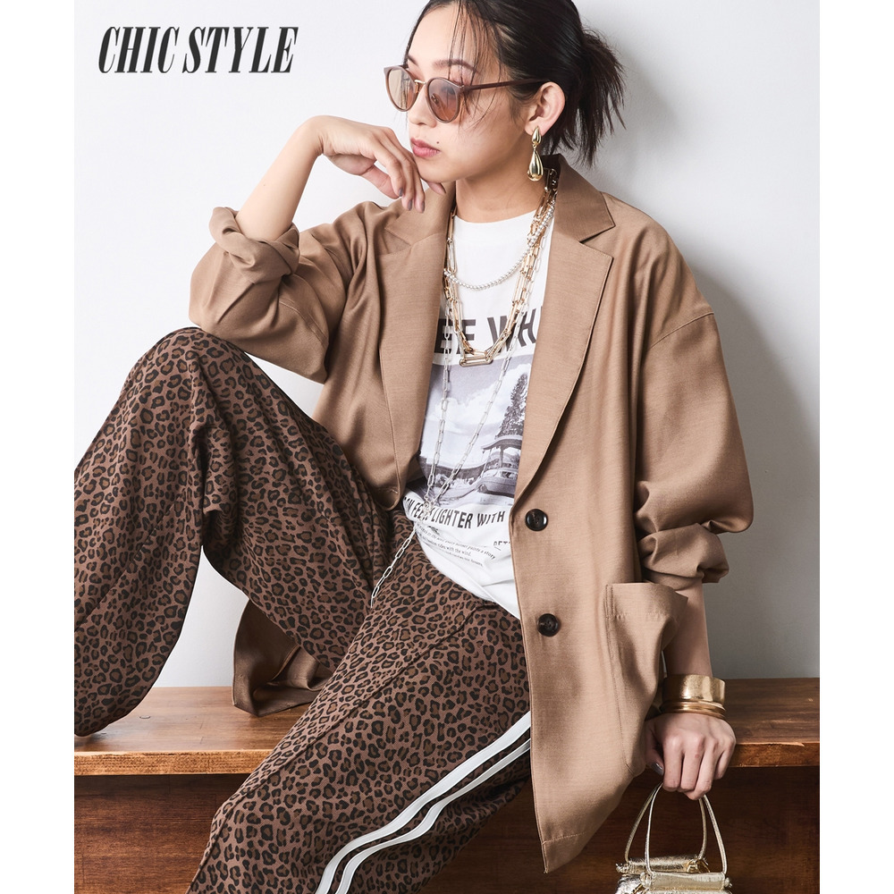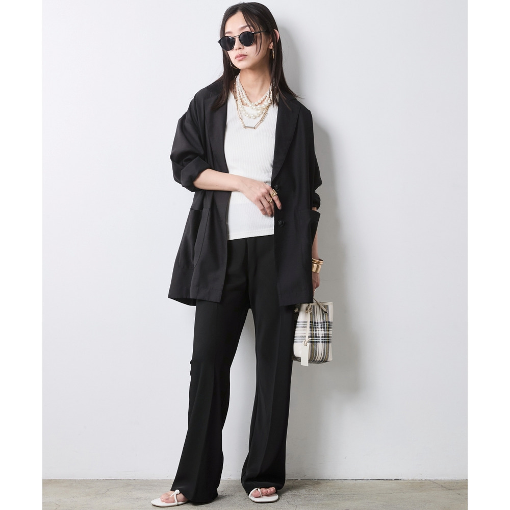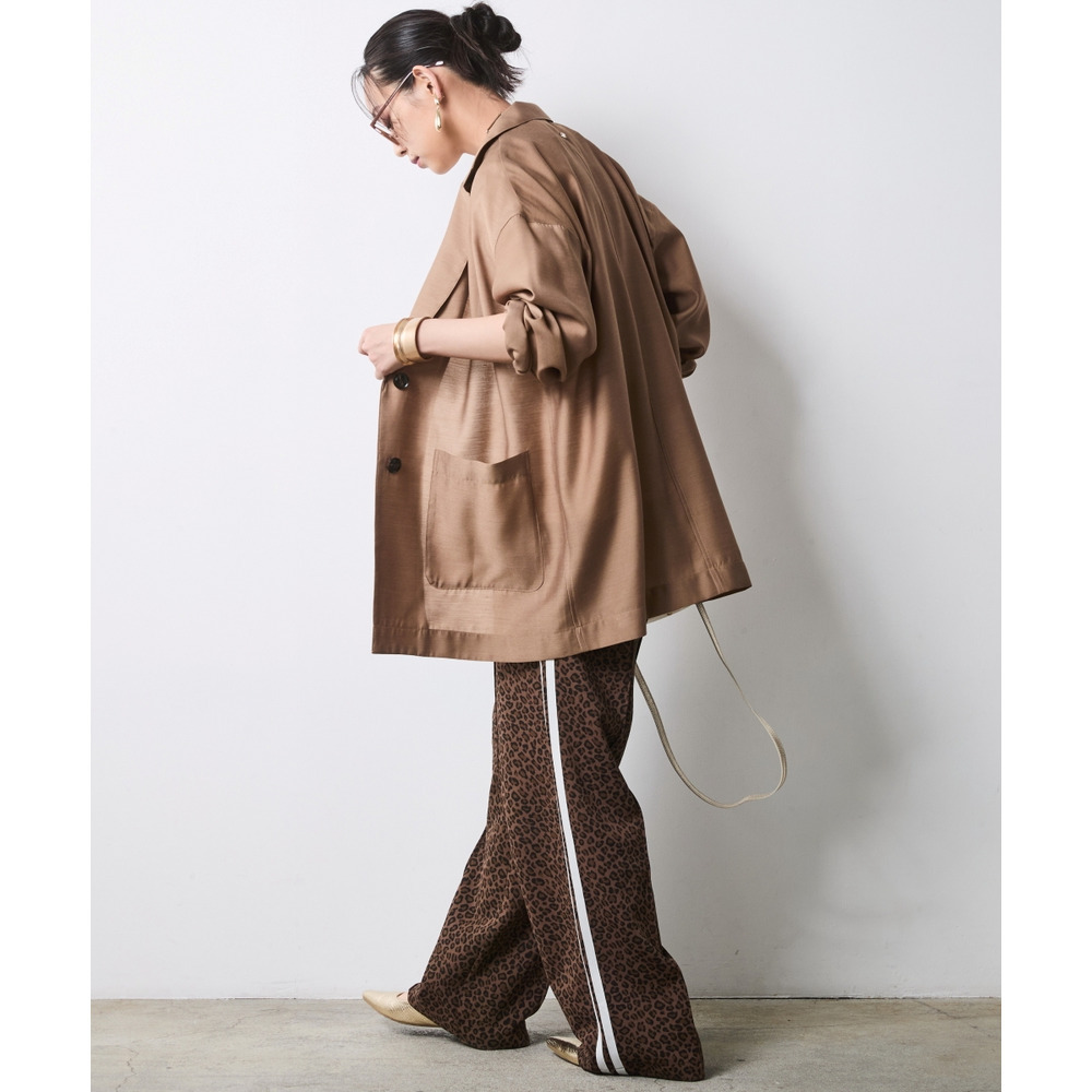 インパクトのあるボトムスも、透け感のあるジャケットを合わせることで重たさが軽減され、都会的でエッジの効いた装いに仕上がります。