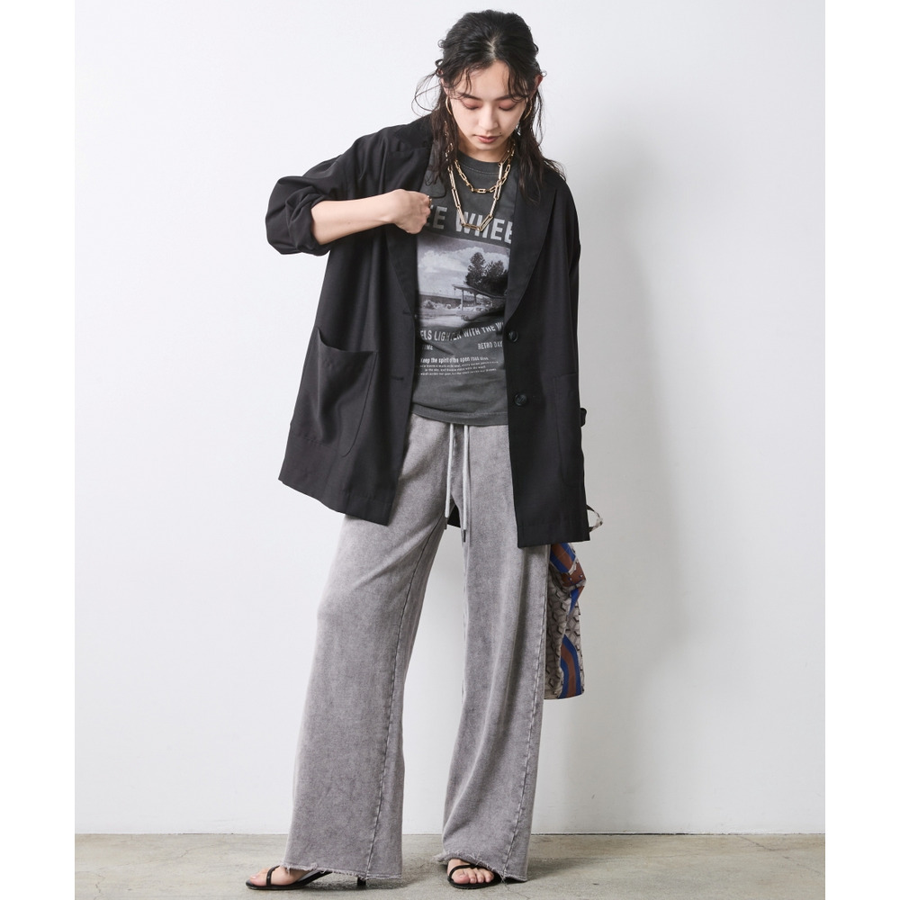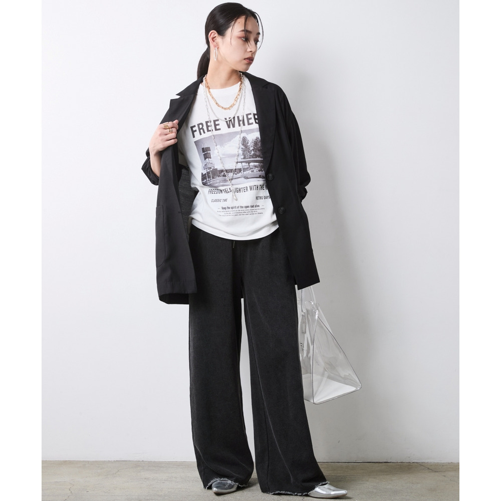 Casual Mix Look:グラフィックTシャツとワイドパンツのリラックススタイルにプラス。