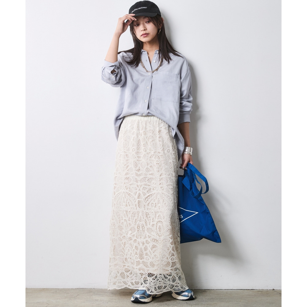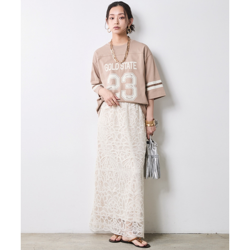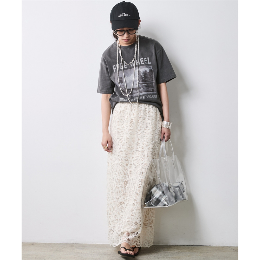 ラフなトップスと甘いレースのコントラストが、こなれ感たっぷりの大人の遊び心を体現します。