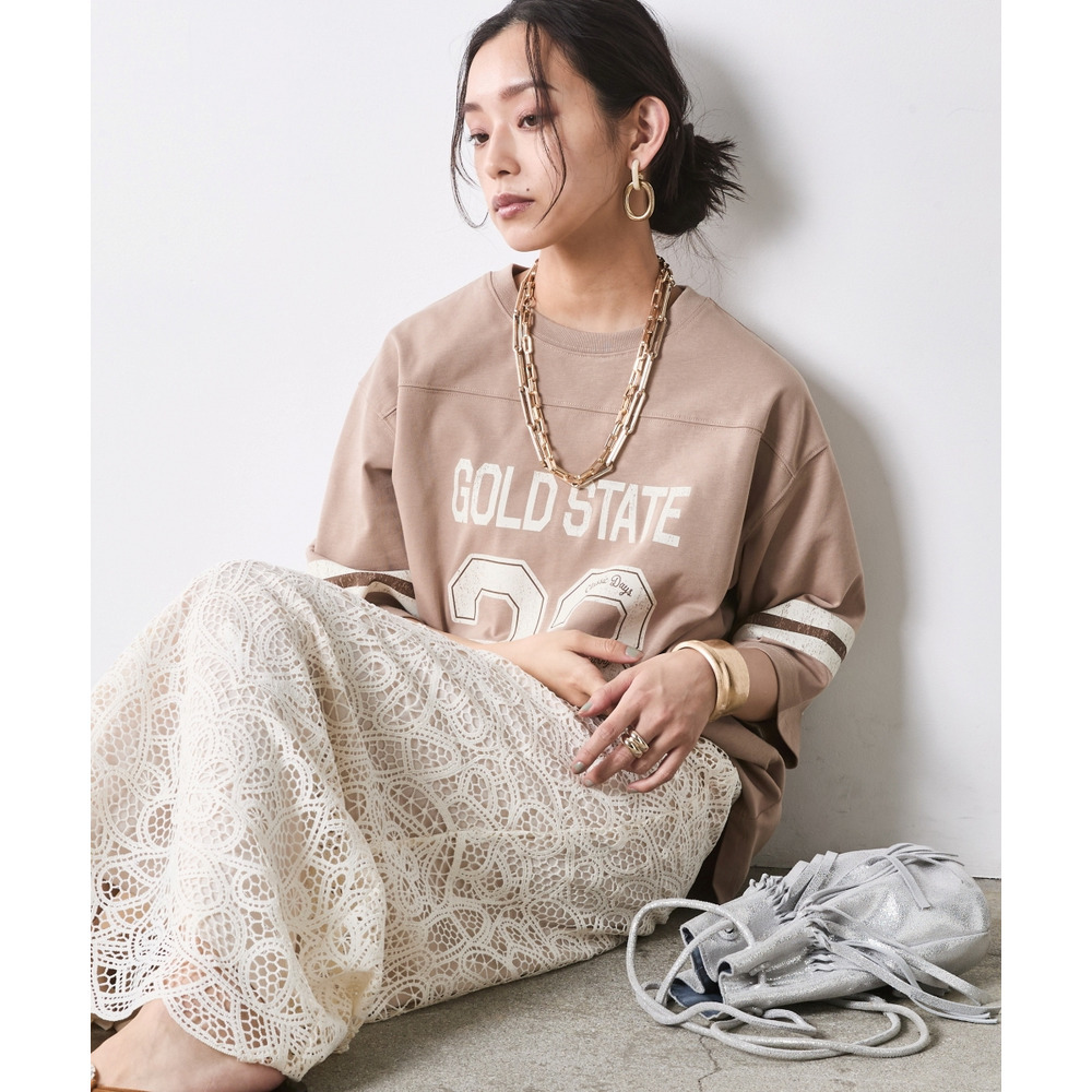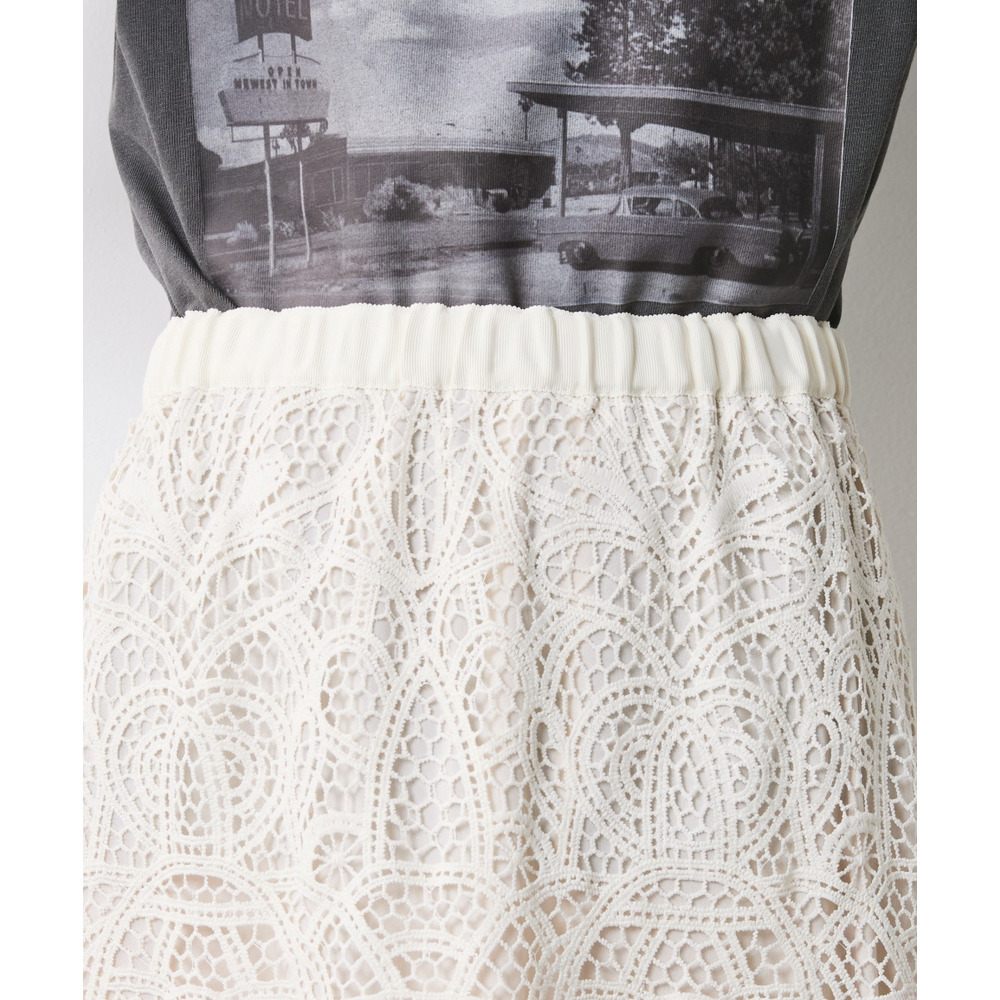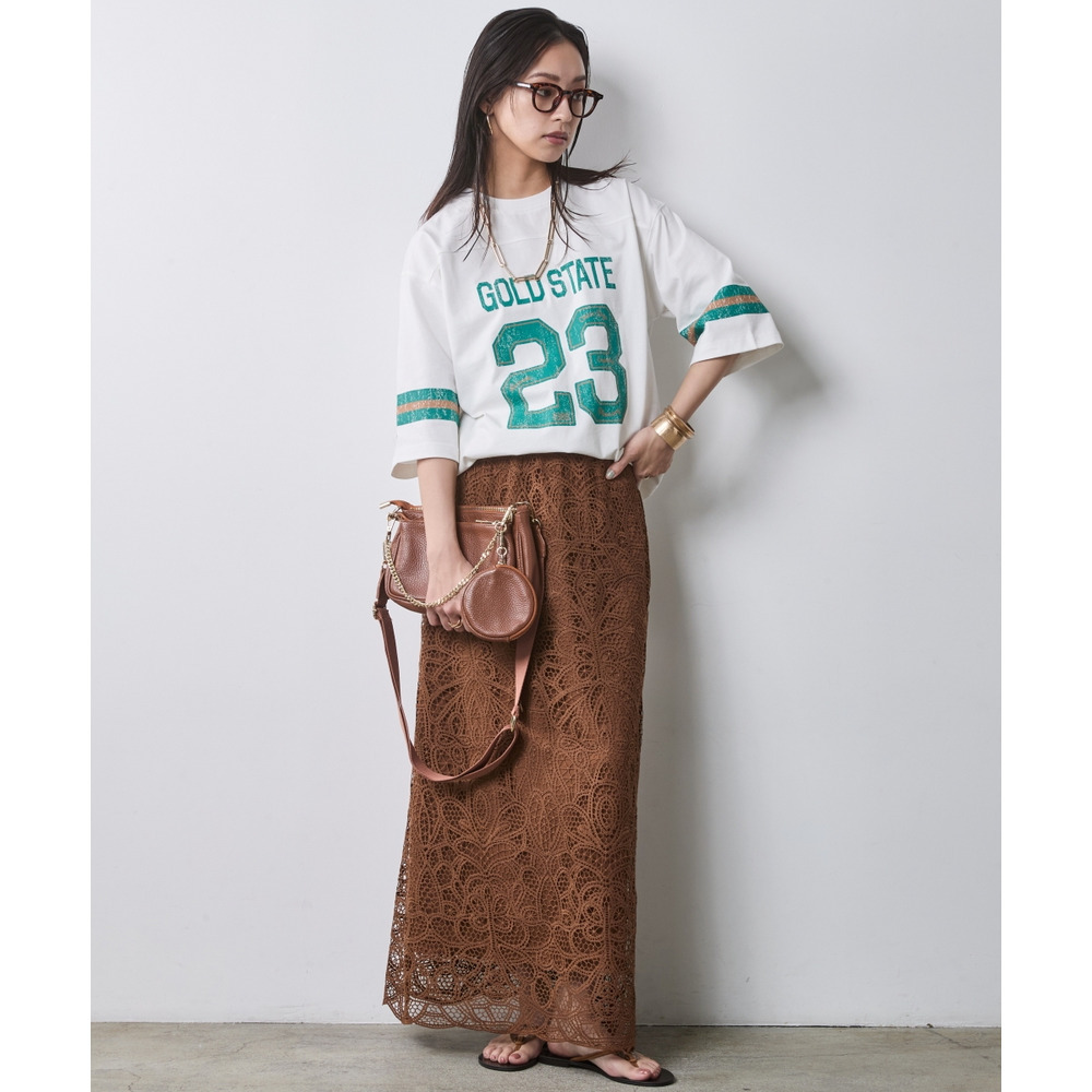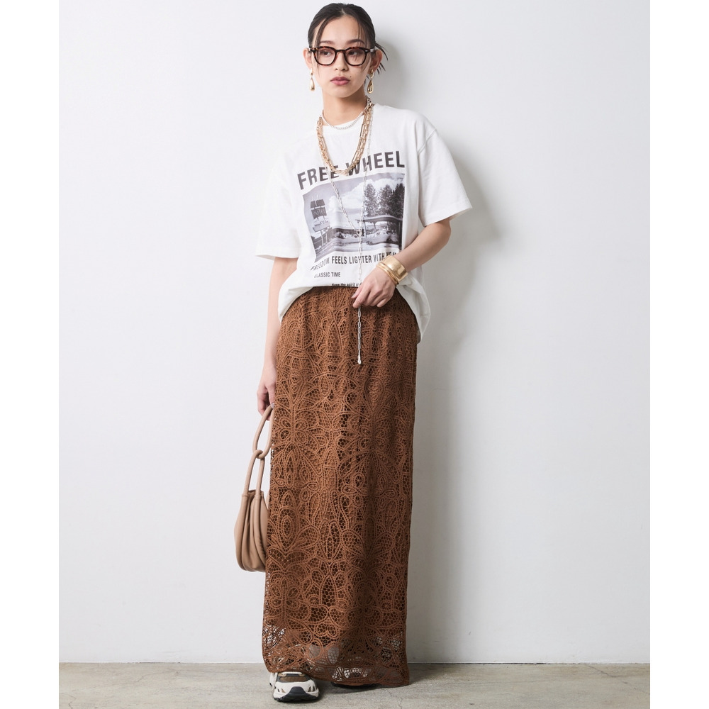 ラフなトップスと甘いレースのコントラストが、こなれ感たっぷりの大人の遊び心を体現します。
