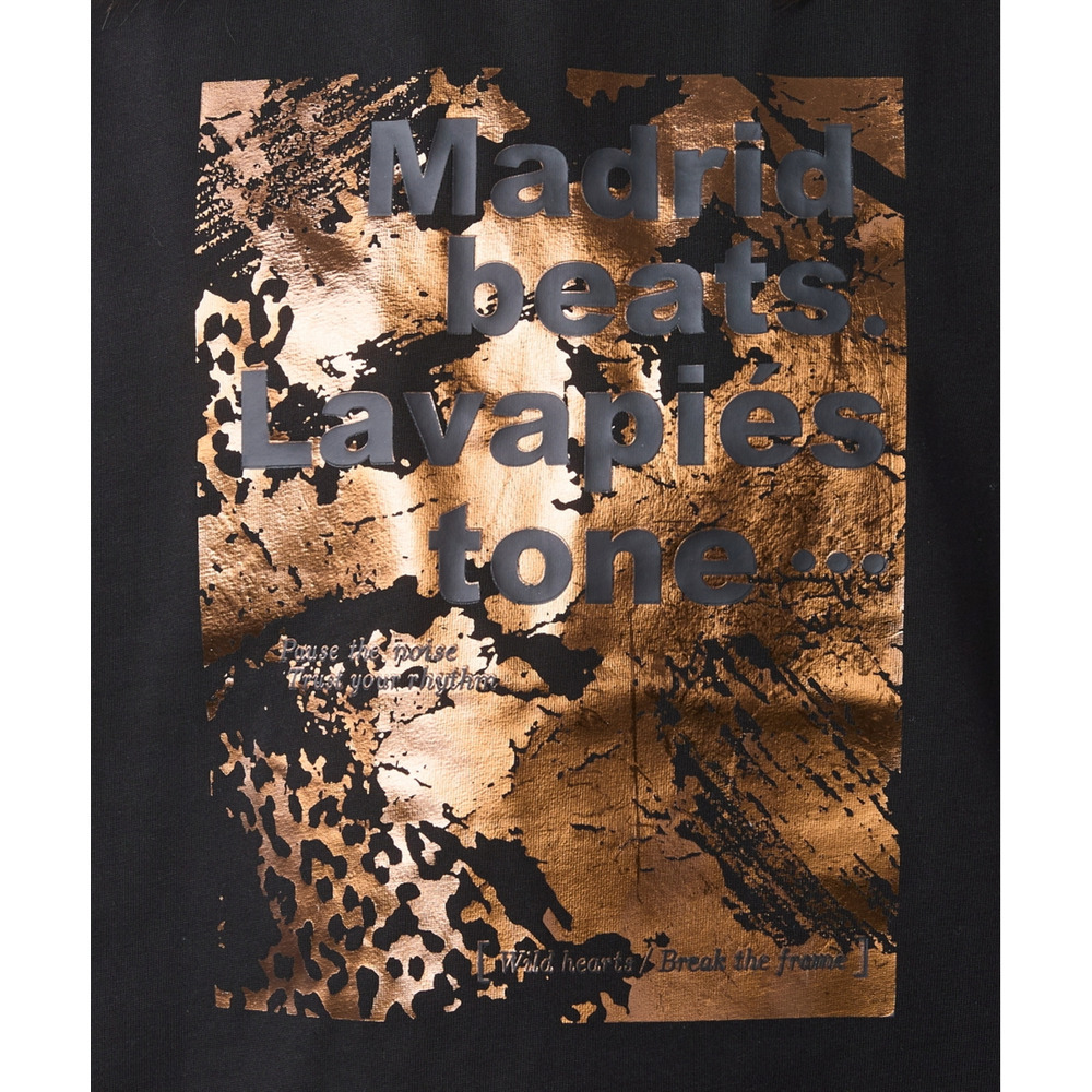 存在感を放つ箔プリント、フロントには、スクエア状のグラフィックとタイポグラフィを配置。
