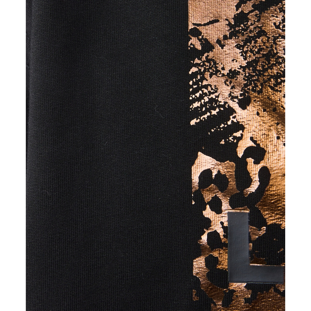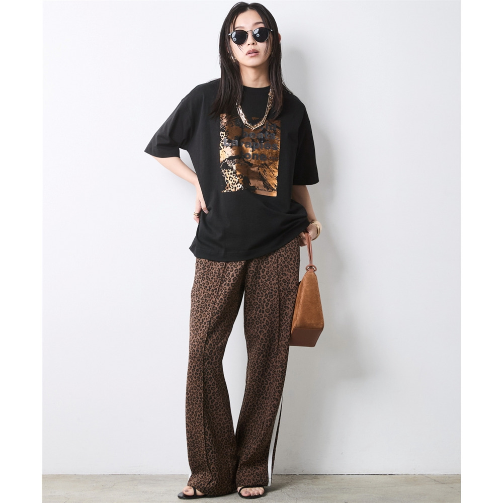 Modern Texture Mix:ブラックの箔プリントTに、あえてレオパード柄のパンツやサーマルスカートを合わせる、素材感を楽しむ着こなし。