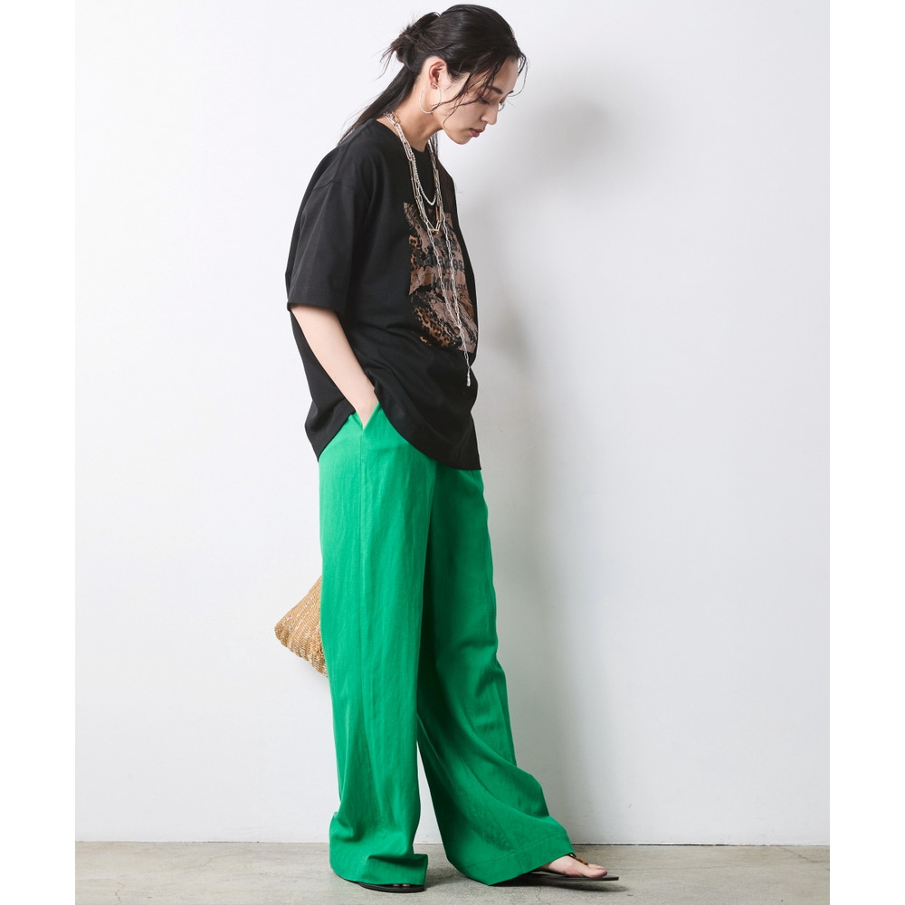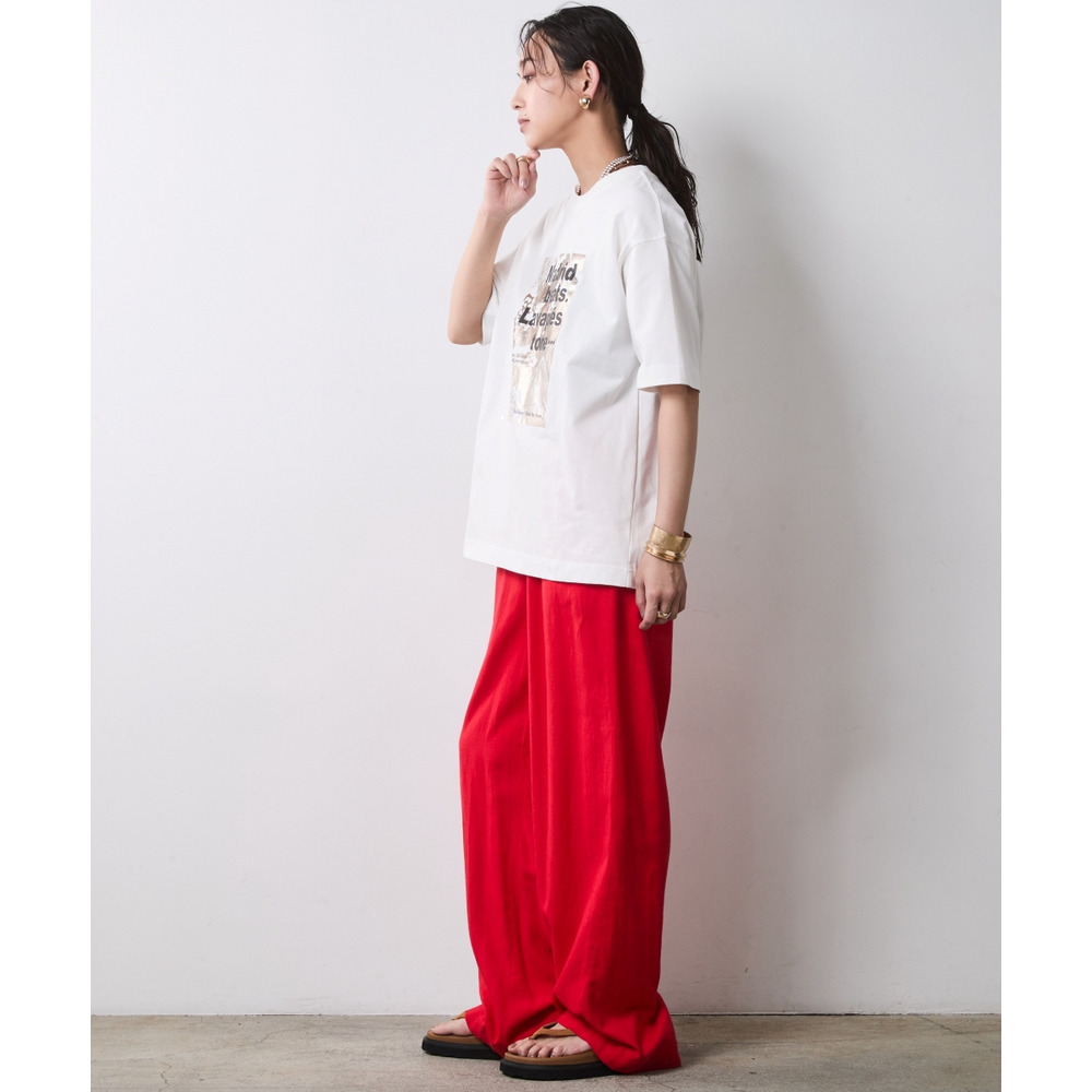 Vibrant Color-Play:ホワイトやブラックのTシャツに、鮮やかなレッドやグリーンのワイドパンツを合わせた、エネルギー溢れる都会派スタイル。