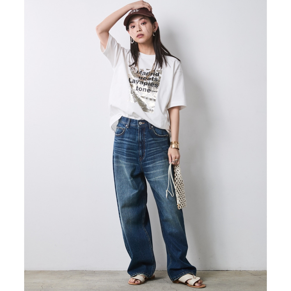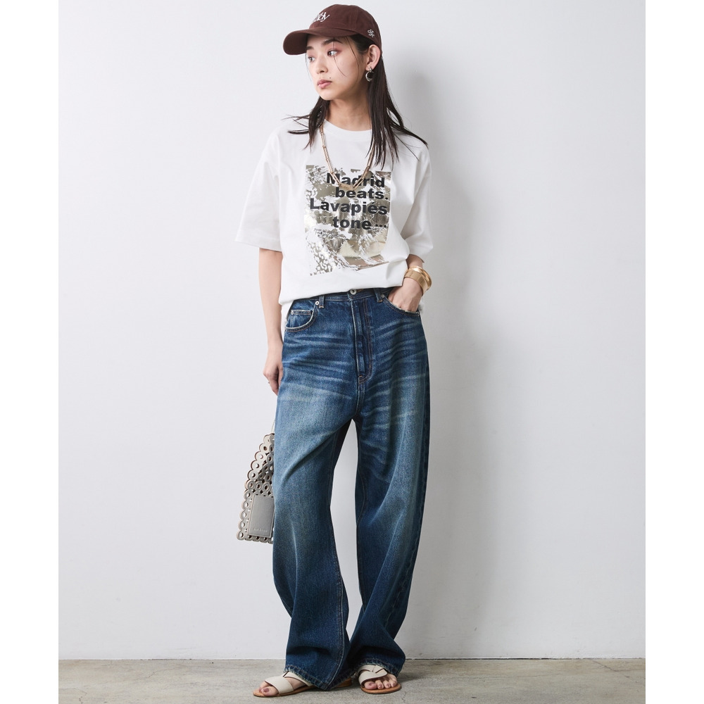 Denim & Silver Fusion:シルバー箔のホワイトTシャツを、ライトブルーのワイドデニムでクリーンにまとめるスタイル。