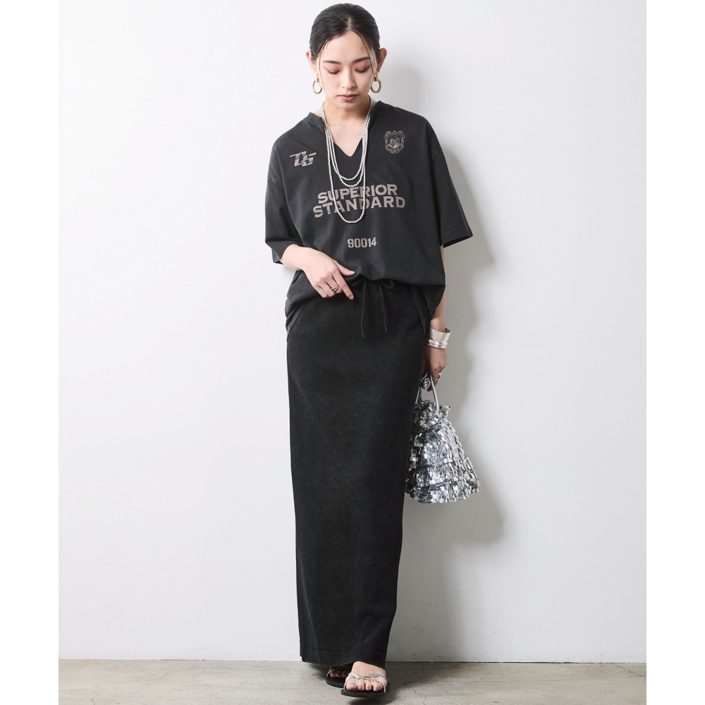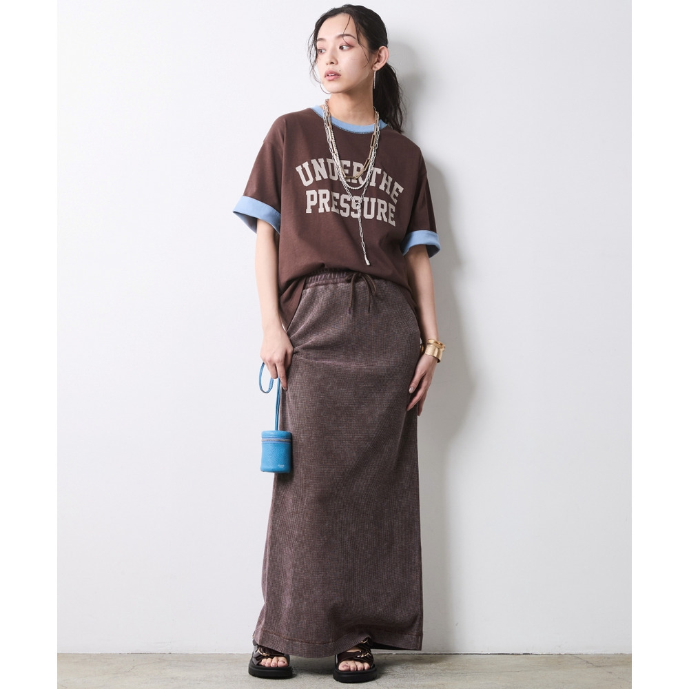 カレッジロゴやグラフィックTとも相性が良く、スカートのタイトなシルエットがカジュアルさを程よく中和してくれます。
