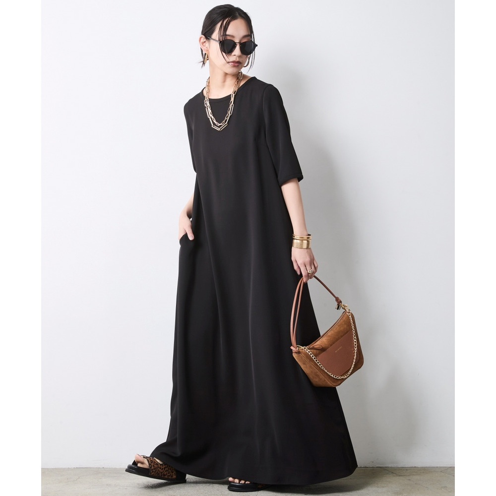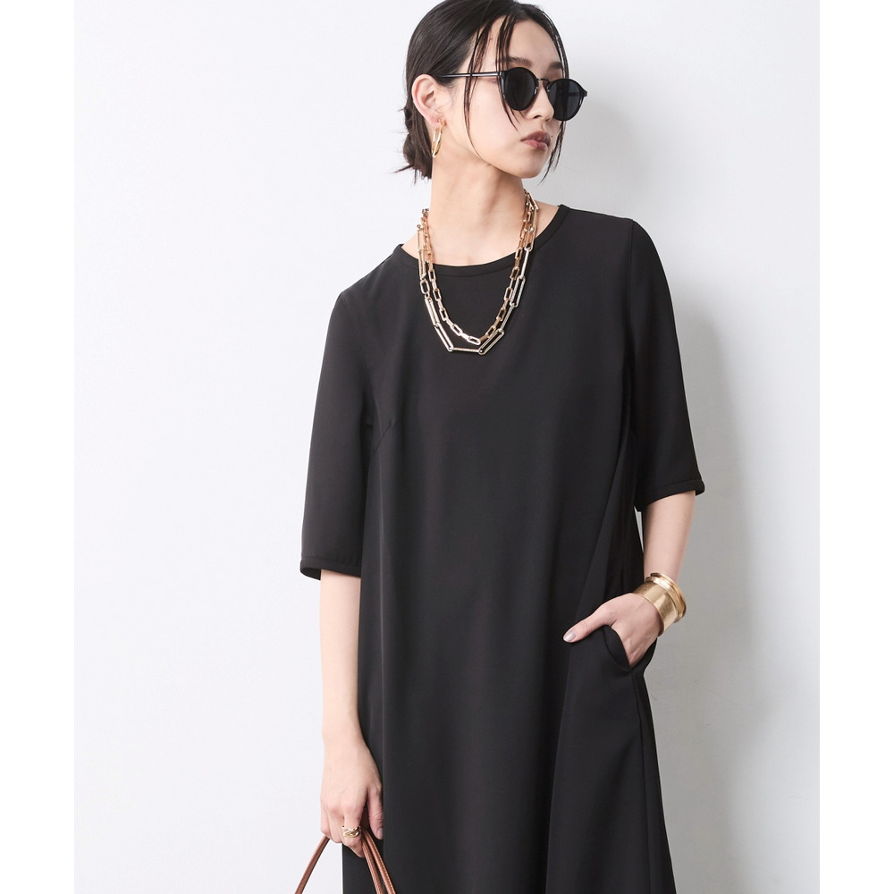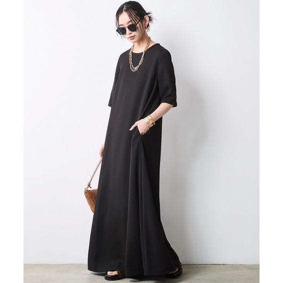 Sophisticated Noir Edit:ブラックのワンピースを主役に、ゴールドのチェーンネックレスを効かせたモードな着こなし。