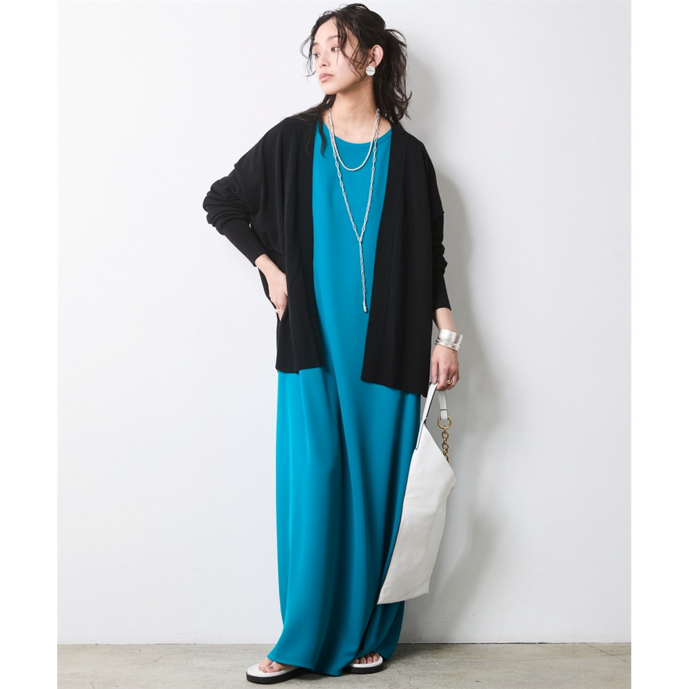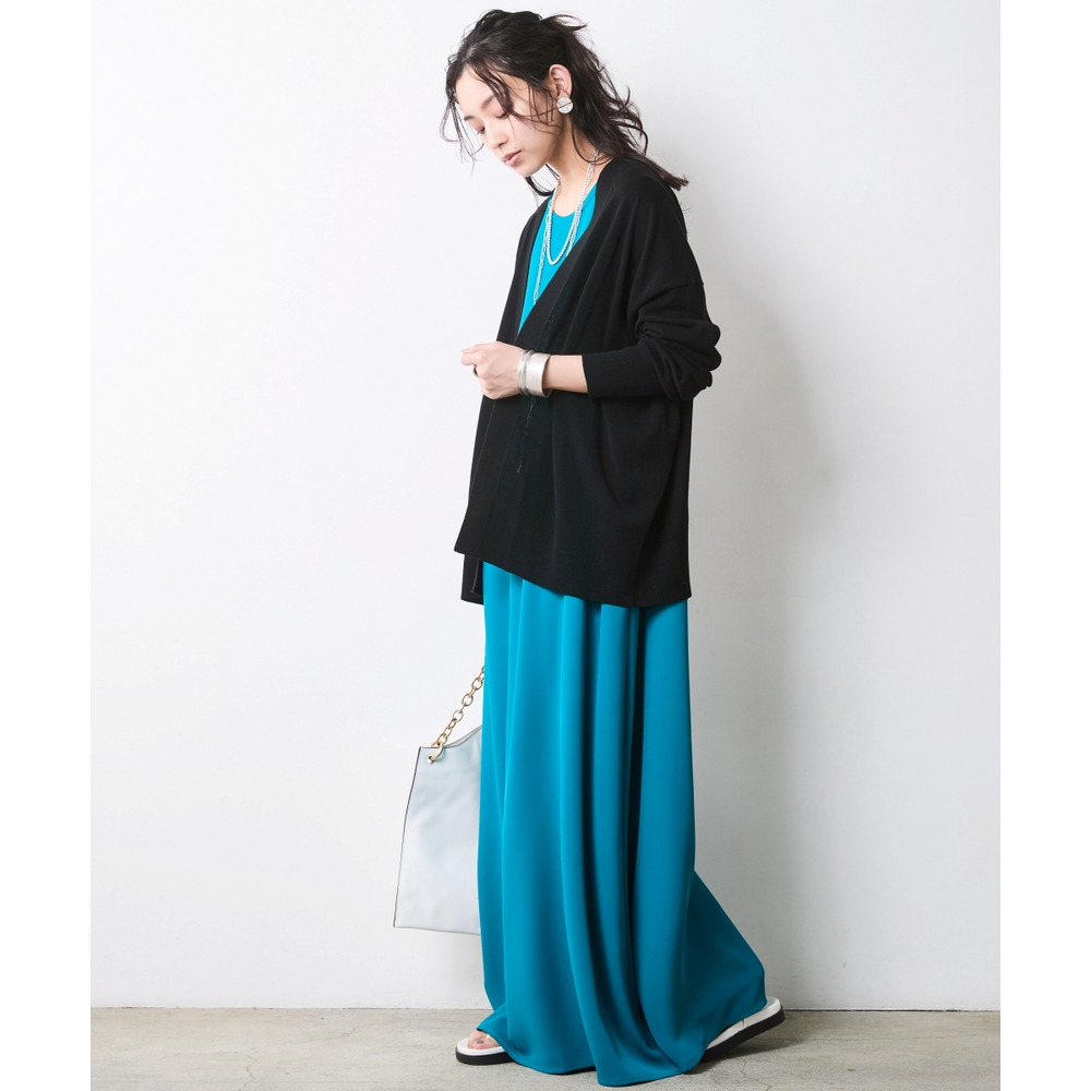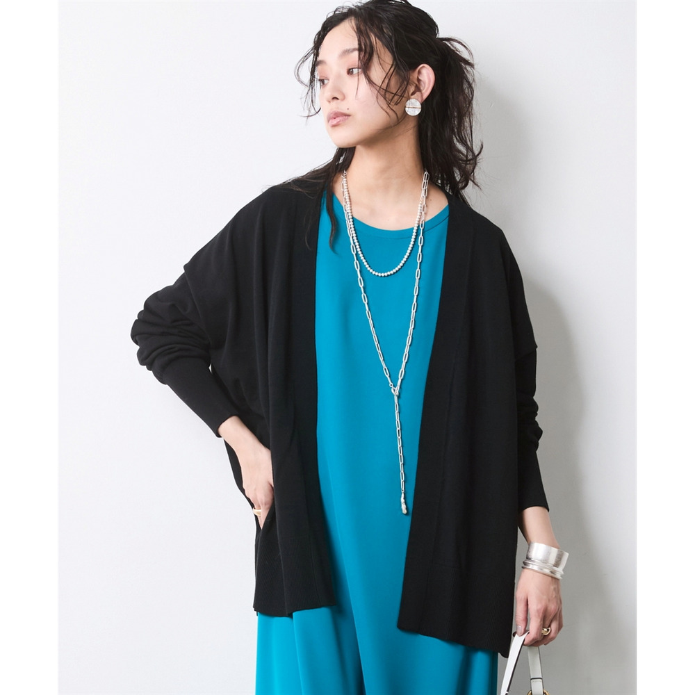 ターコイズブルーにはブラックのカーデでシックに、ブラックにはグレーのカーデで知的なニュアンスをプラス。