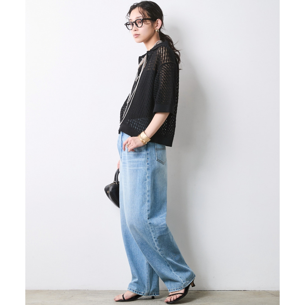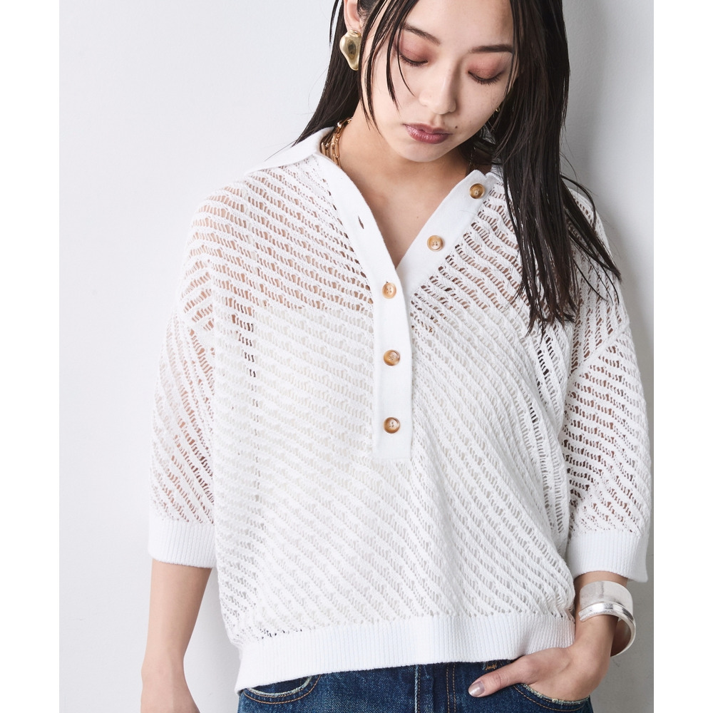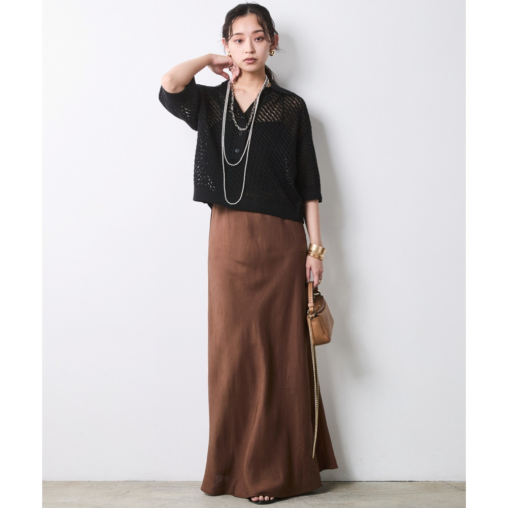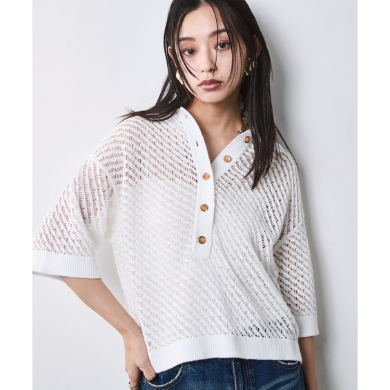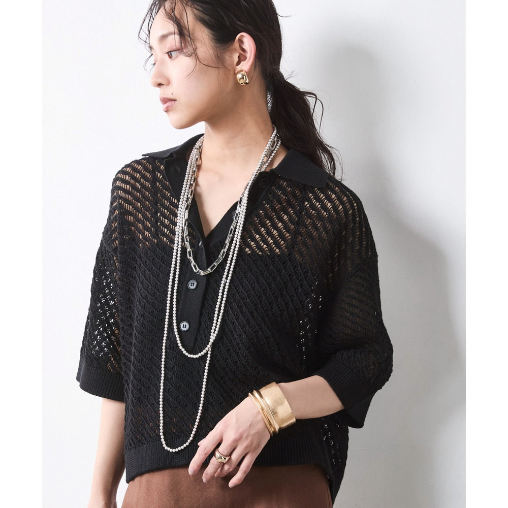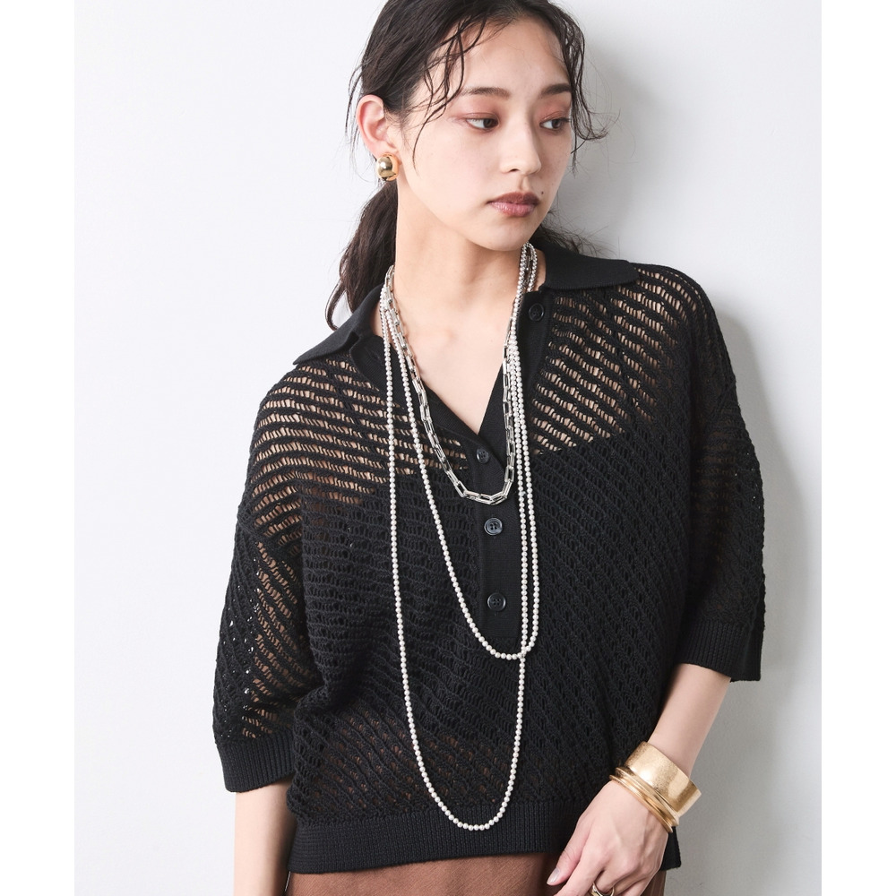 肌がほのかに透けることで、ニット特有の重さを感じさせず、涼やかでモードな印象を与えます。