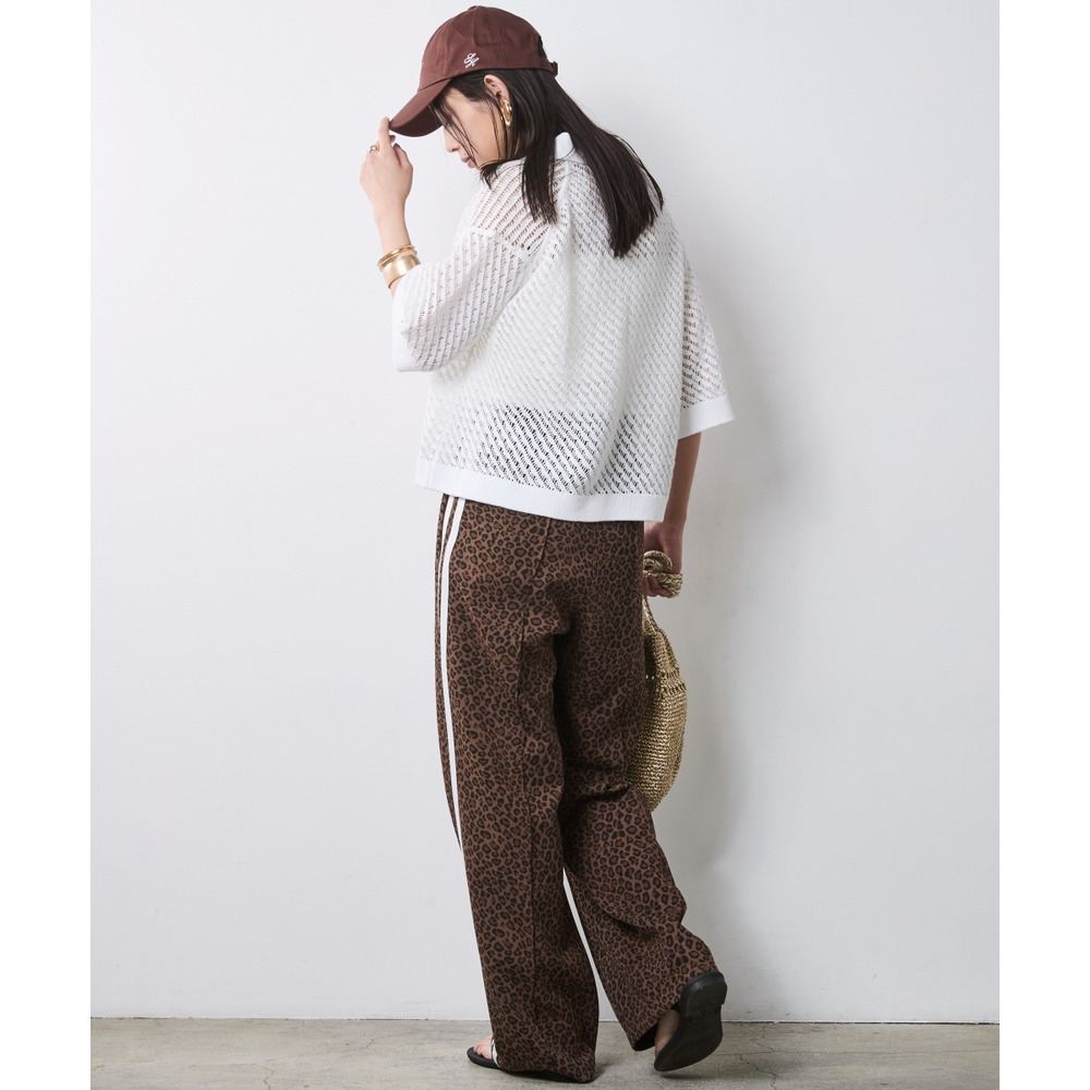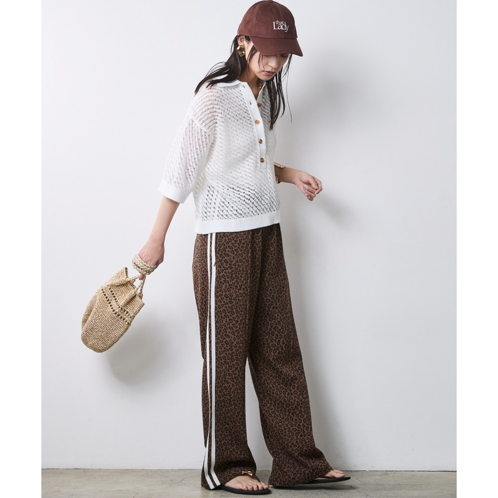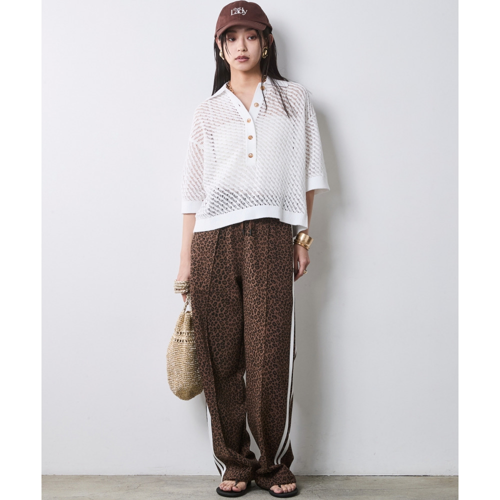 Spicy Safari Mix:ホワイトのポロニットをレオパード柄のサイドラインパンツに合わせた、エッジの効いた休日コーディネート。