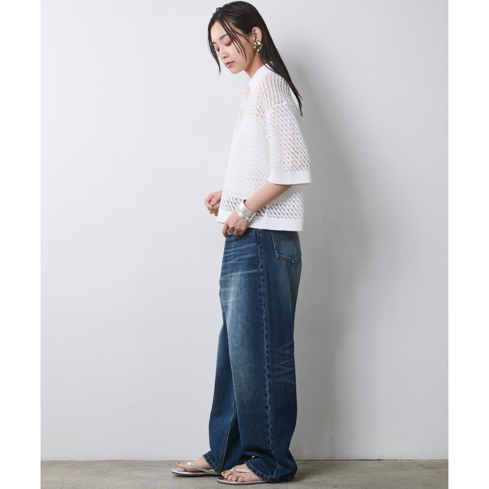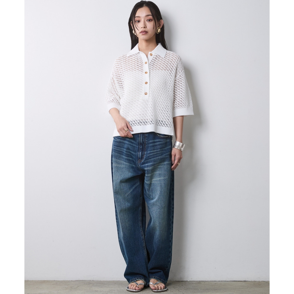 Modern Denim-on-Knit:ホワイトのポロニットにルーズなワイドデニムを合わせた、究極の「こなれ」カジュアル。