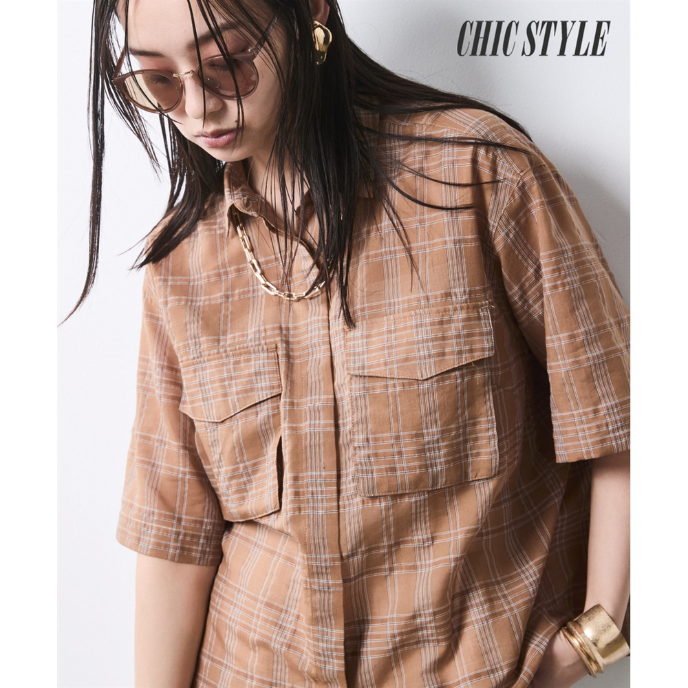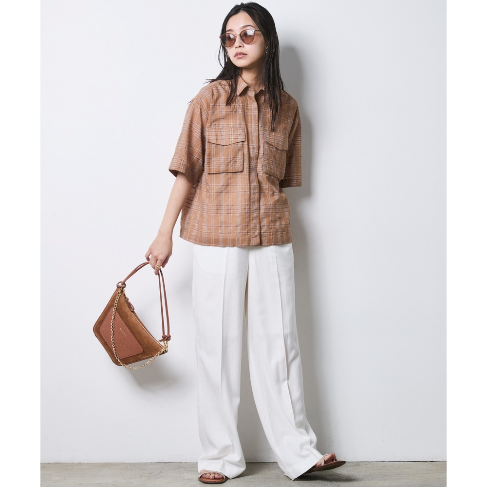 Urban Safari:モカ系チェックのブラウスをブラウンのワイドパンツに合わせた、都会的なサファイスタイル。