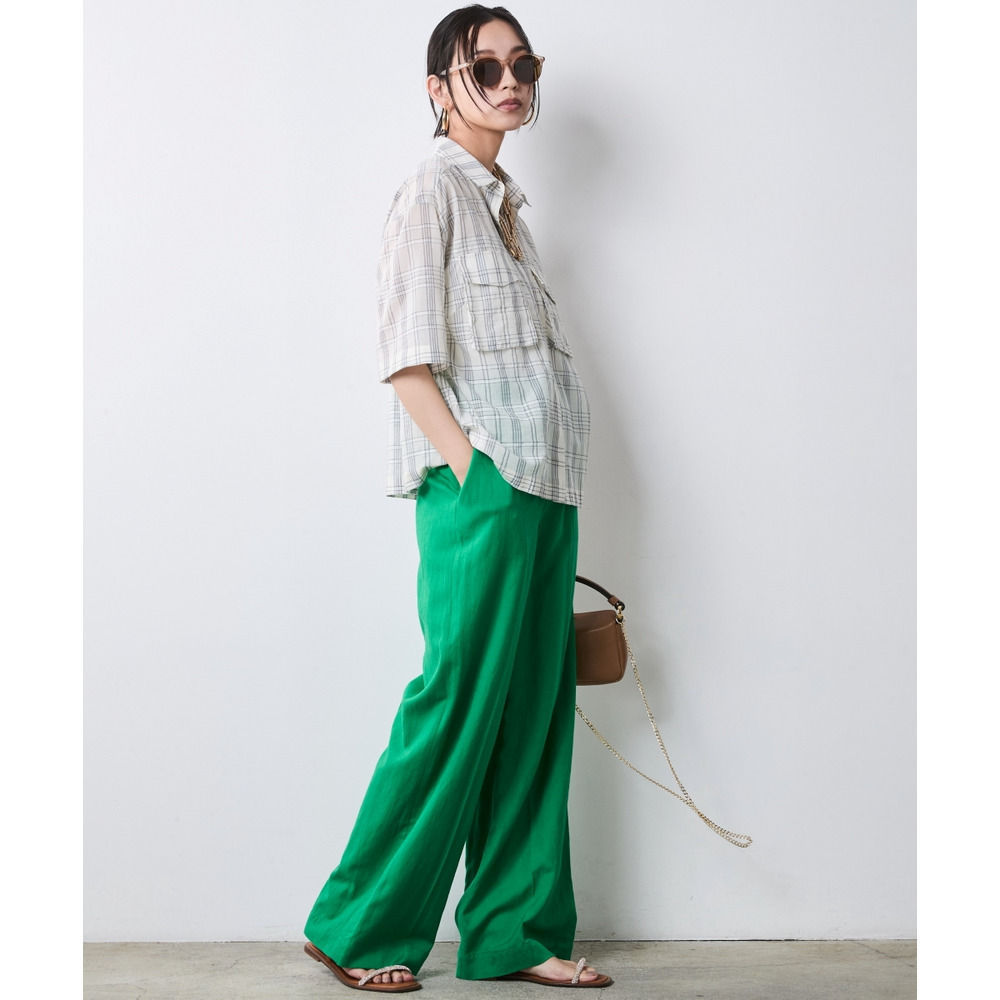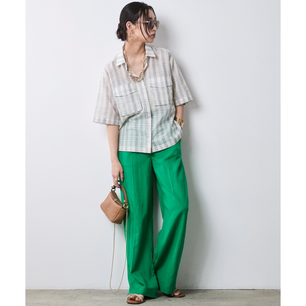Color Fusion:オフホワイト系チェックのブラウスを鮮やかなグリーンのワイドパンツで華やかに。