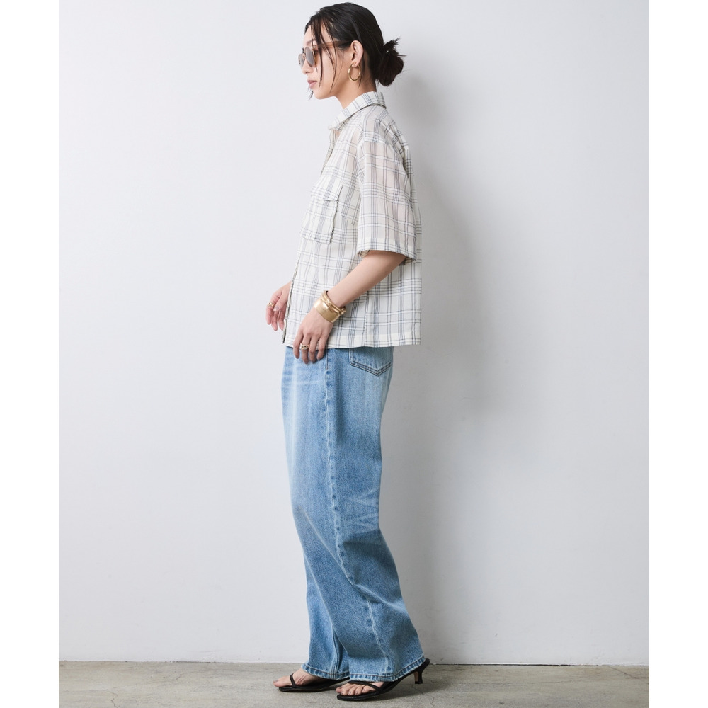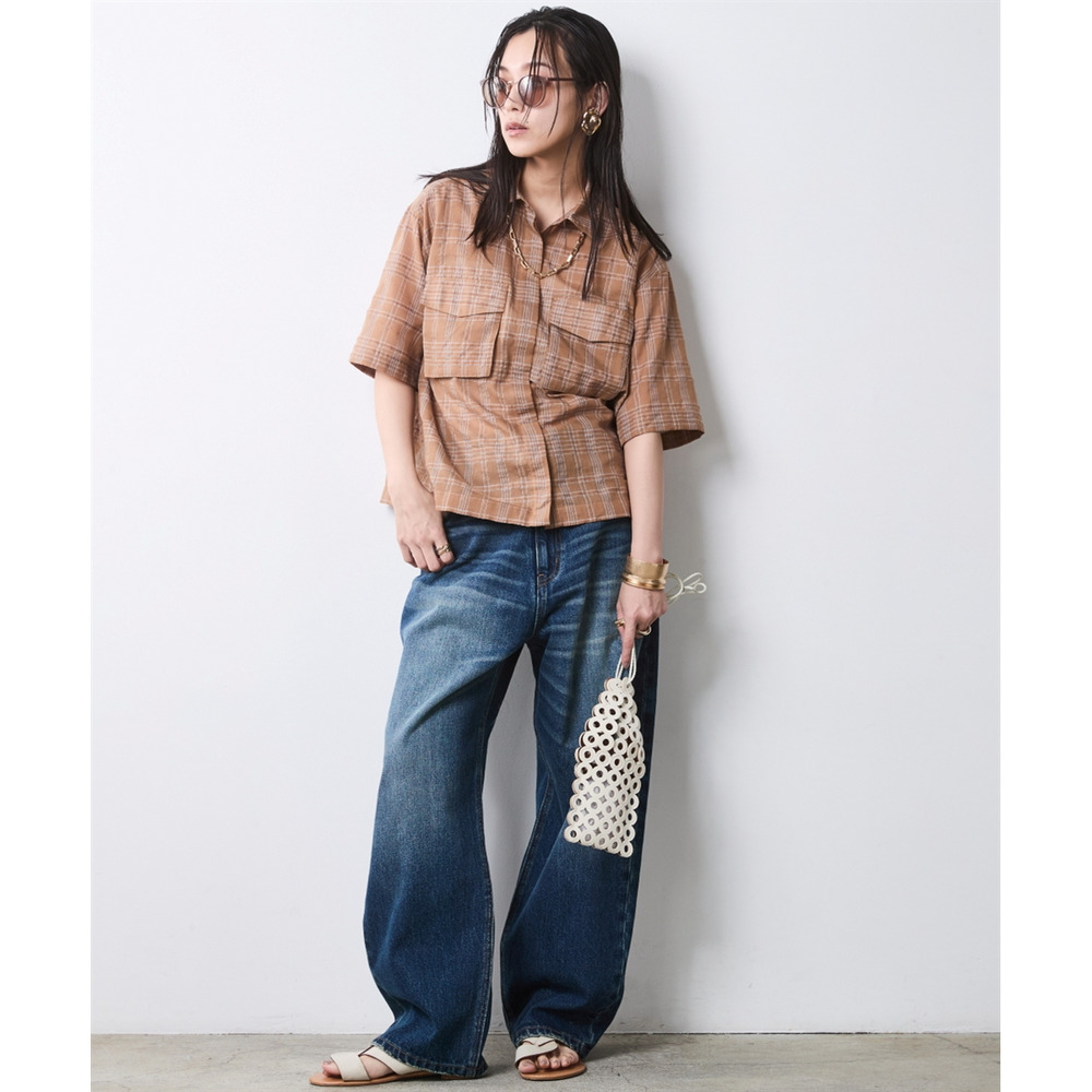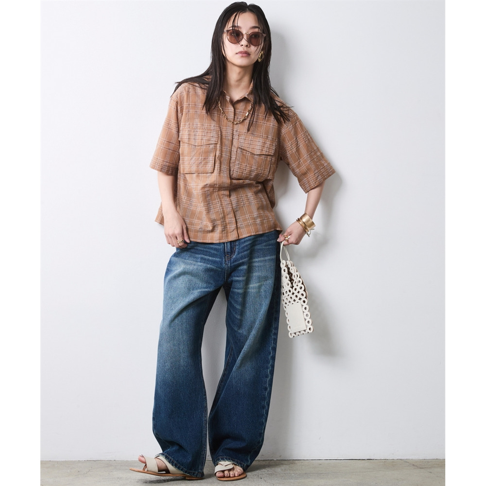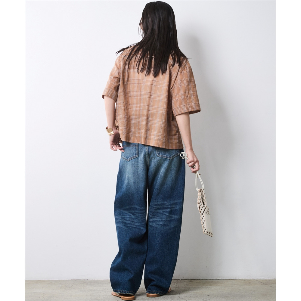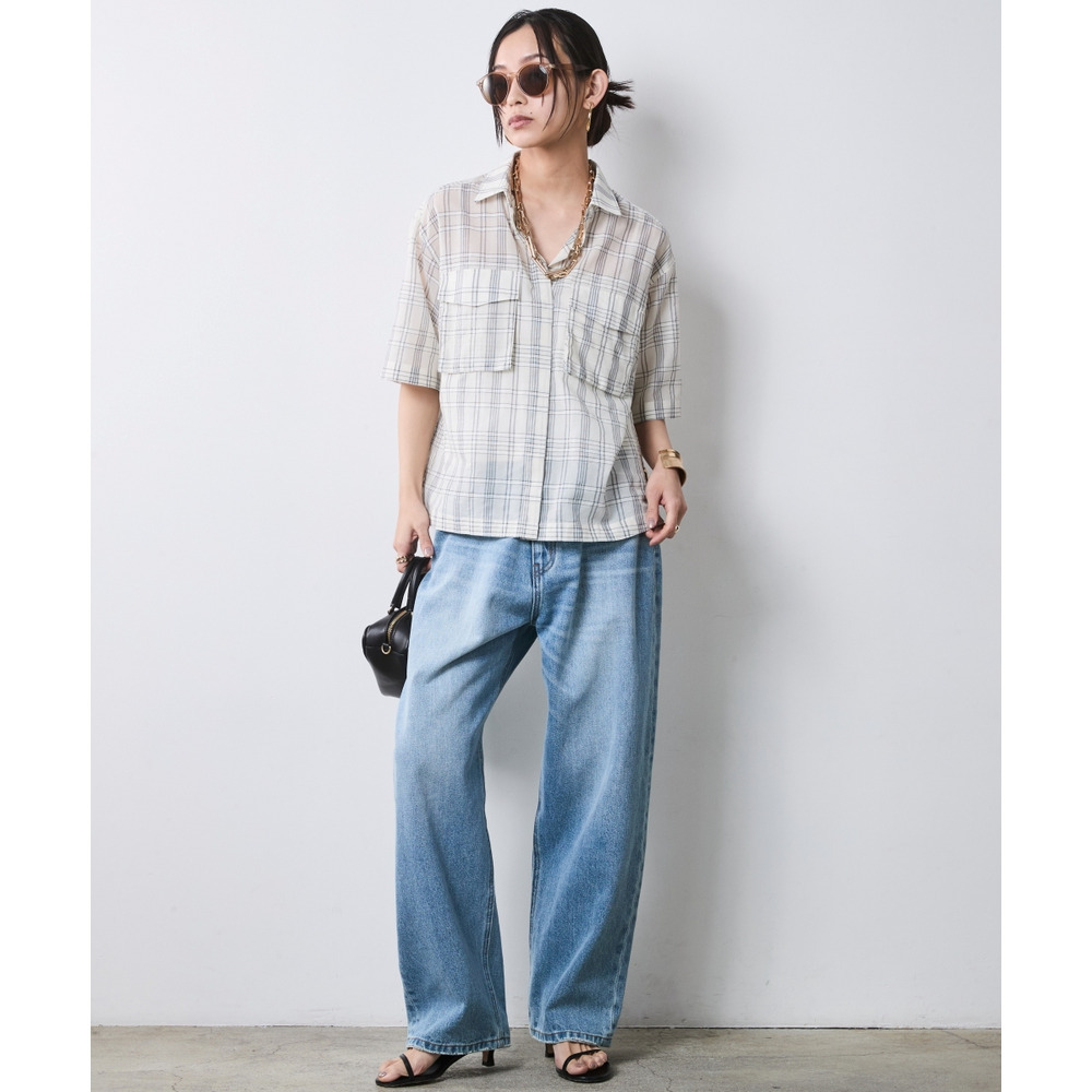 Feminine Check:モカ系チェックのブラウスをライトブルーのワイドデニムでカジュアルに。