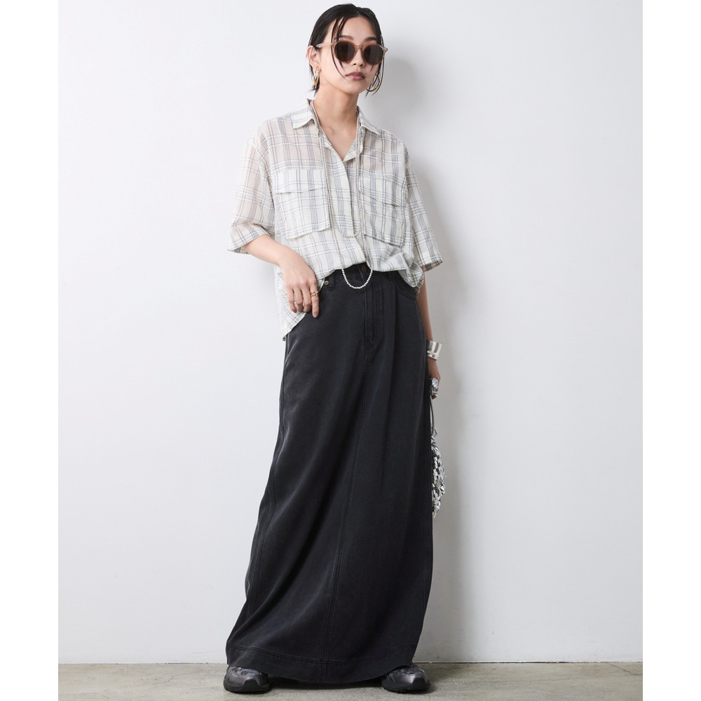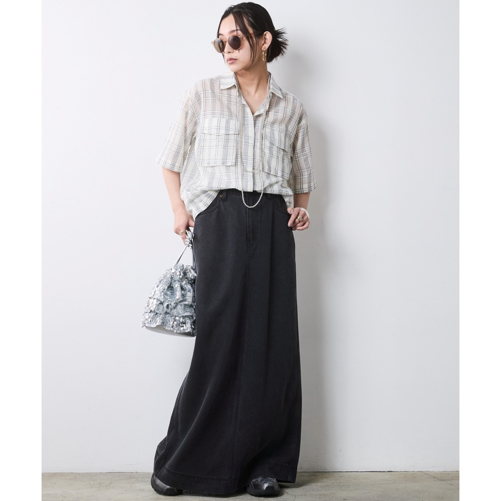 Modern Monochrome:オフホワイト系チェックのブラウスをブラックデニムのマキシスカートでシックに。