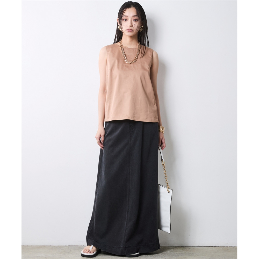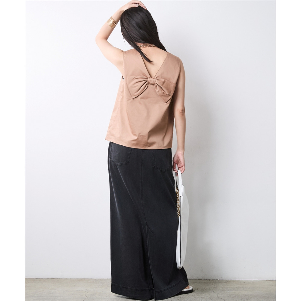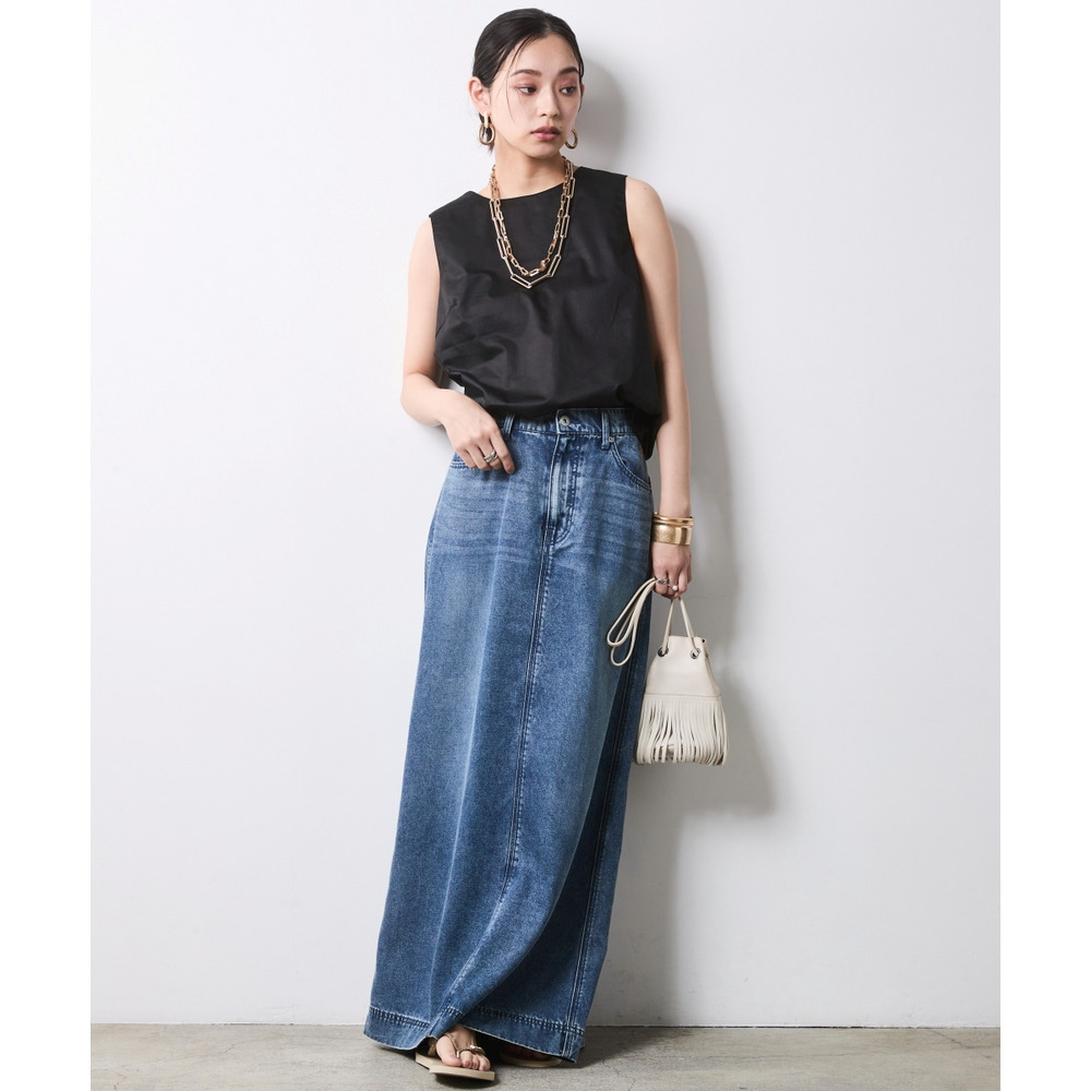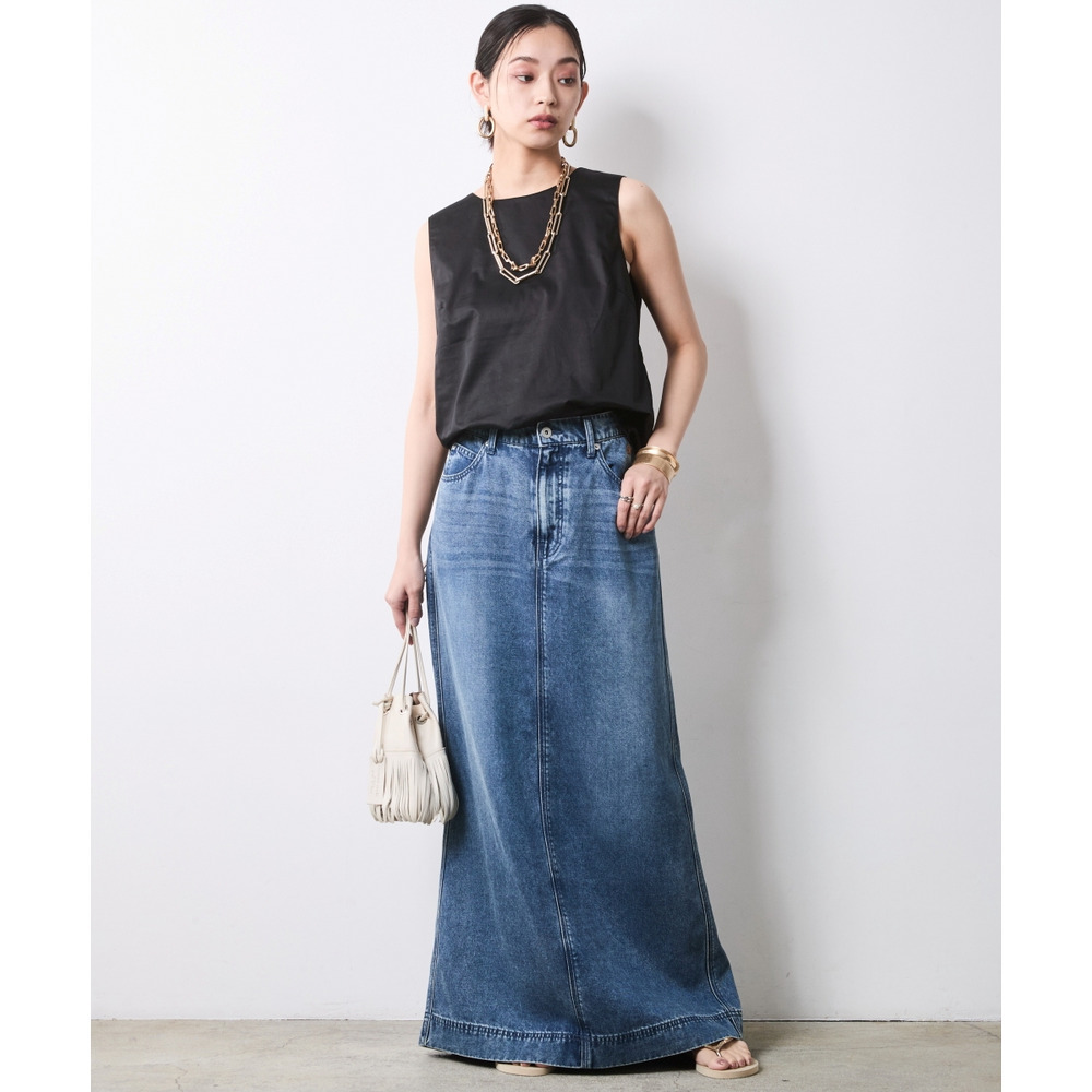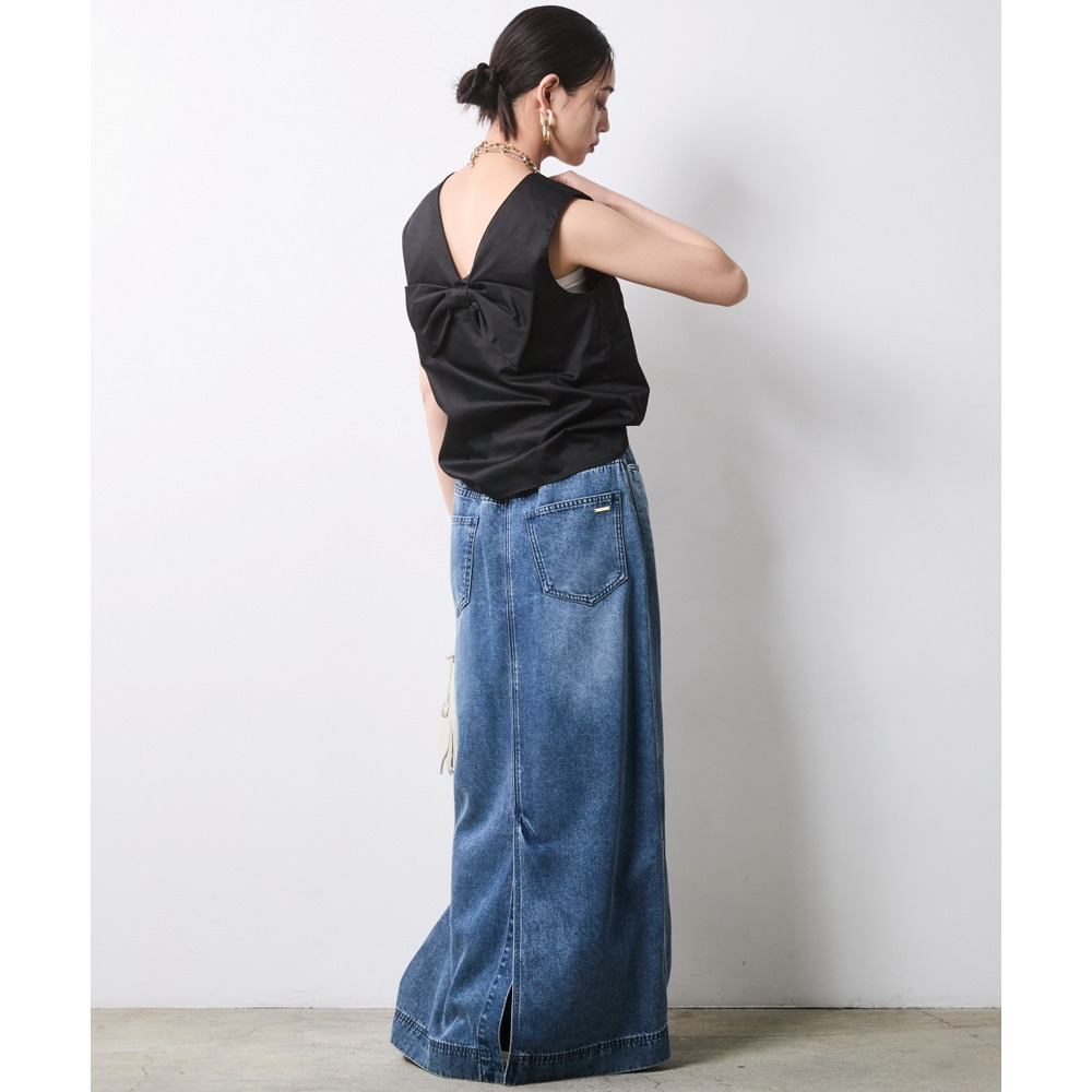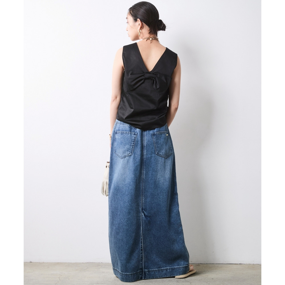 Back-Conscious Urban Edge:デニムロングスカートにブラックを合わせ、バックスタイルを主役にしたモードな着こなし。