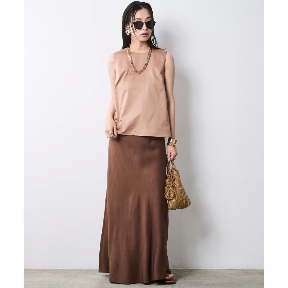 Chic Earth-Tone Minimalism:モカベージュのブラウスと同系色のブラウンロングスカートを合わせた、洗練のワントーンコーデ。