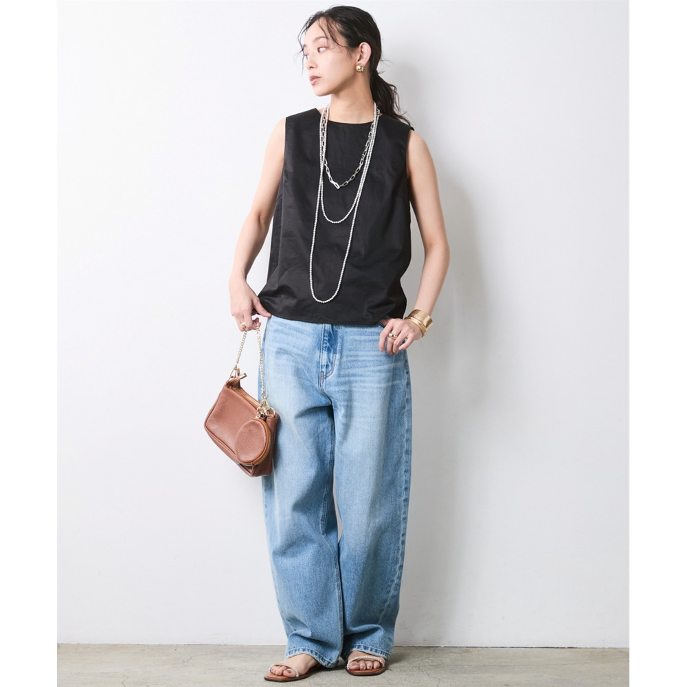 Denim-on-Pearl Elegance:ブラックのブラウスに、あえてラフなワイドデニムを合わせた大人のミックススタイル。