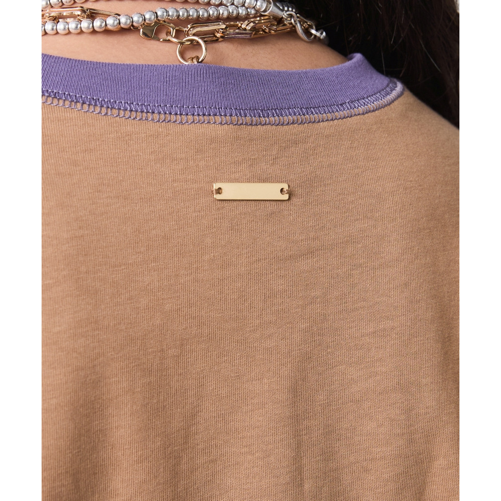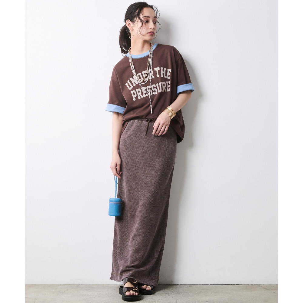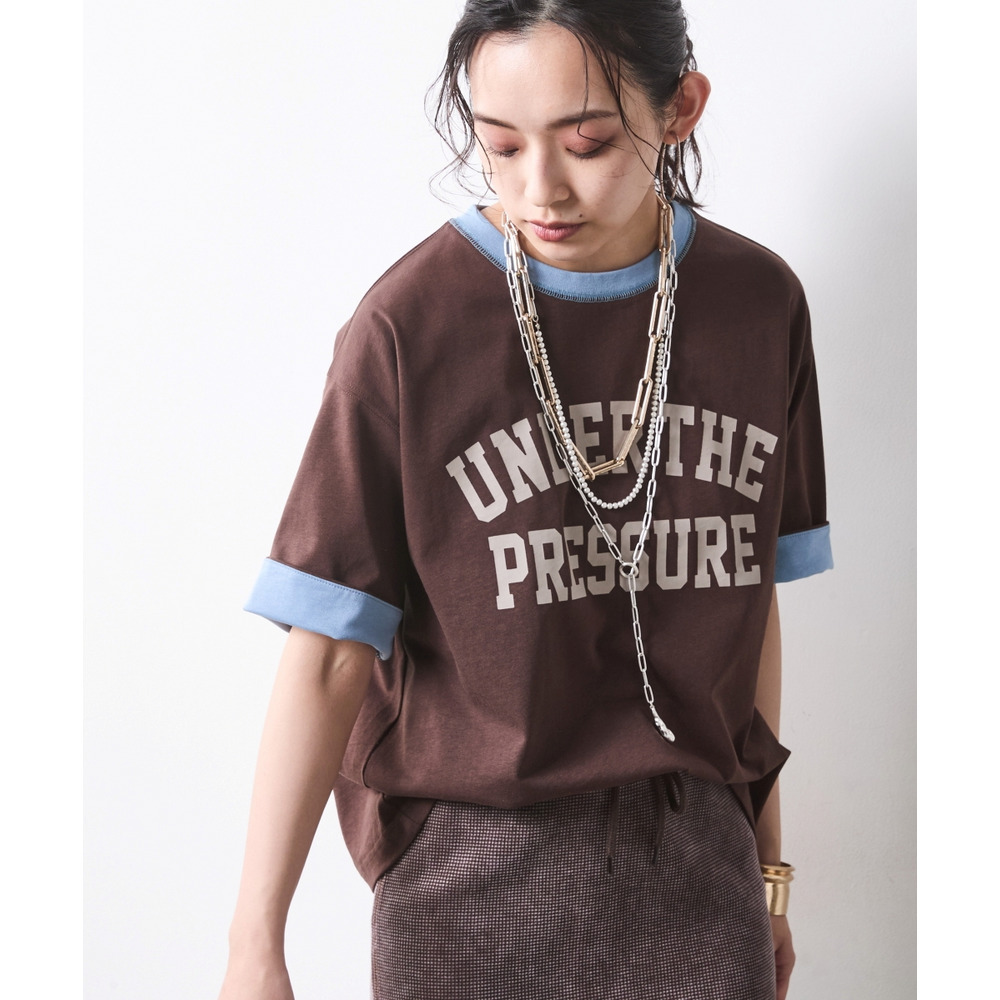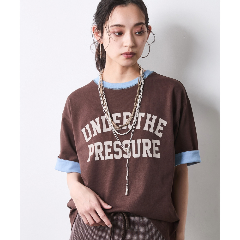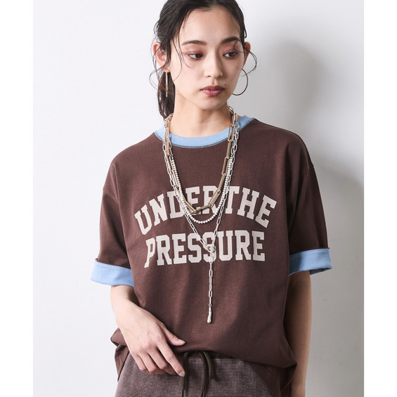多連ネックレスを添えることで、ヴィンテージ風のTシャツに女性らしいクラス感をプラス。