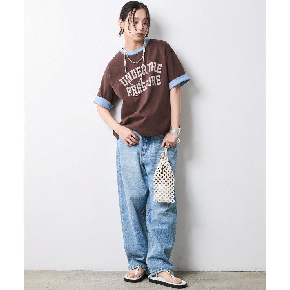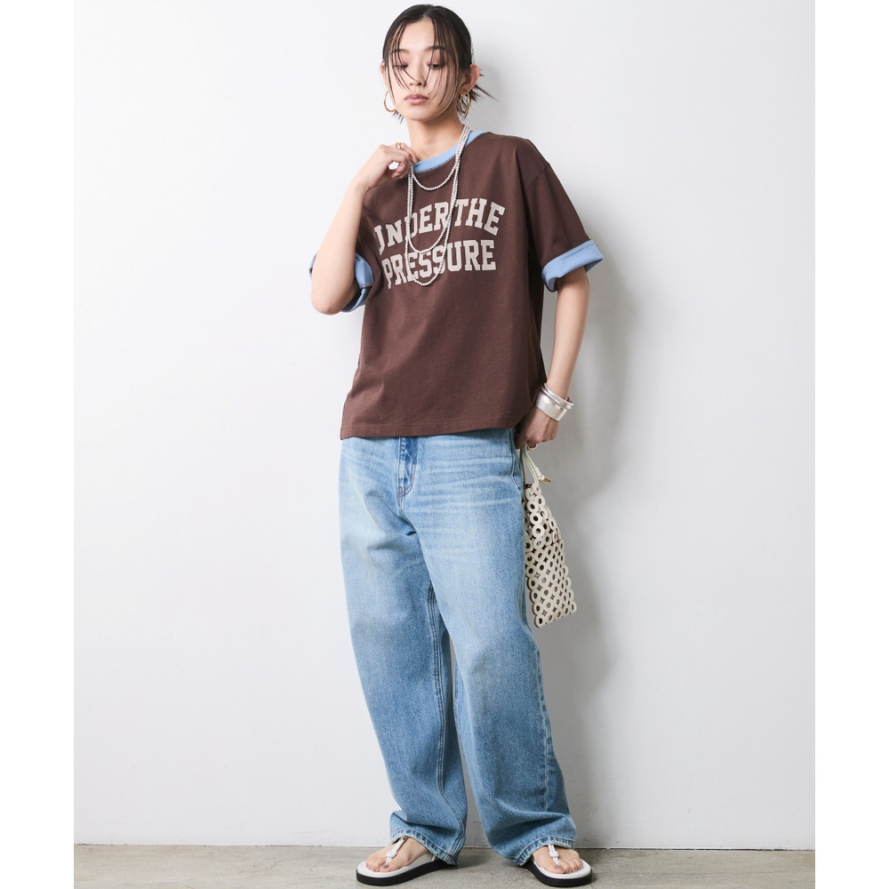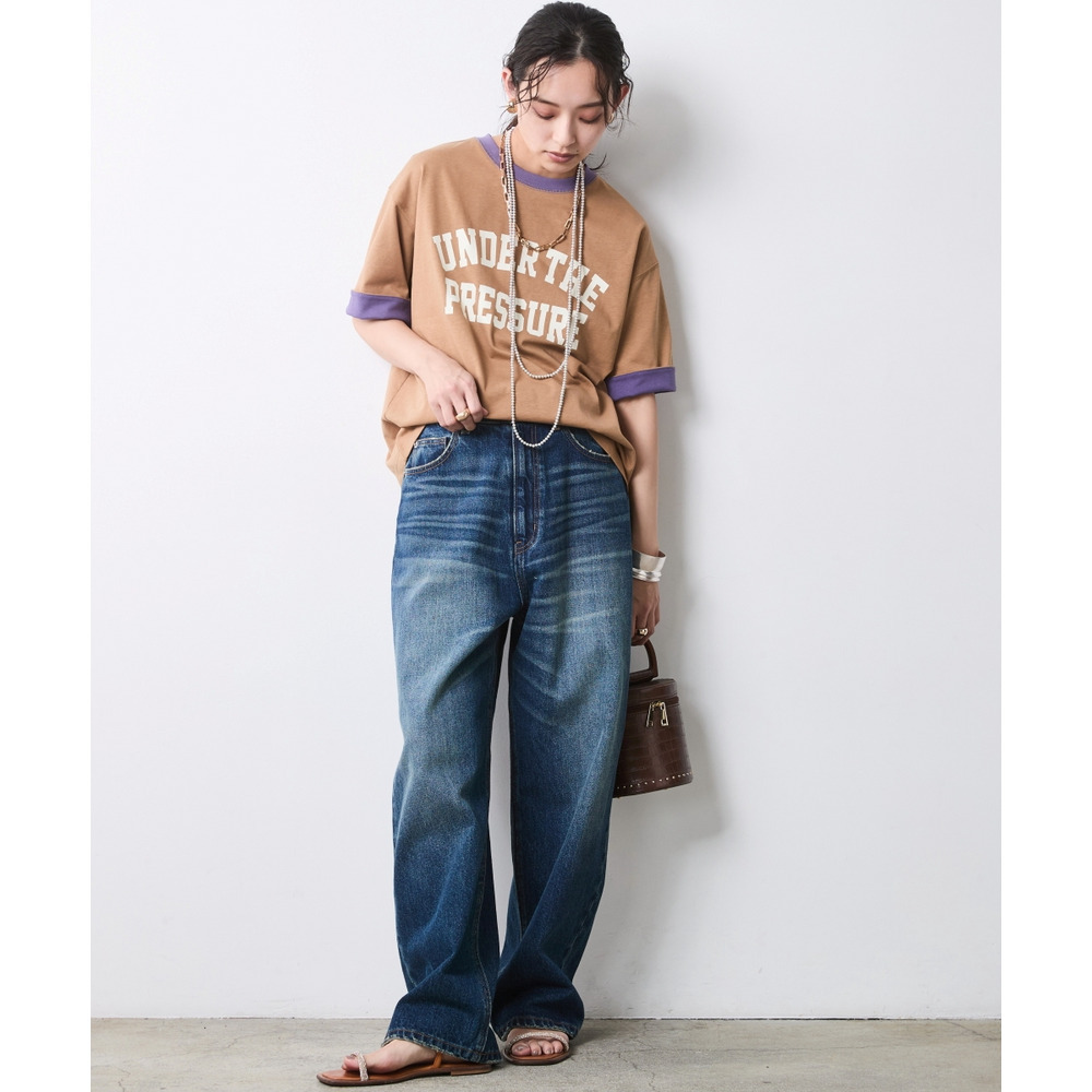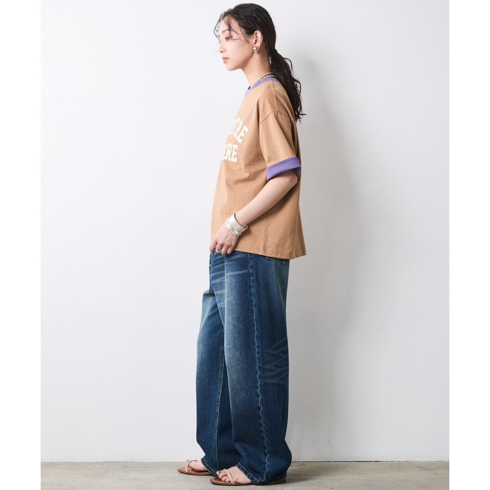 モカのTシャツに、あえてルーズなワイドデニムを合わせた王道カジュアル。