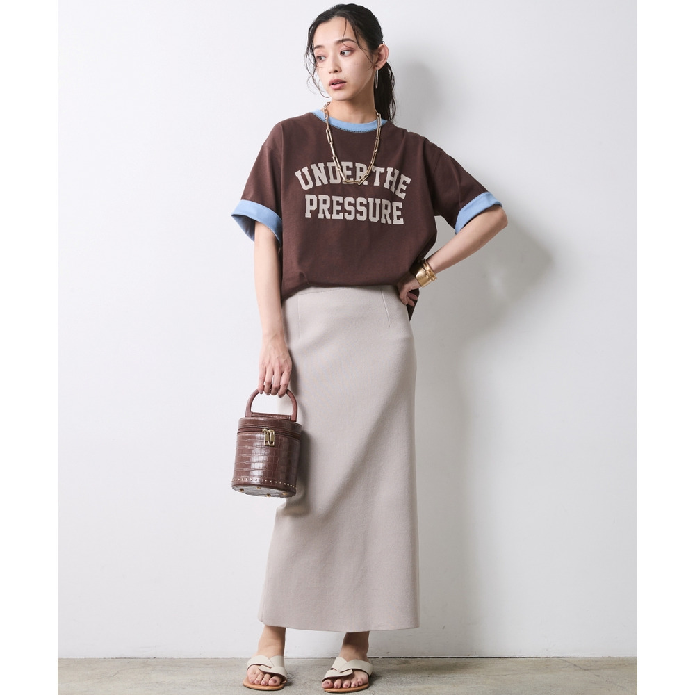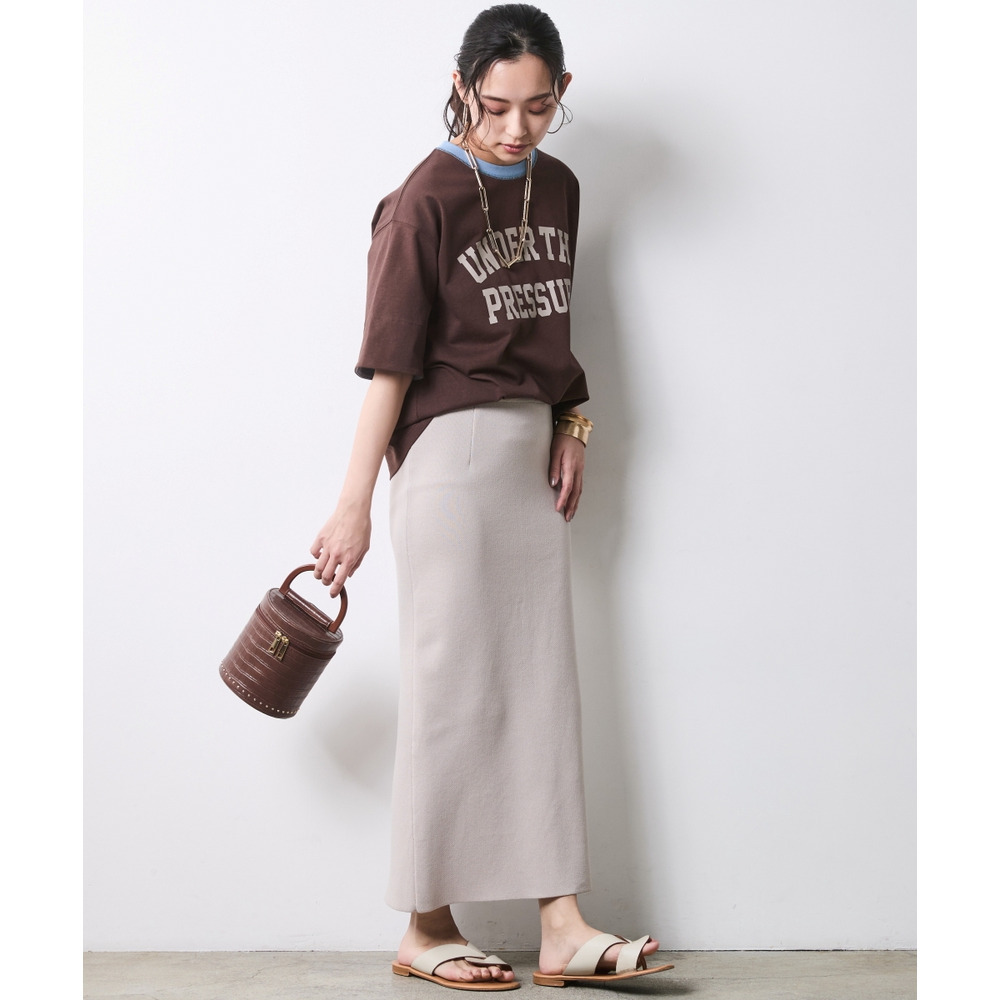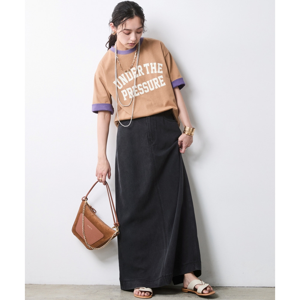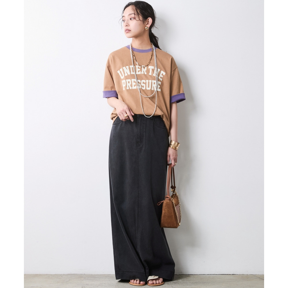 Tシャツをフロントインすることで腰位置を高く見せ、カジュアルなロゴTを「きれいめ」へと昇華させます。