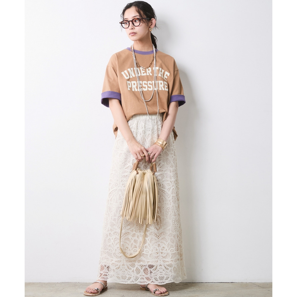 キャメルのTシャツを、繊細なホワイトの総レーススカートでハズしたミックススタイル。