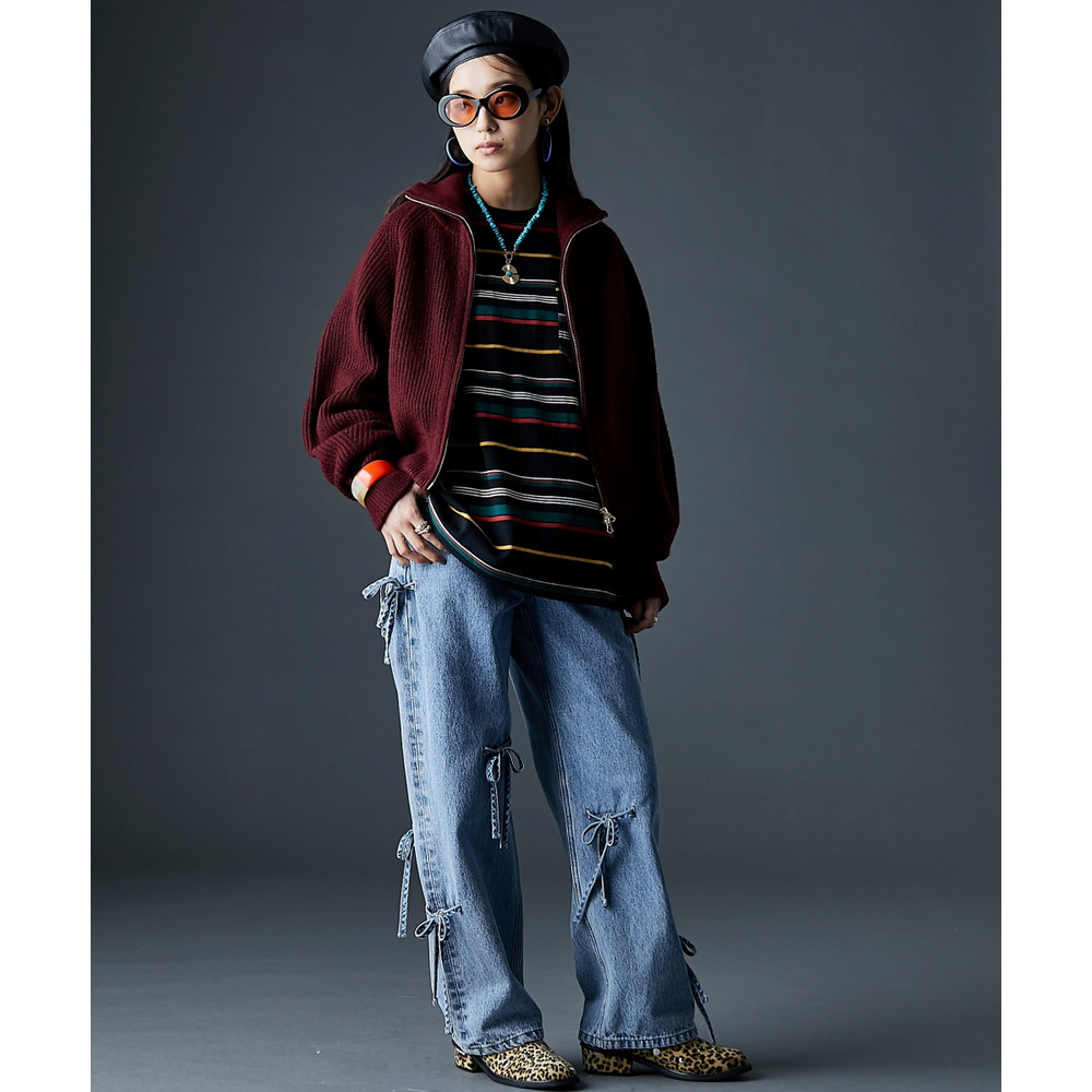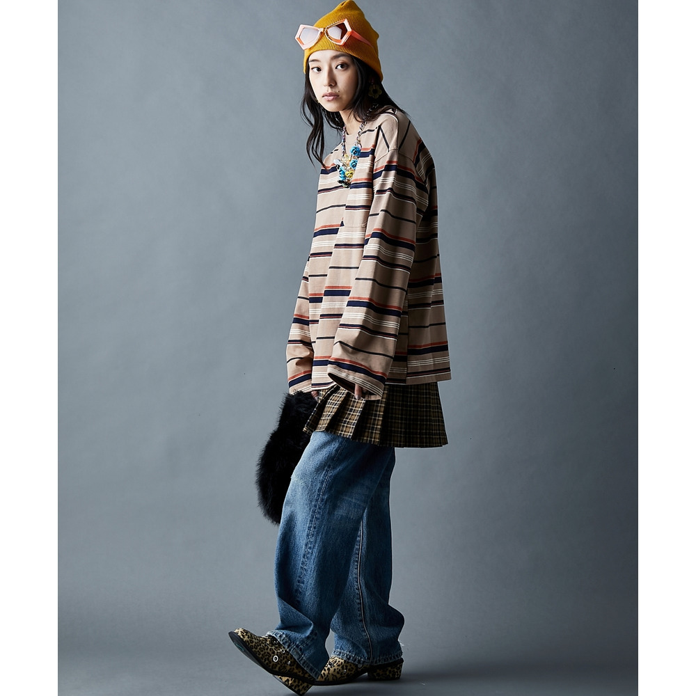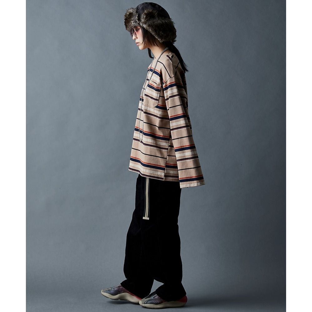 首元はクルーネックのゆったりとしたシルエットで、袖口が広くリラックス感のあるサイジングです。