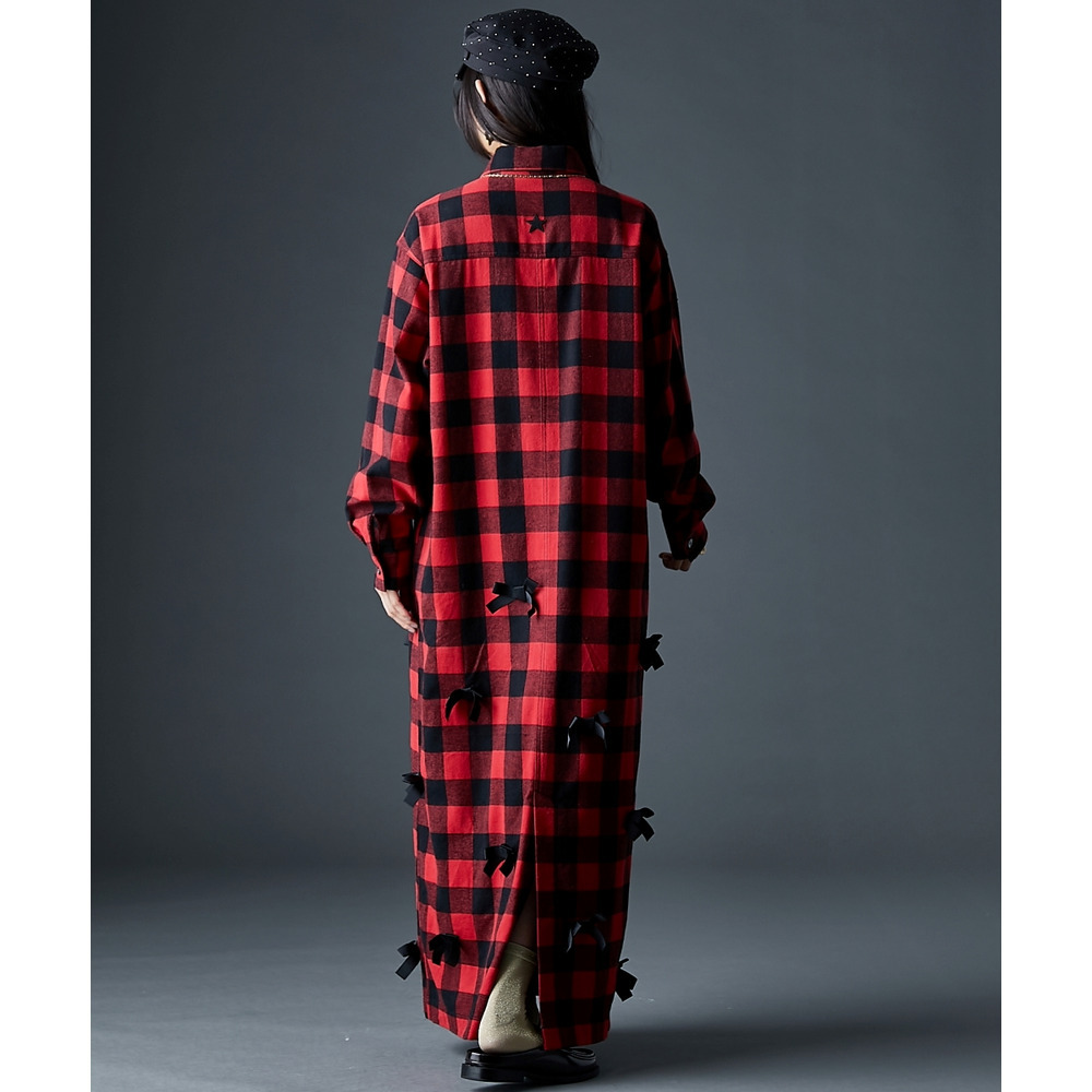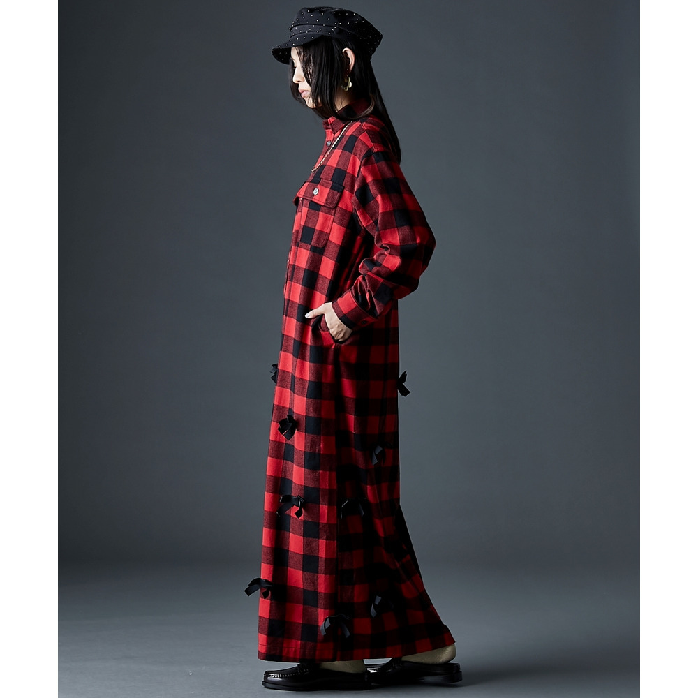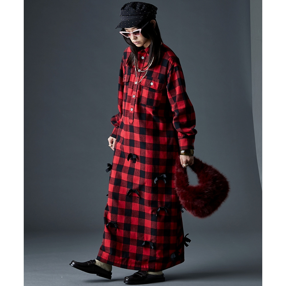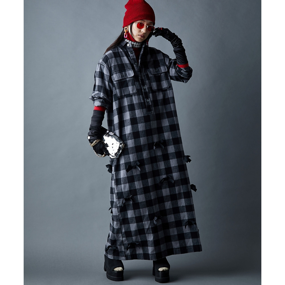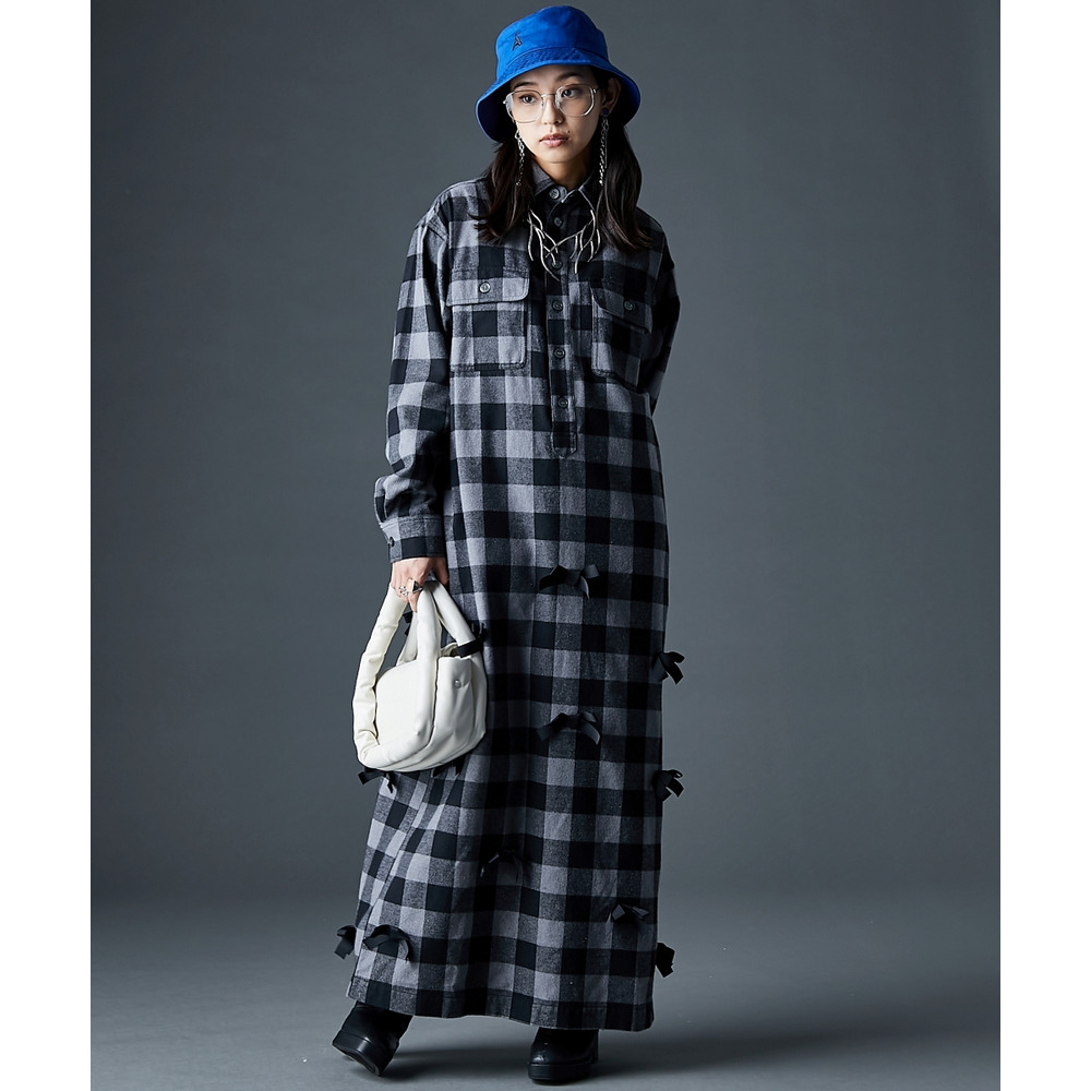 リボン付ブロックチェックシャツマキシワンピース 大きいサイズ GEVS.