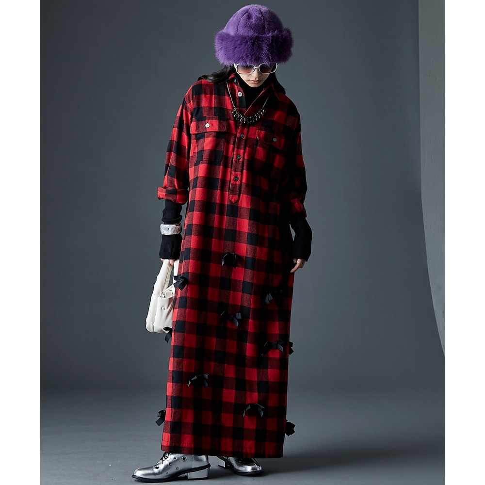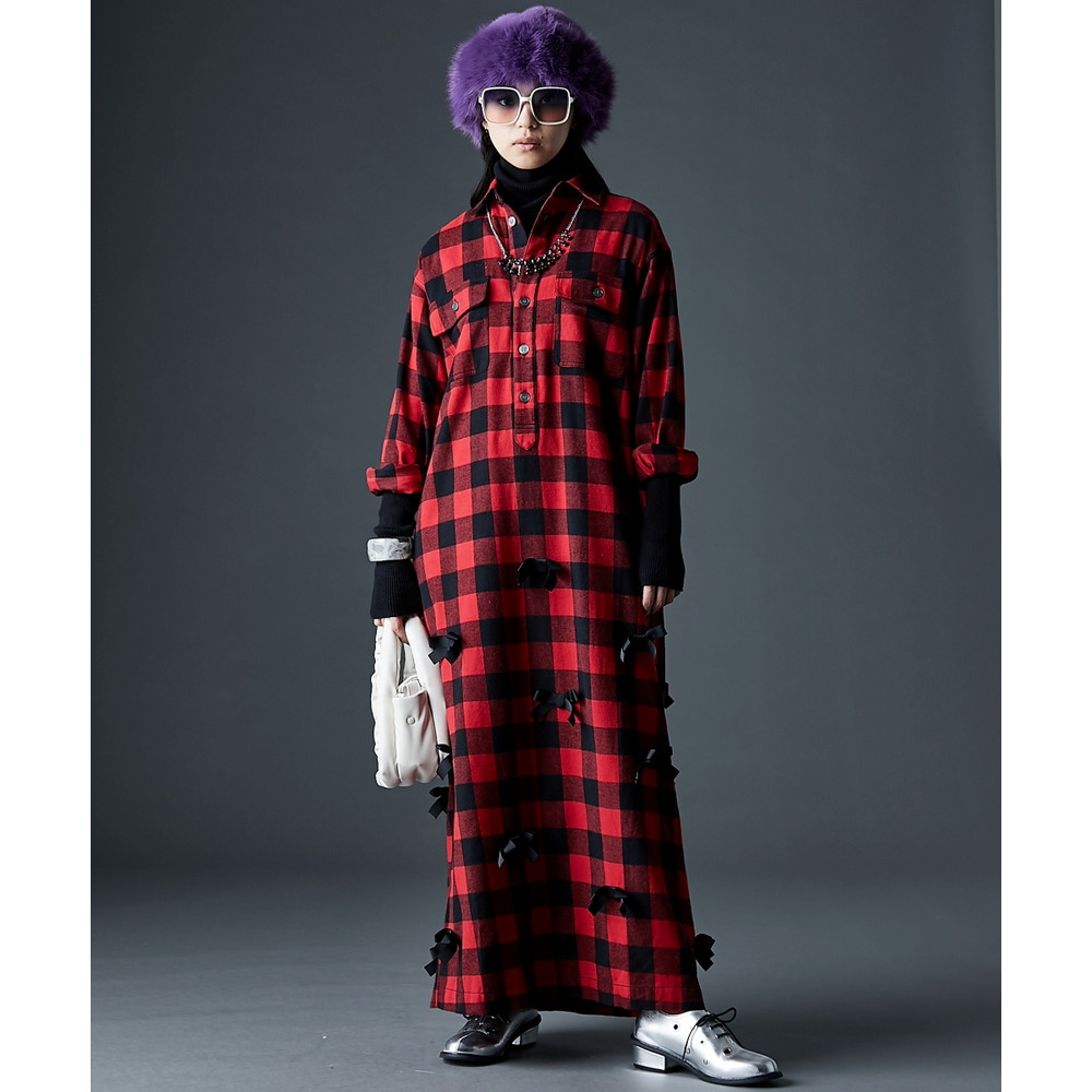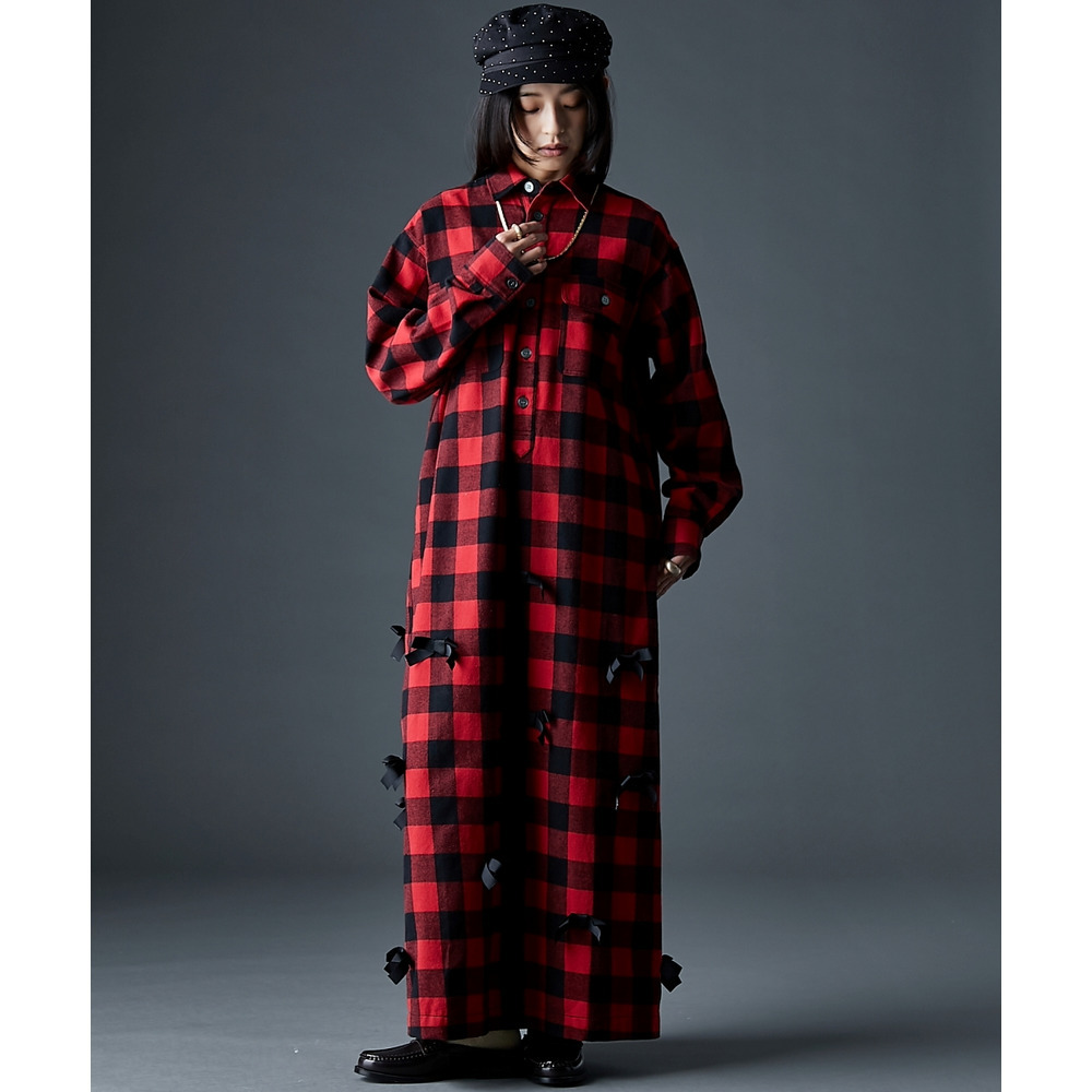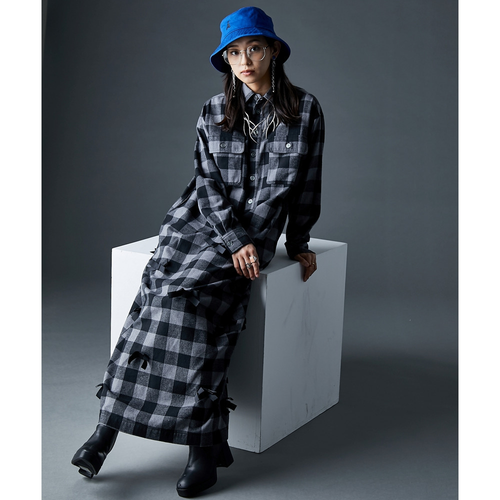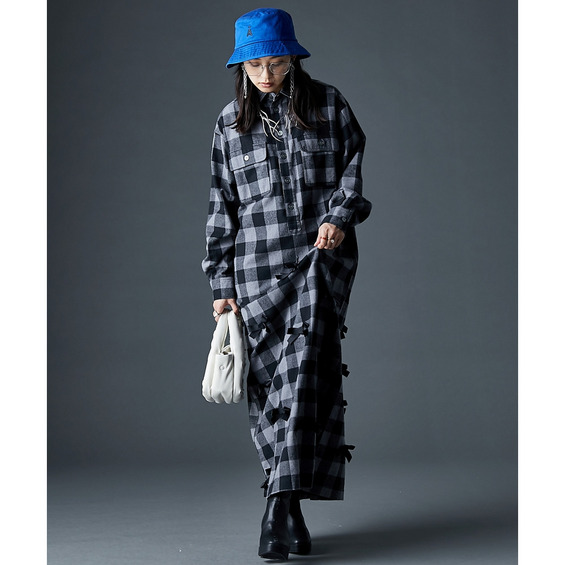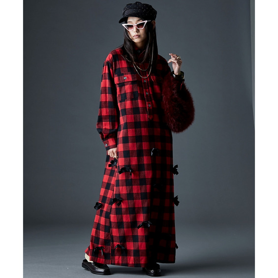 リボン付ブロックチェックシャツマキシワンピース 大きいサイズ GEVS.