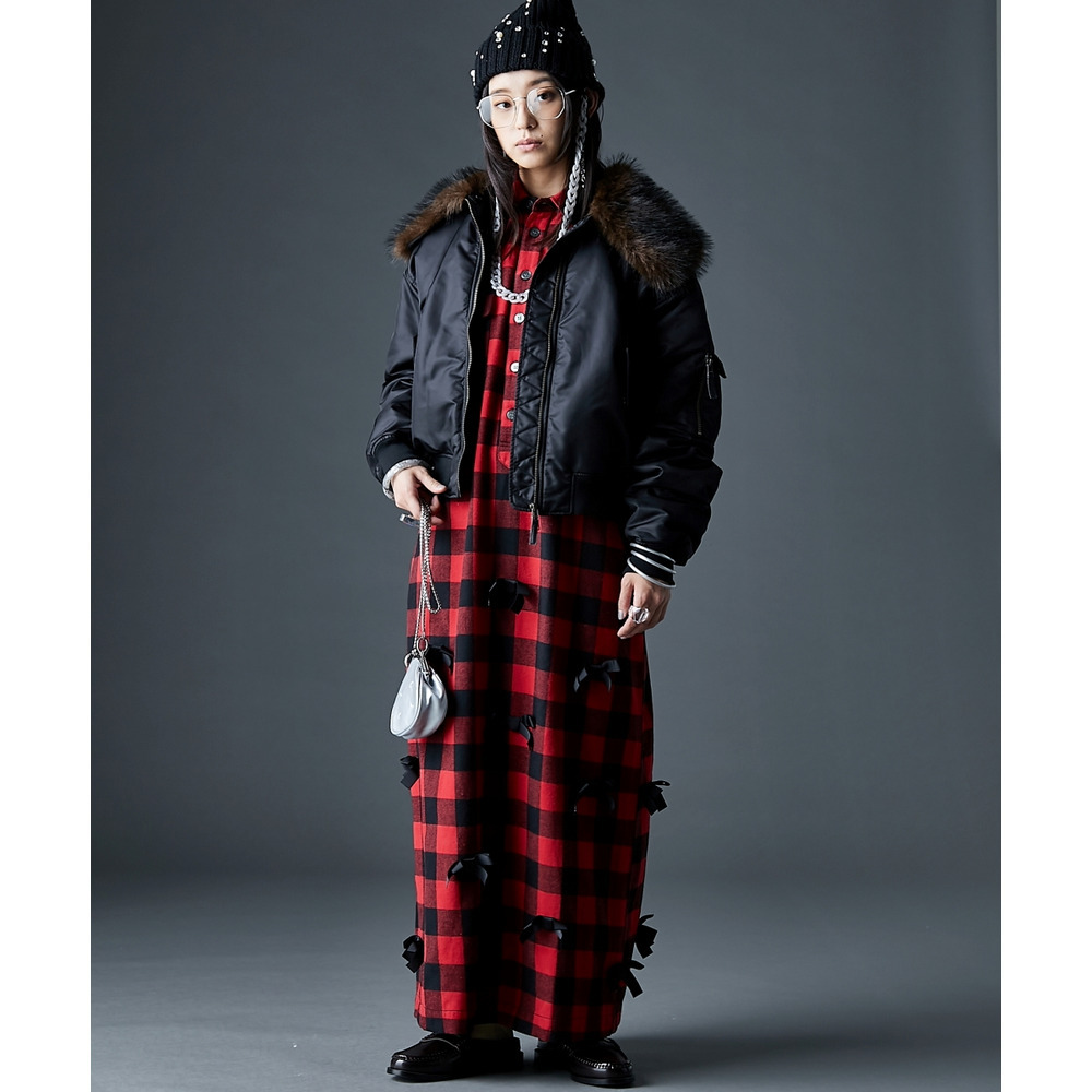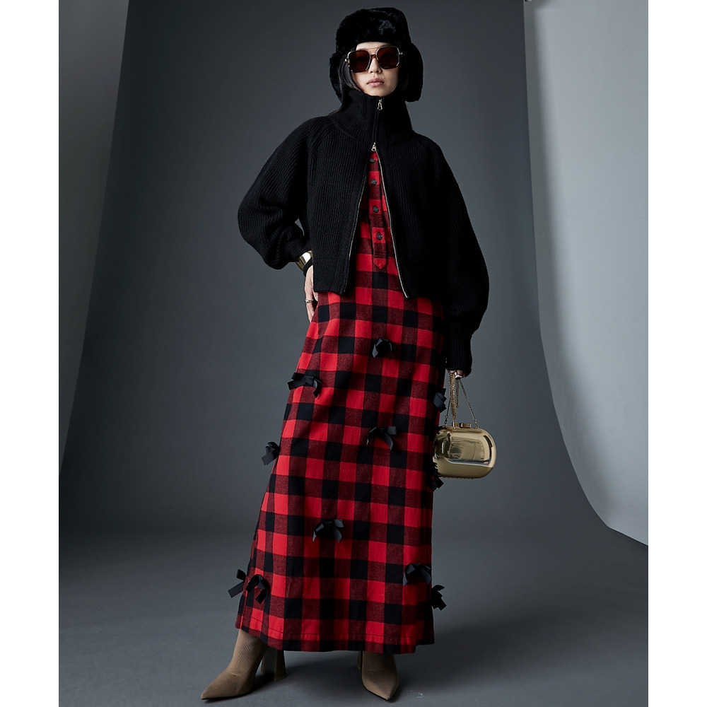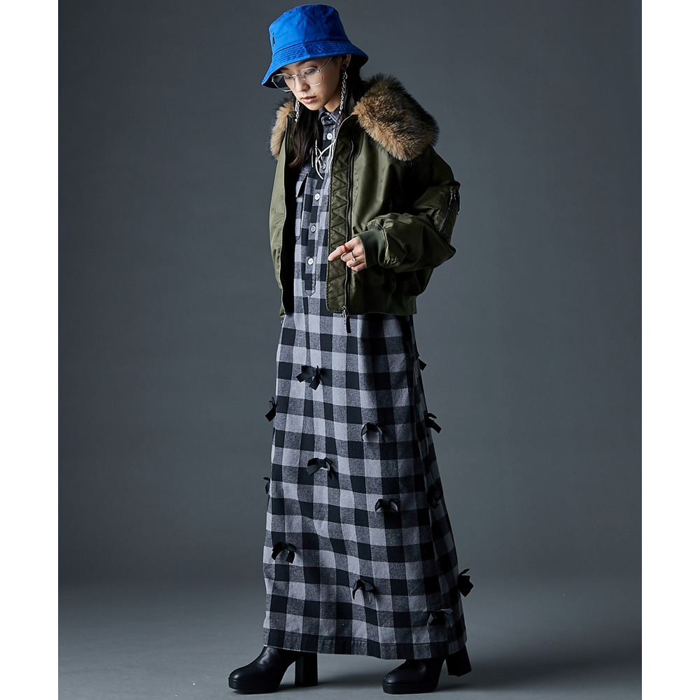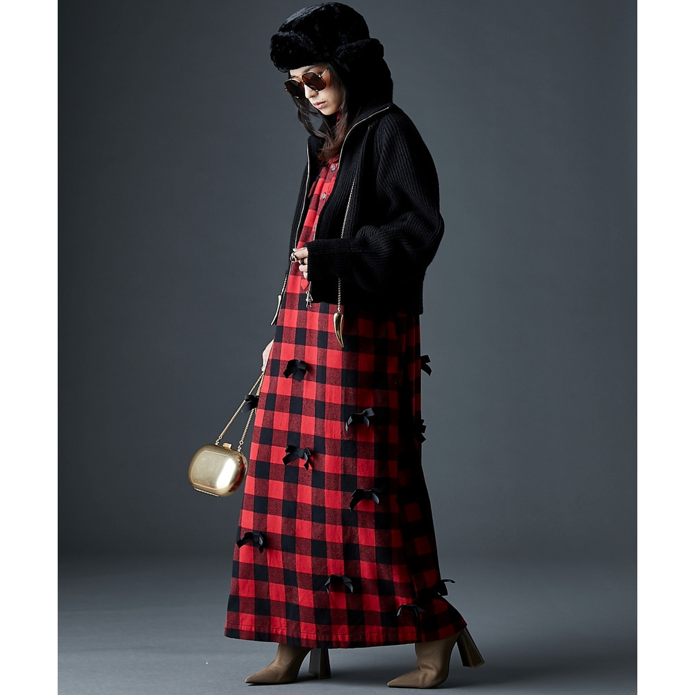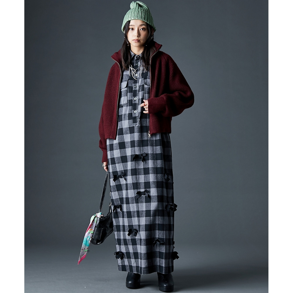 リボン付ブロックチェックシャツマキシワンピース 大きいサイズ GEVS.