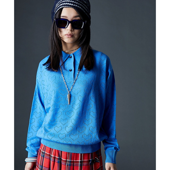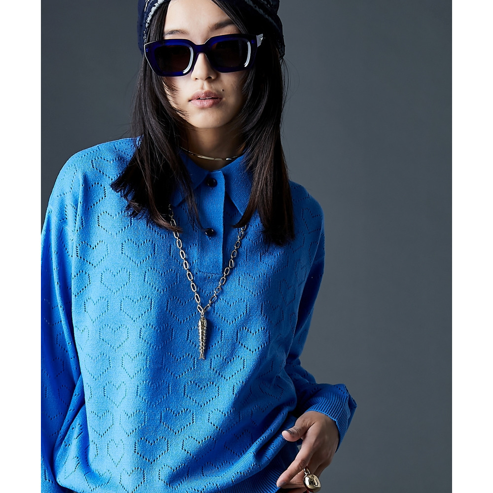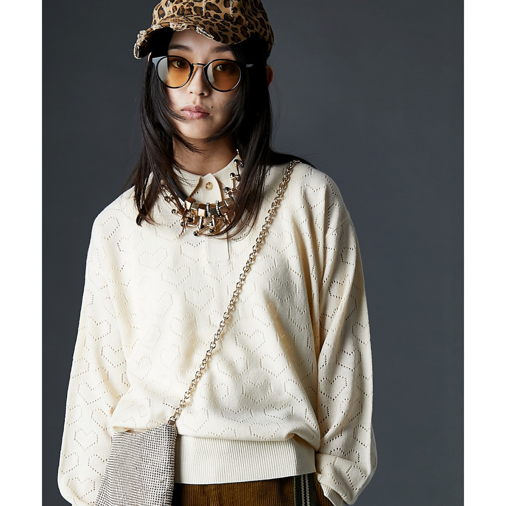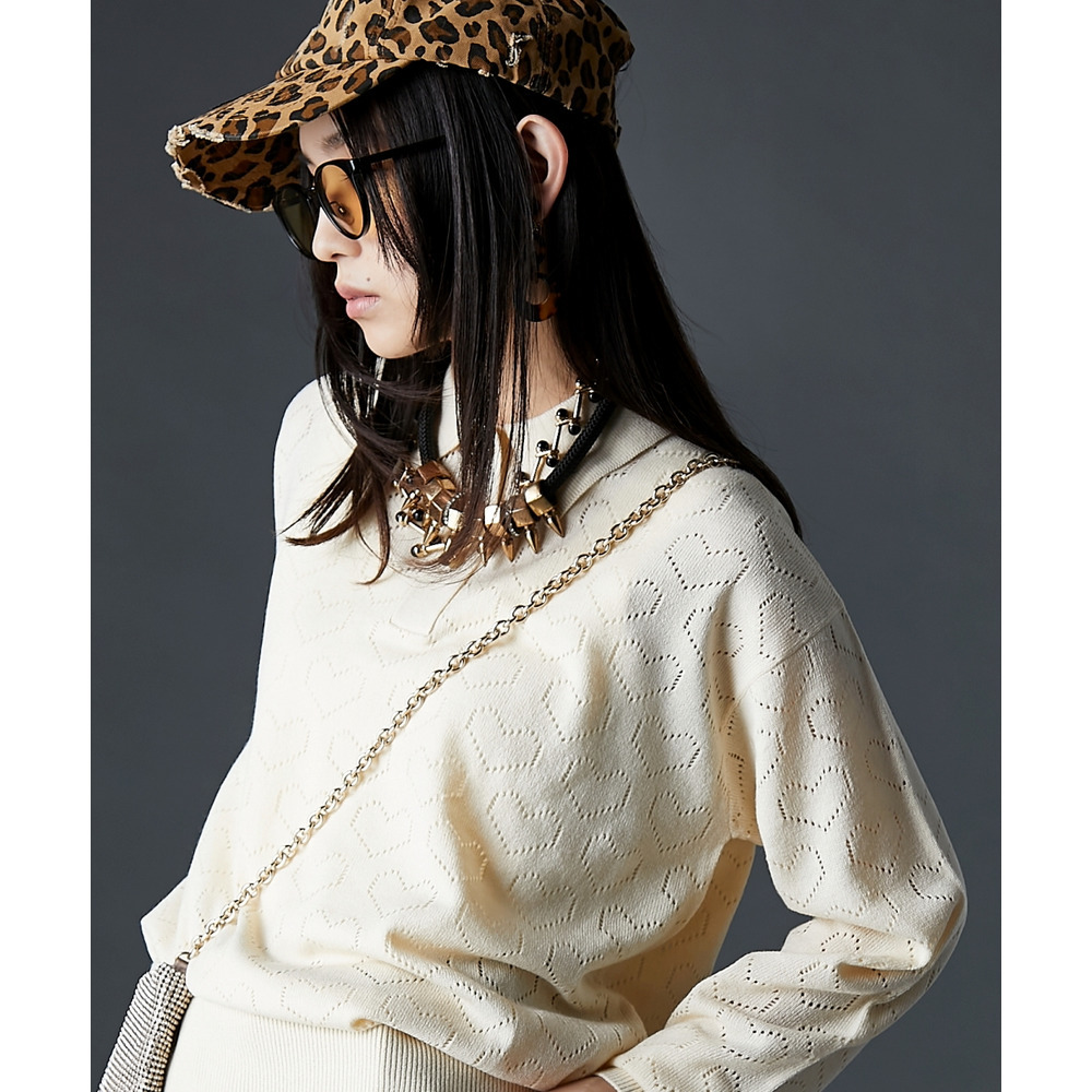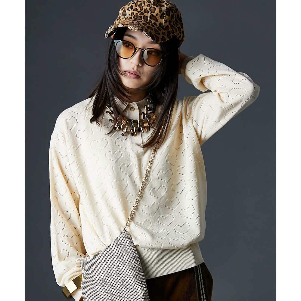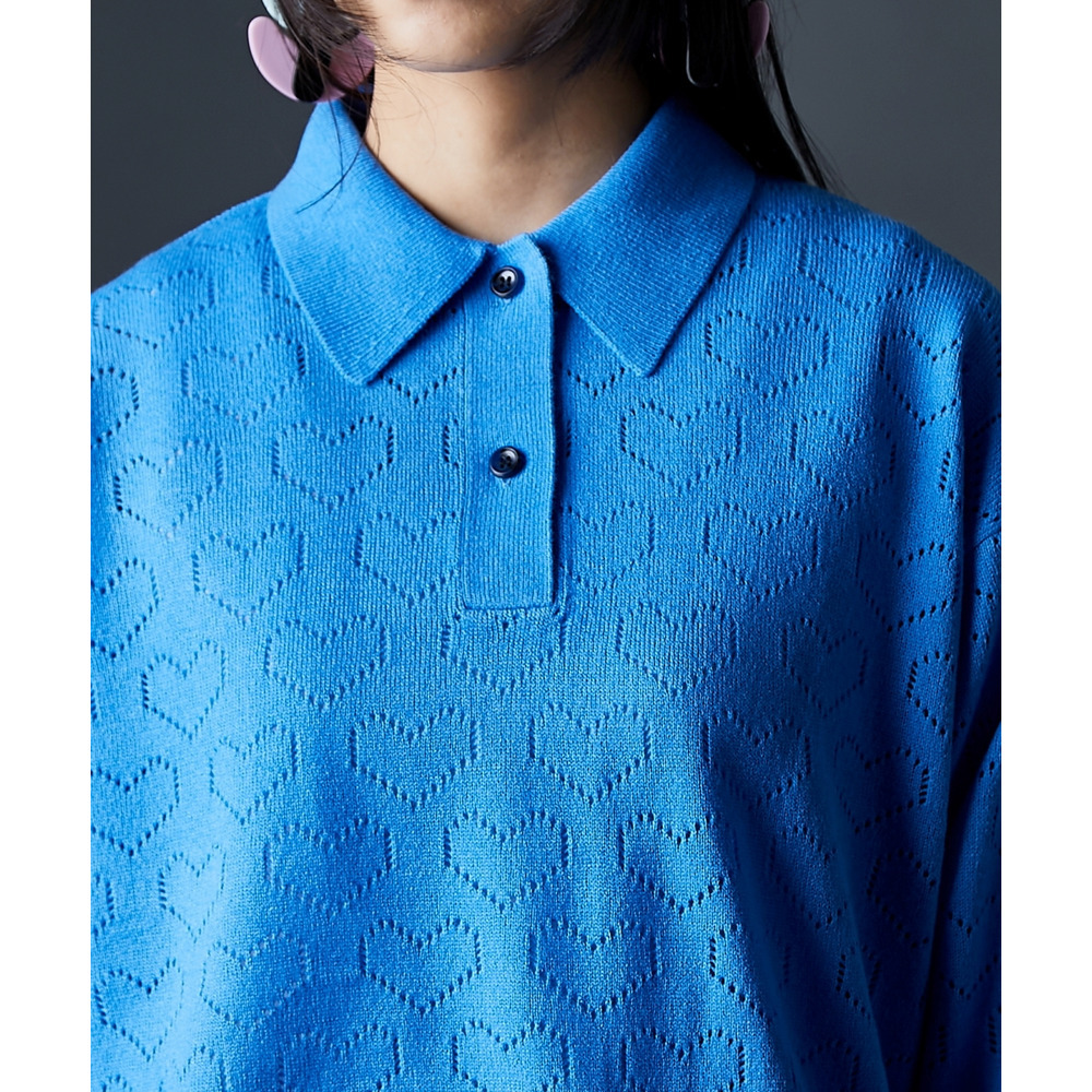 全面に散りばめられたハート柄が目を引く、遊び心溢れるポロニットです。