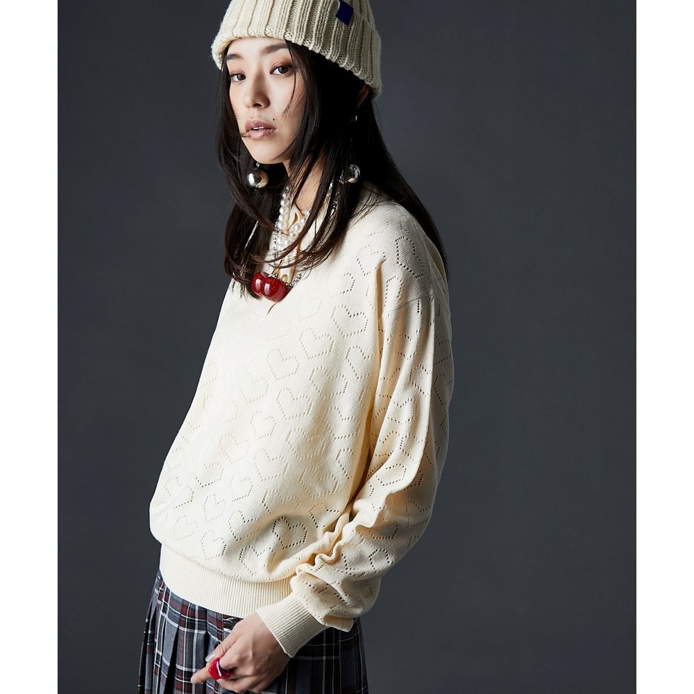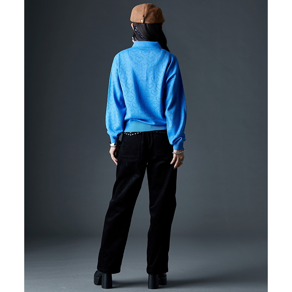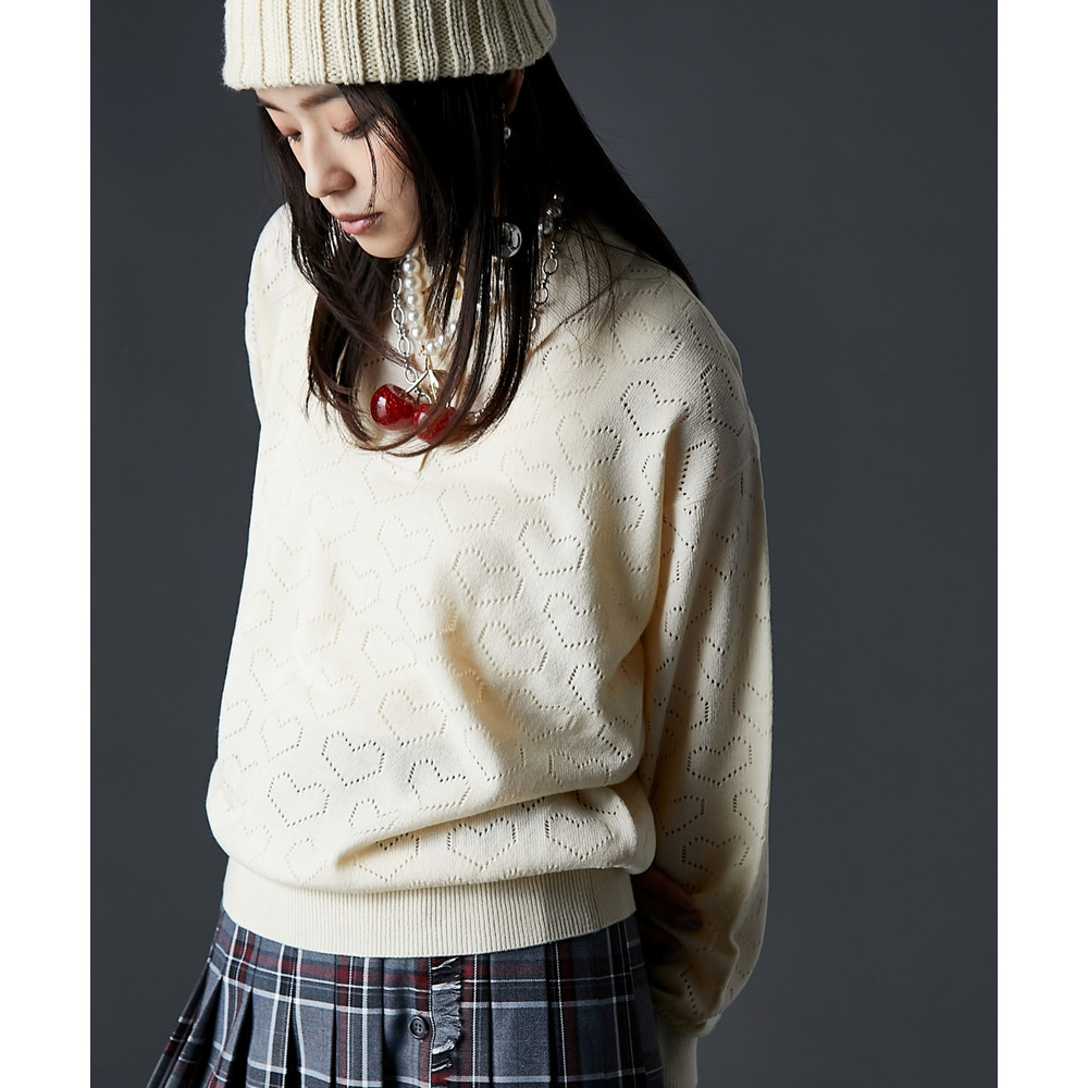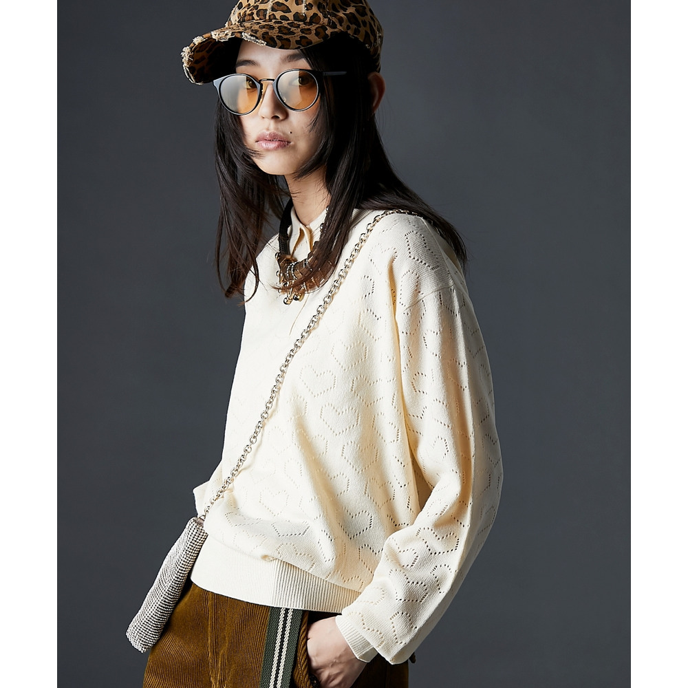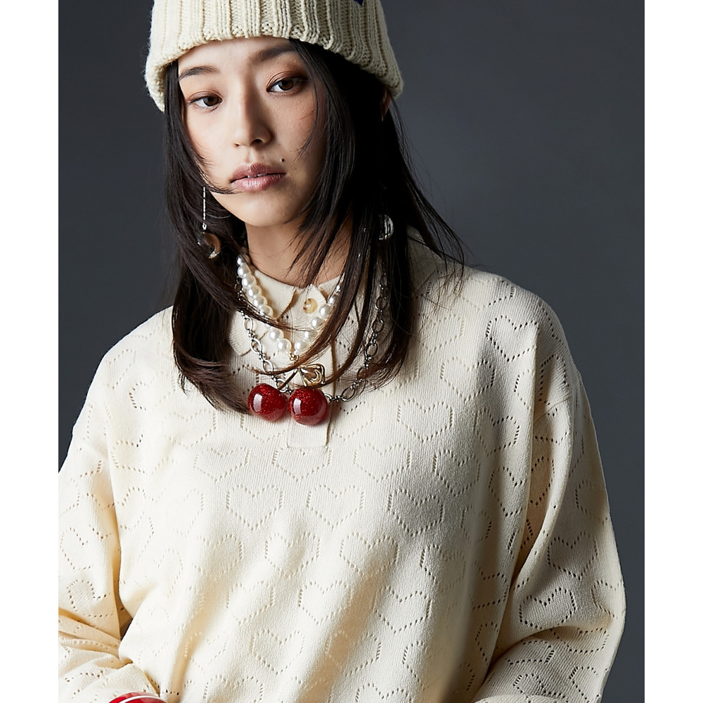 全面に散りばめられたハート柄が目を引く、遊び心溢れるポロニットです。