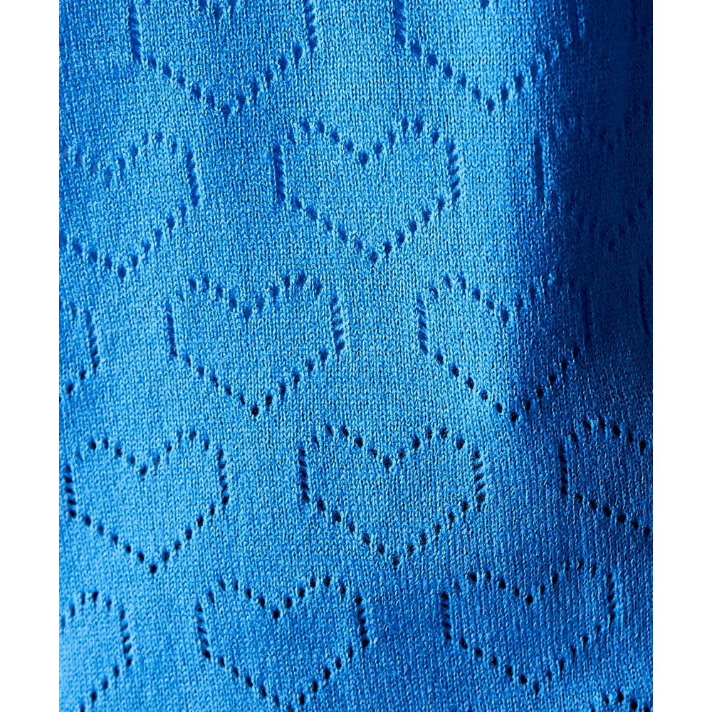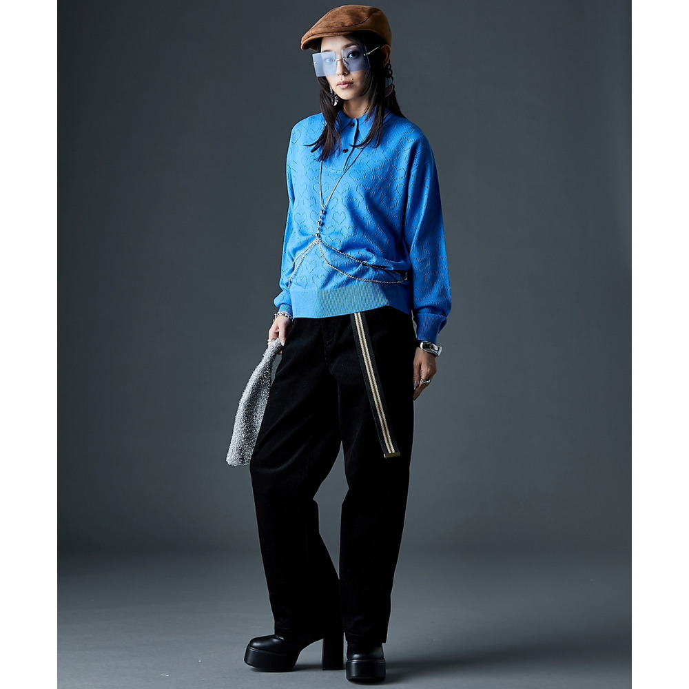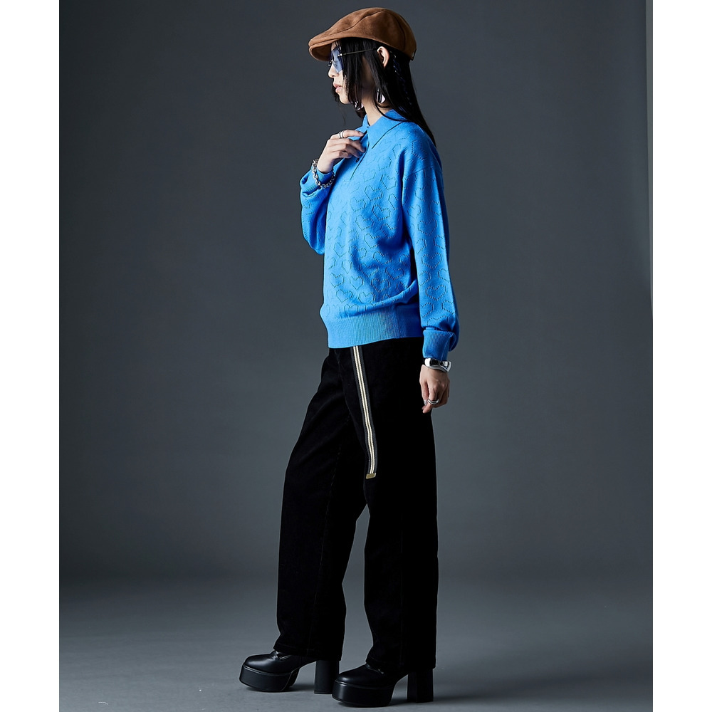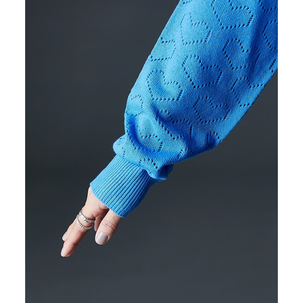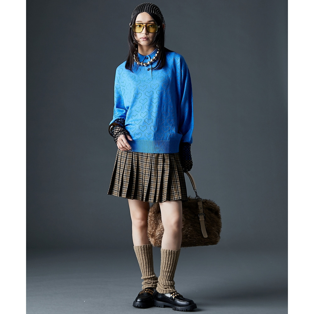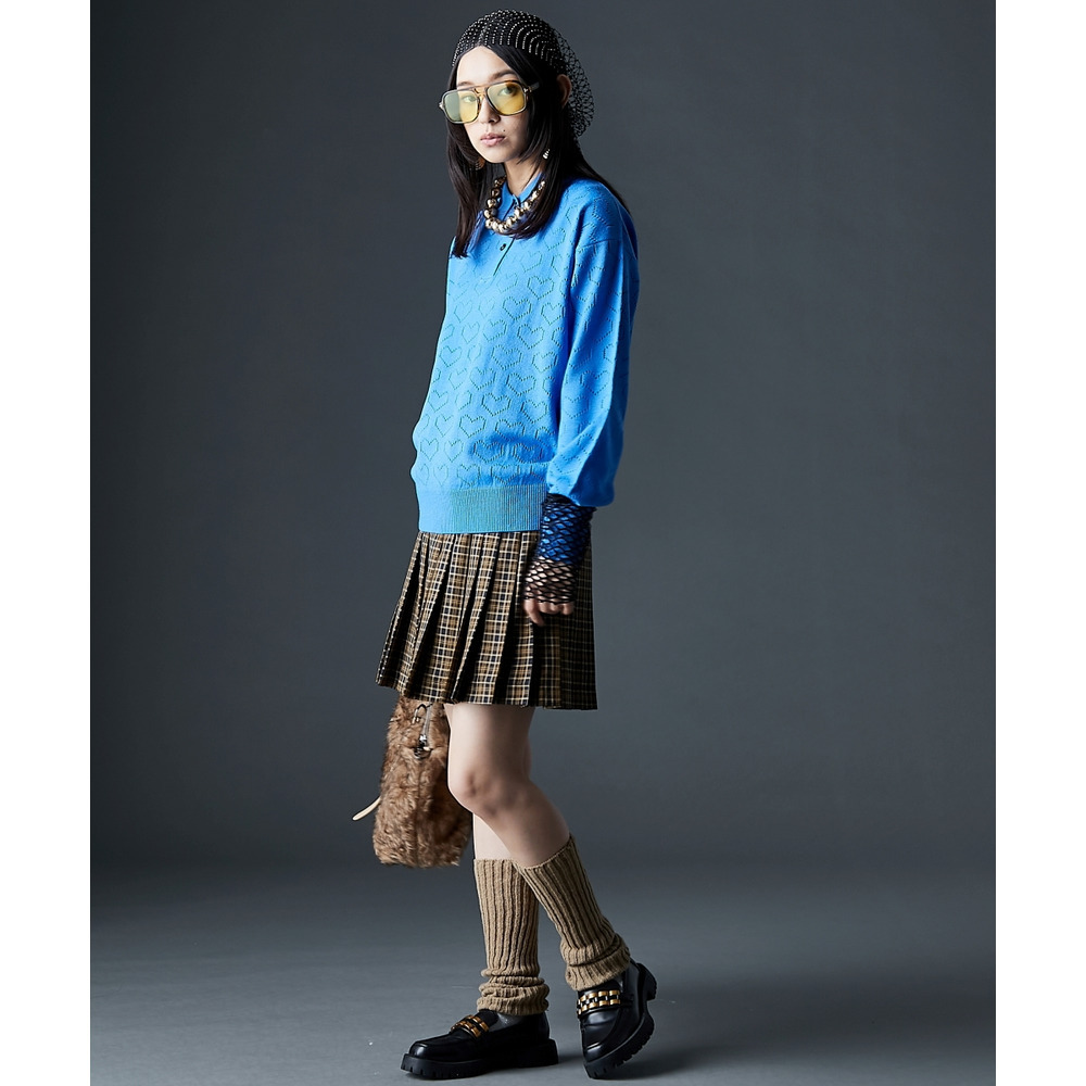 全面に散りばめられたハート柄が目を引く、遊び心溢れるポロニットです。