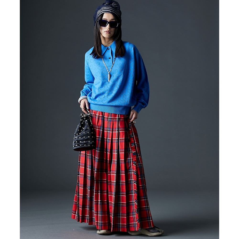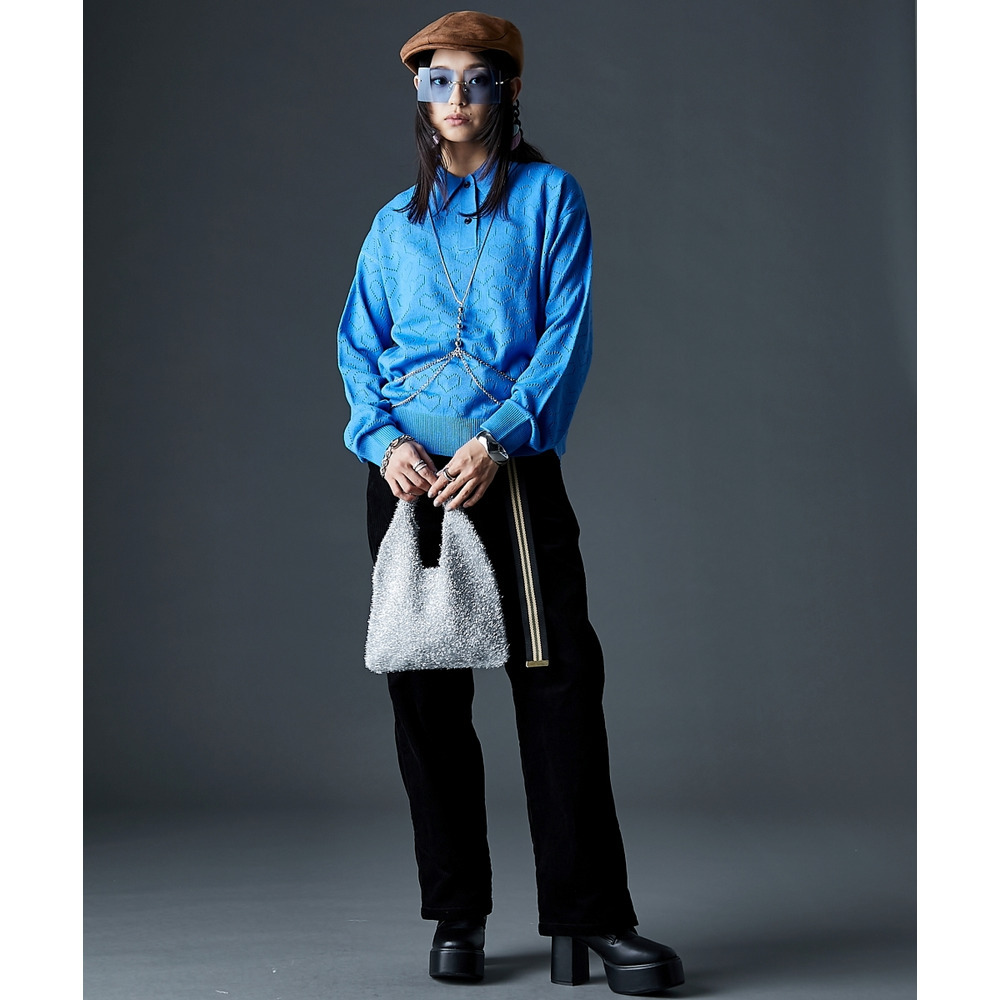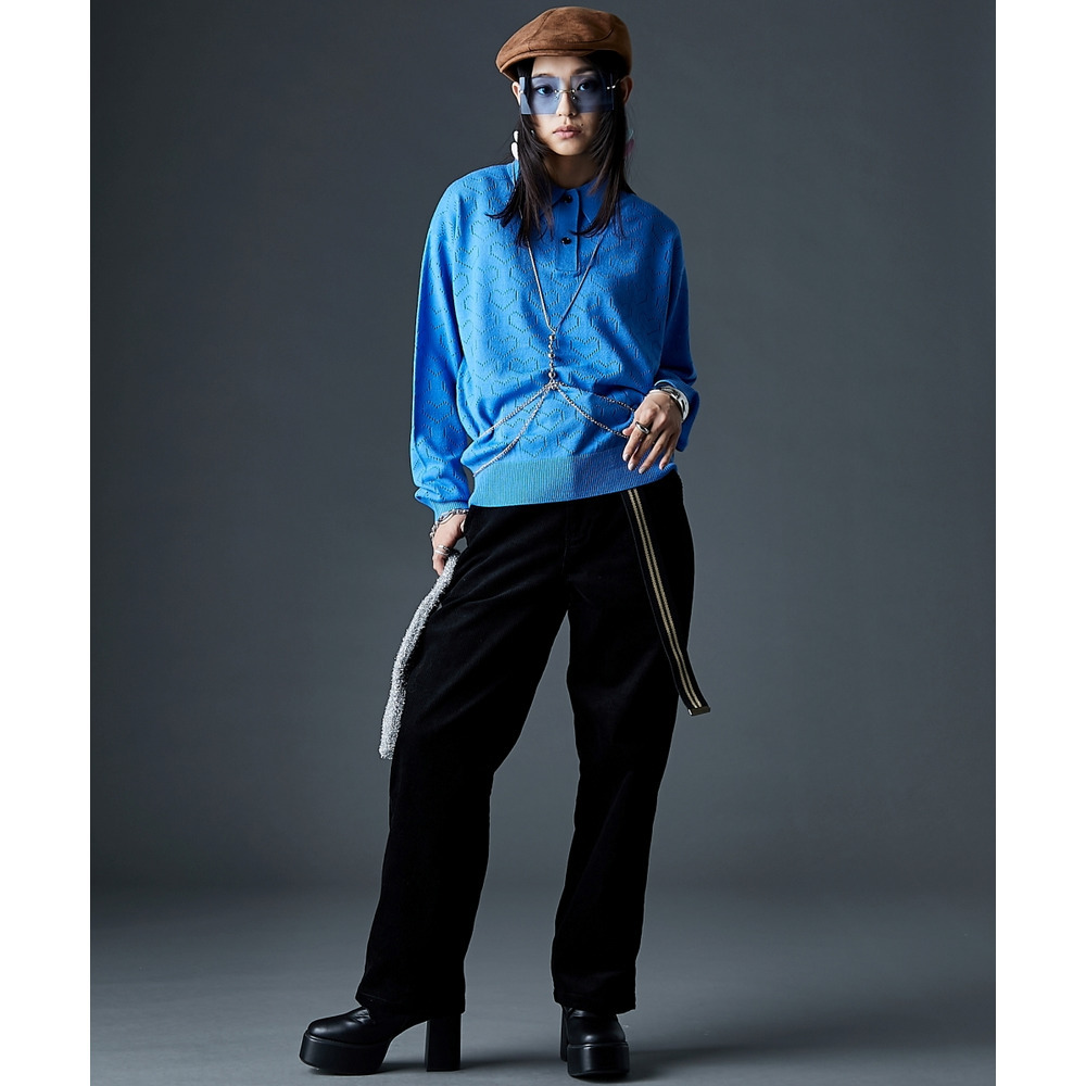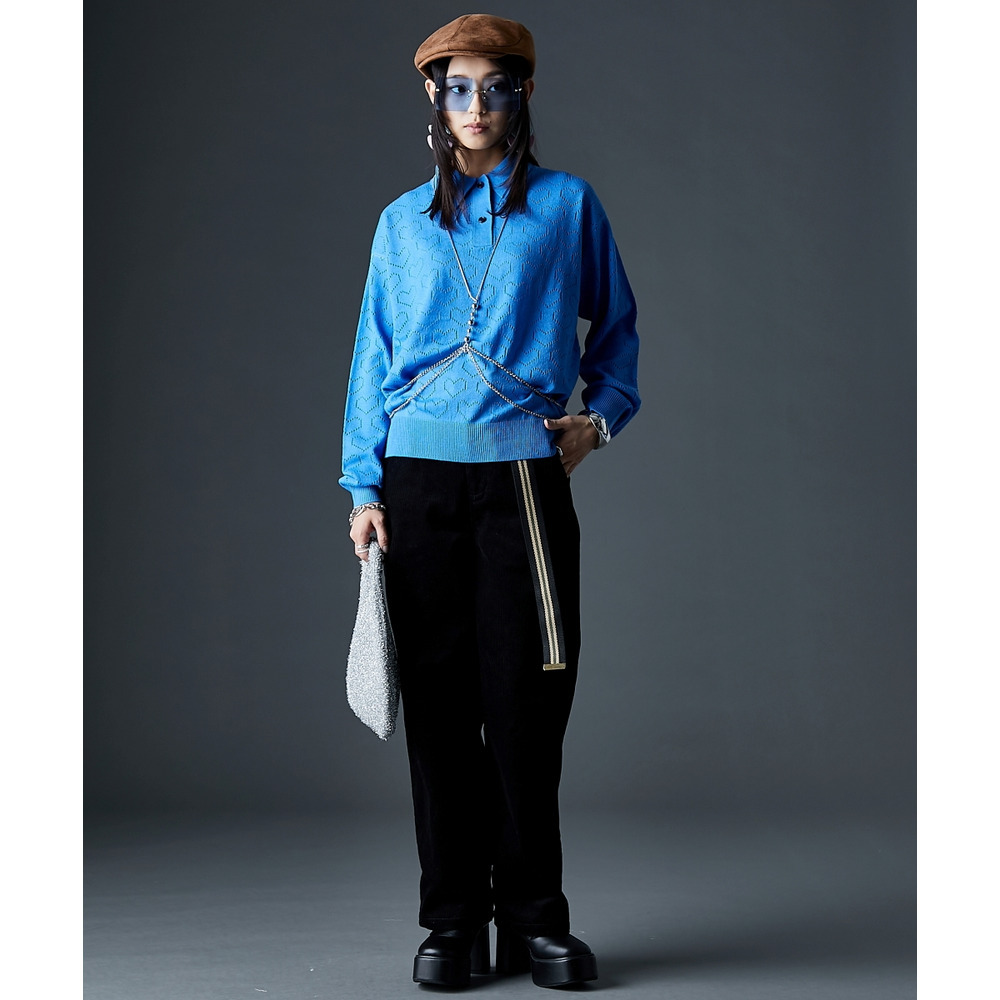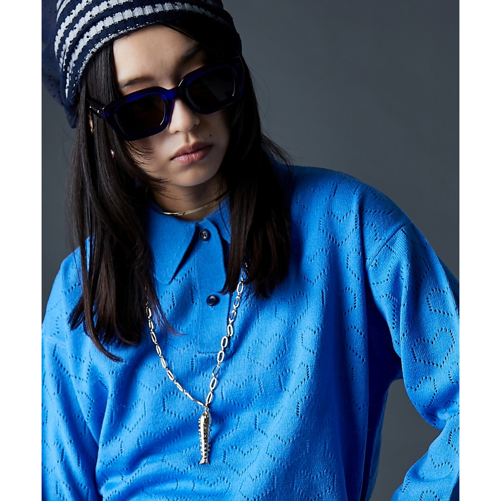 全面に散りばめられたハート柄が目を引く、遊び心溢れるポロニットです。