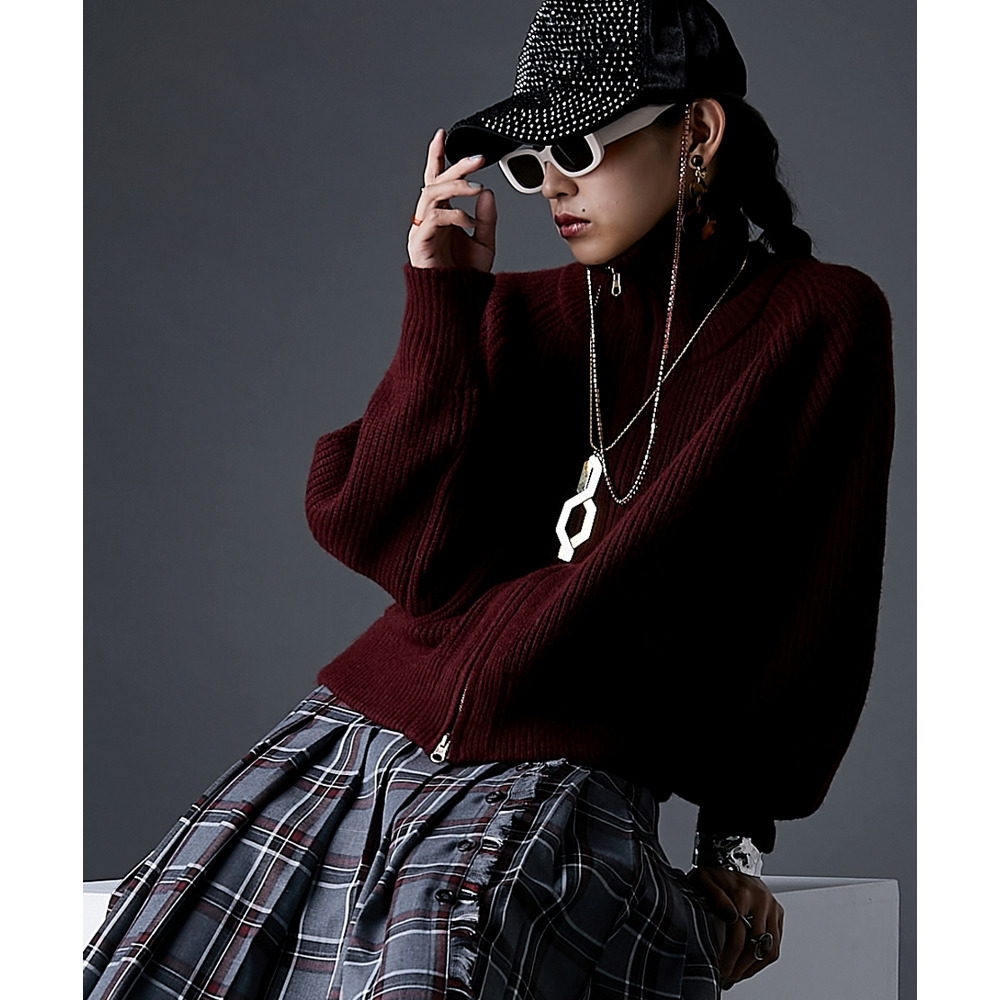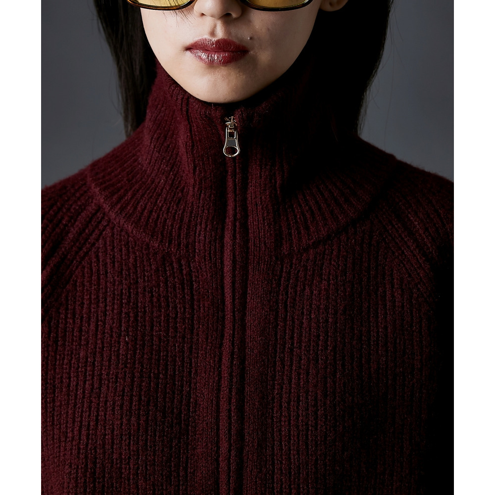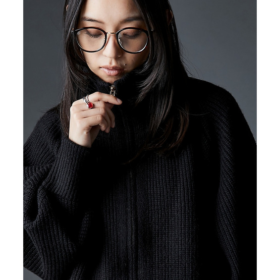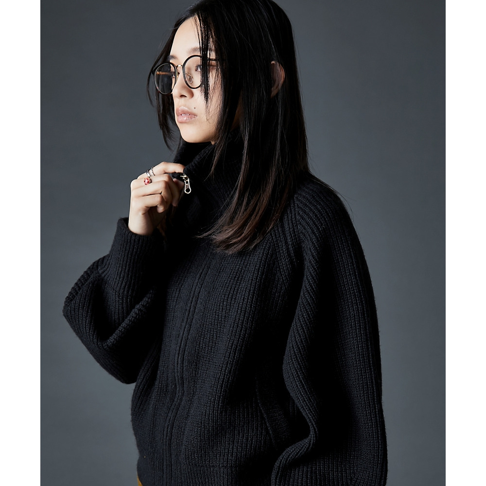 ジップを閉めればハイネック、開ければビッグカラーになる着こなし自由自在なニット。