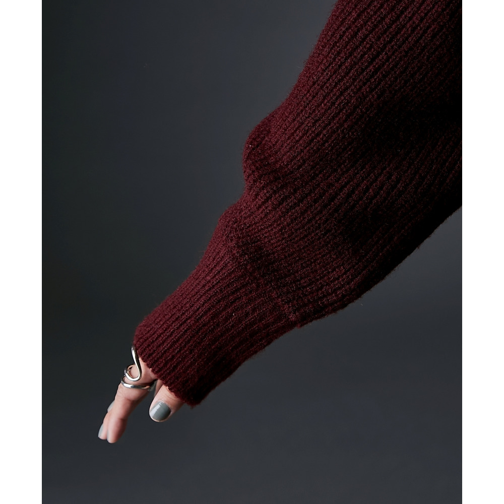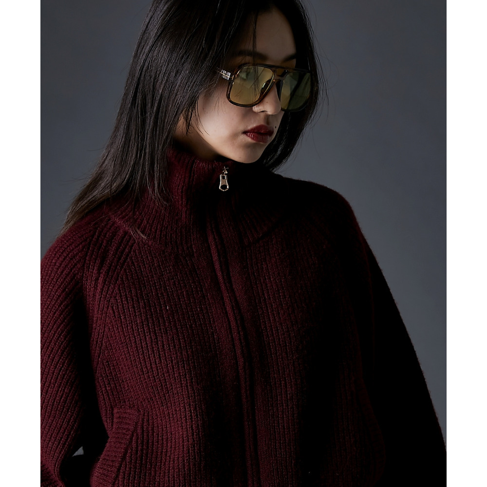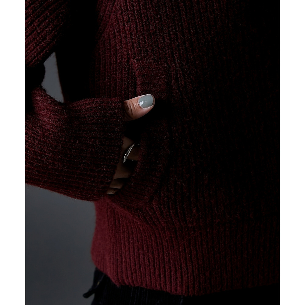 ジップを閉めればハイネック、開ければビッグカラーになる着こなし自由自在なニット。