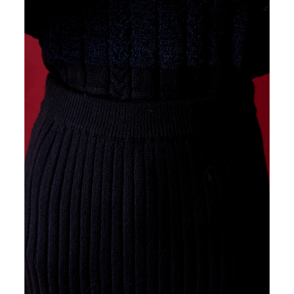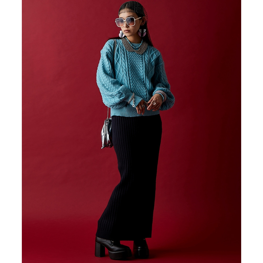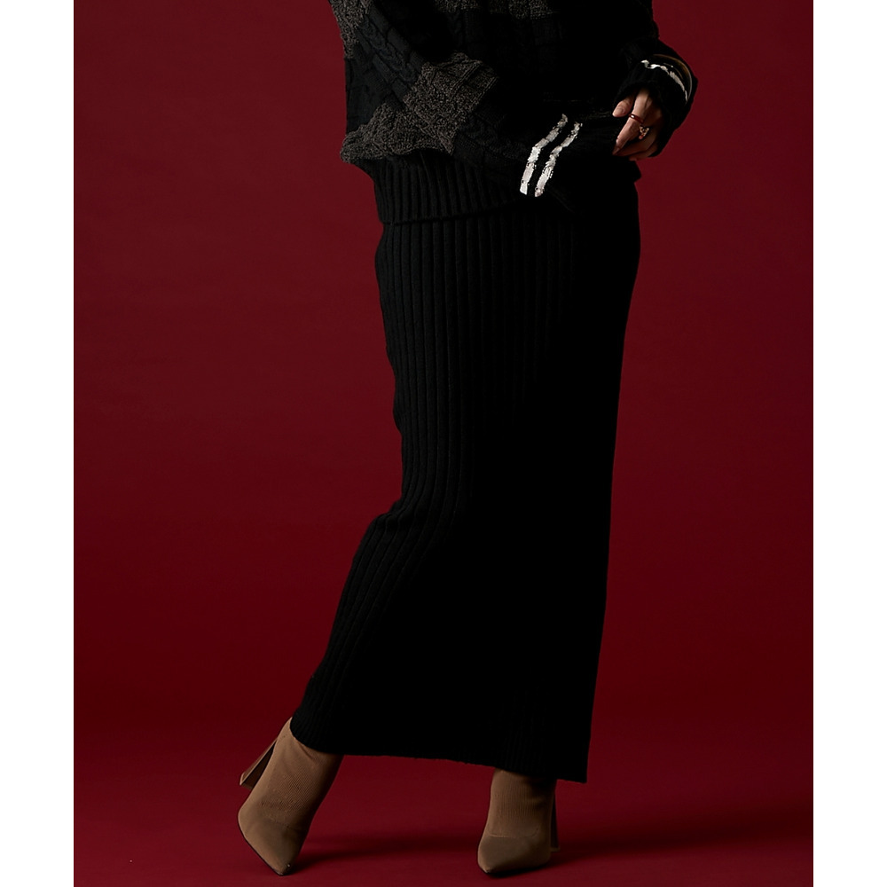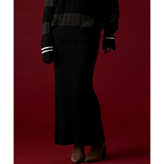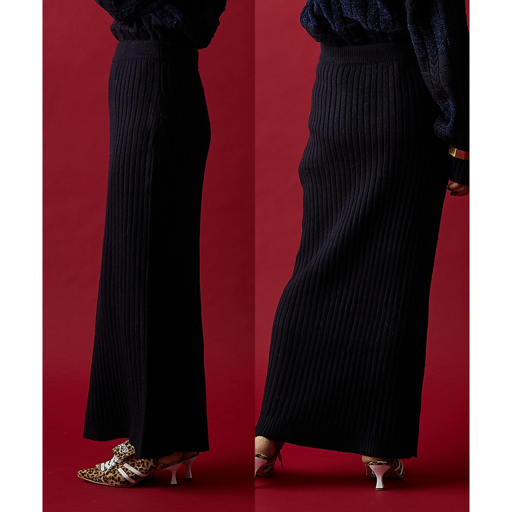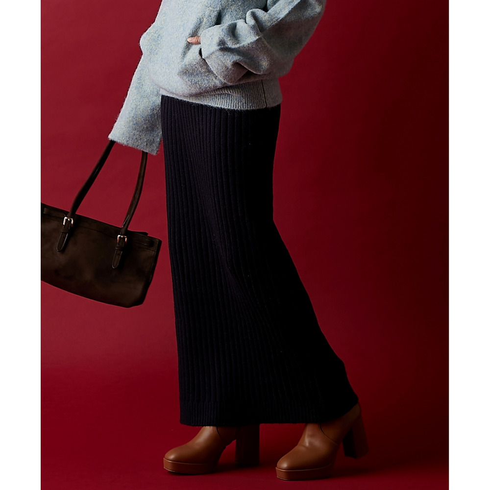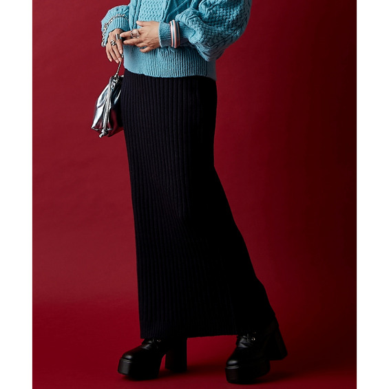 ニットならではの柔らかな素材感ながら太目のリブ編みがタテラインを強調し、足長効果+細見え効果でスタイルアップできるスカートです。