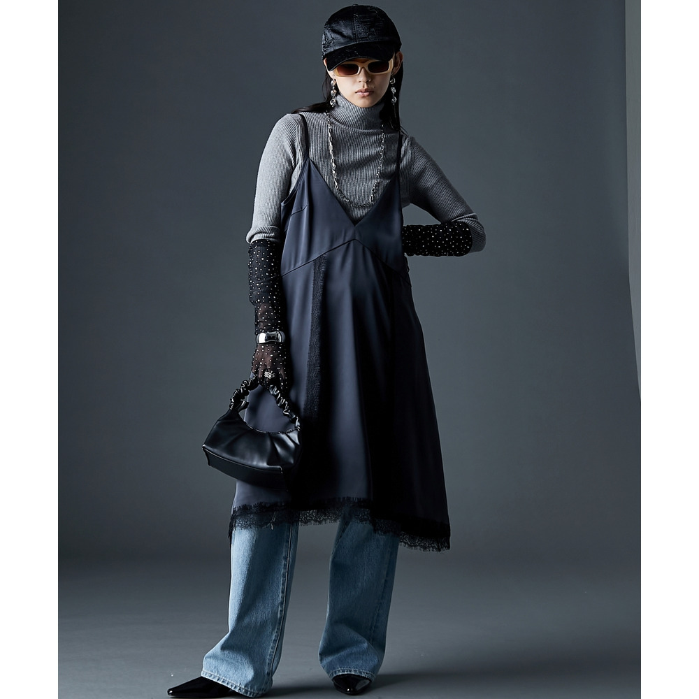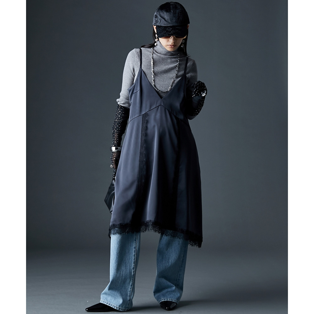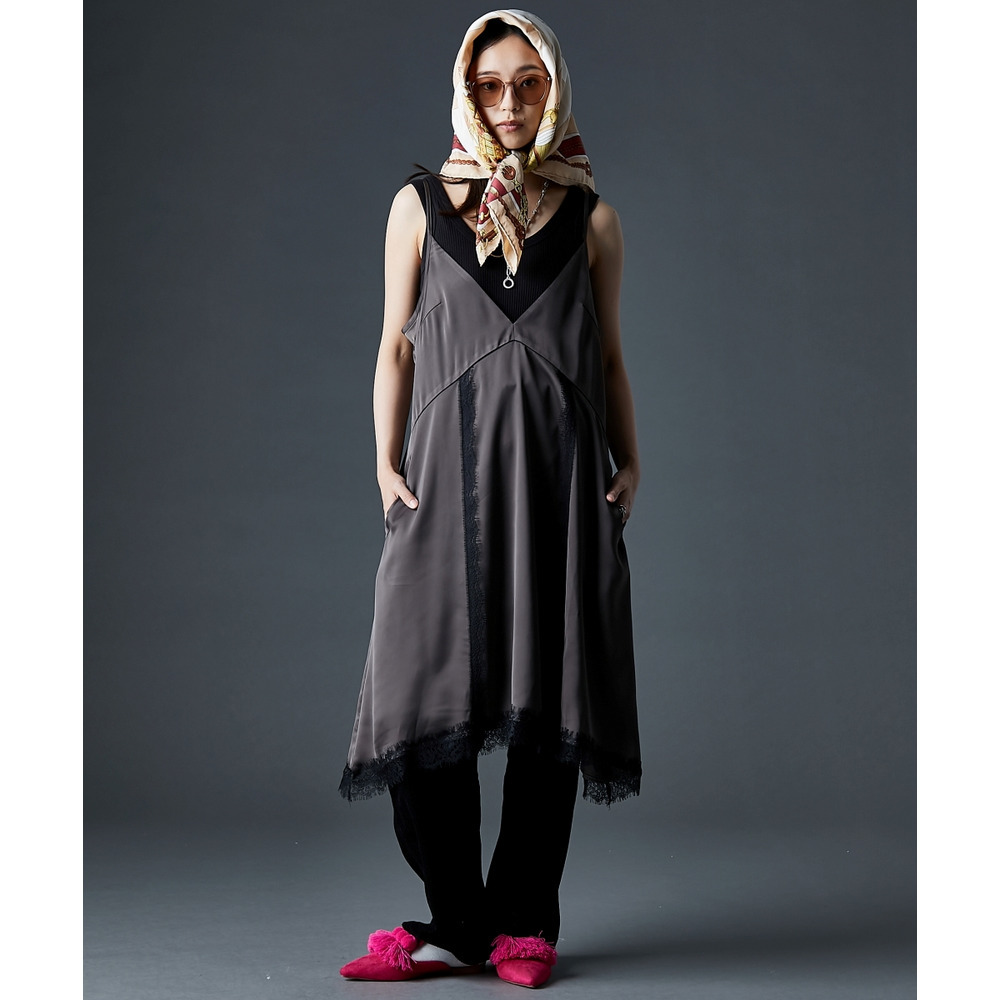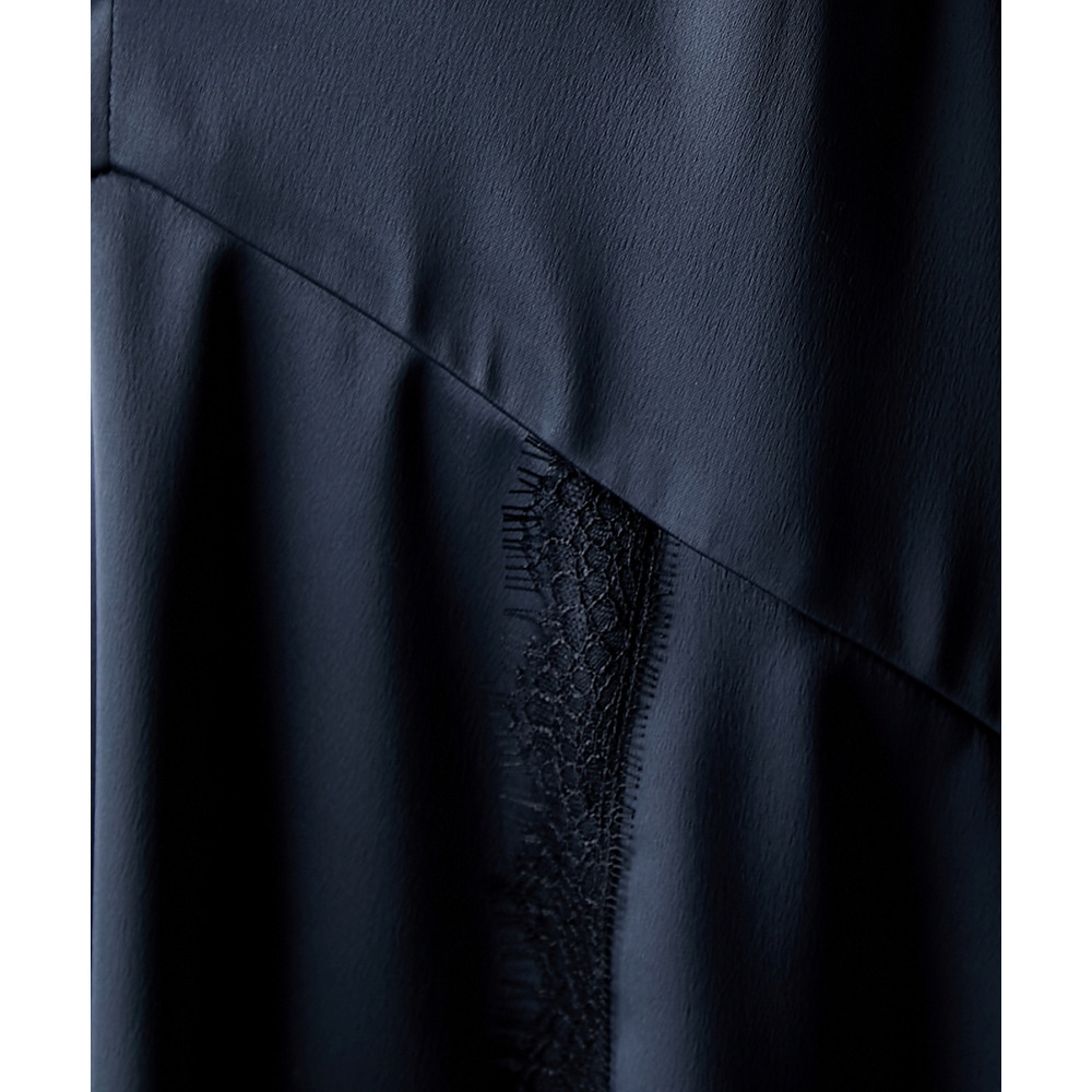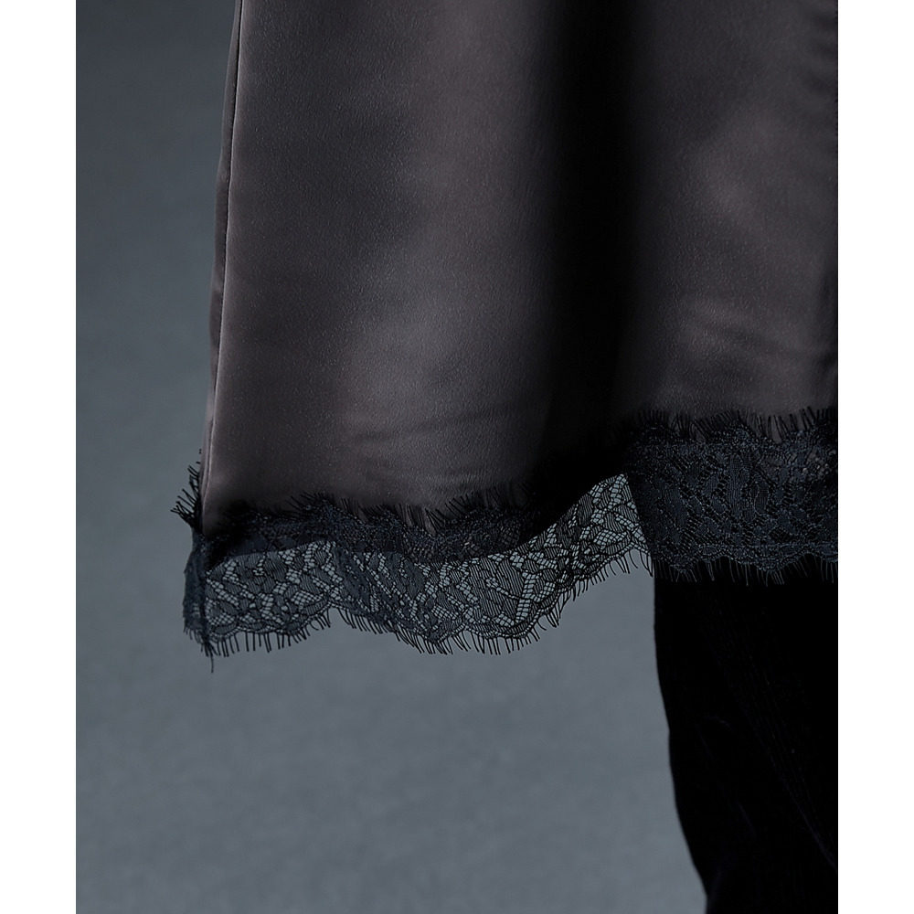 落ち感のある光沢を抑えたサテン生地と切り替え位置と裾にあしらったレースがポイント。