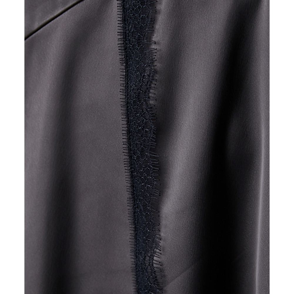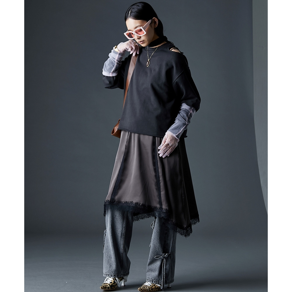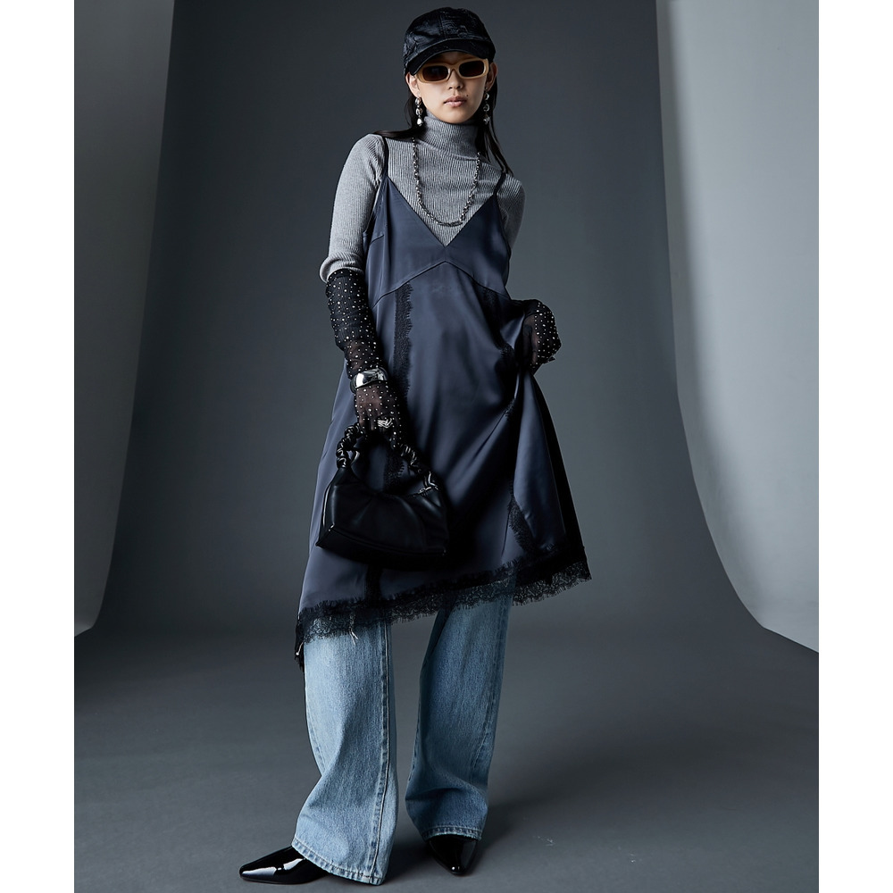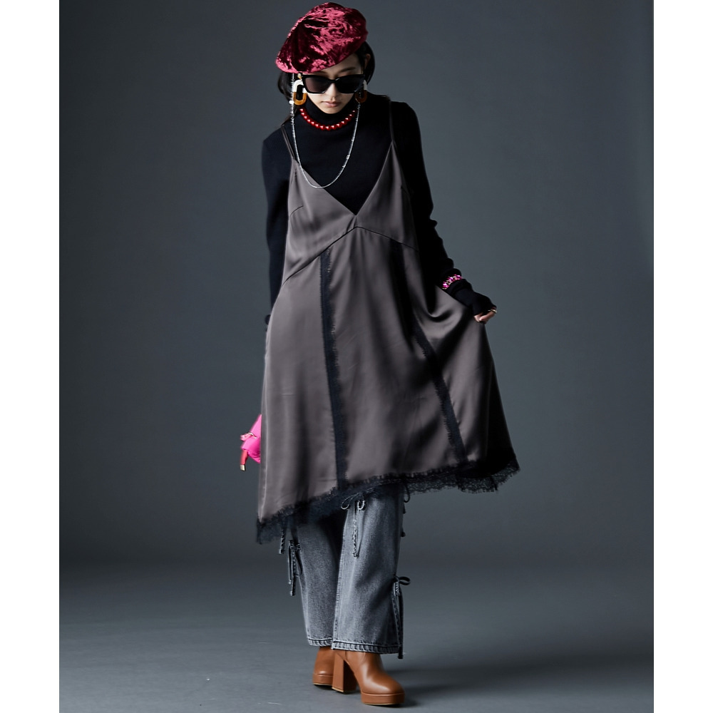 落ち感のある光沢を抑えたサテン生地と切り替え位置と裾にあしらったレースがポイント。
