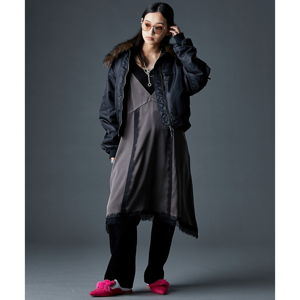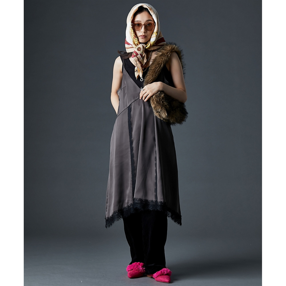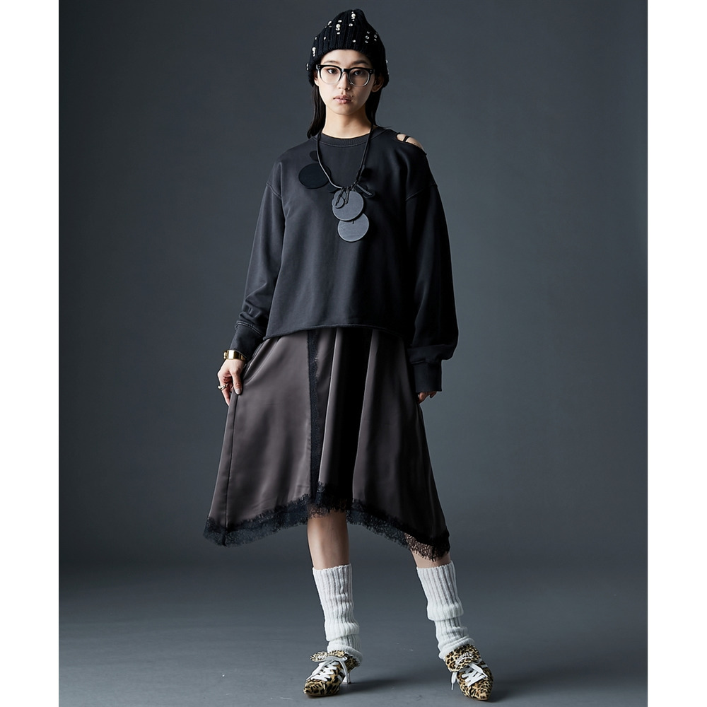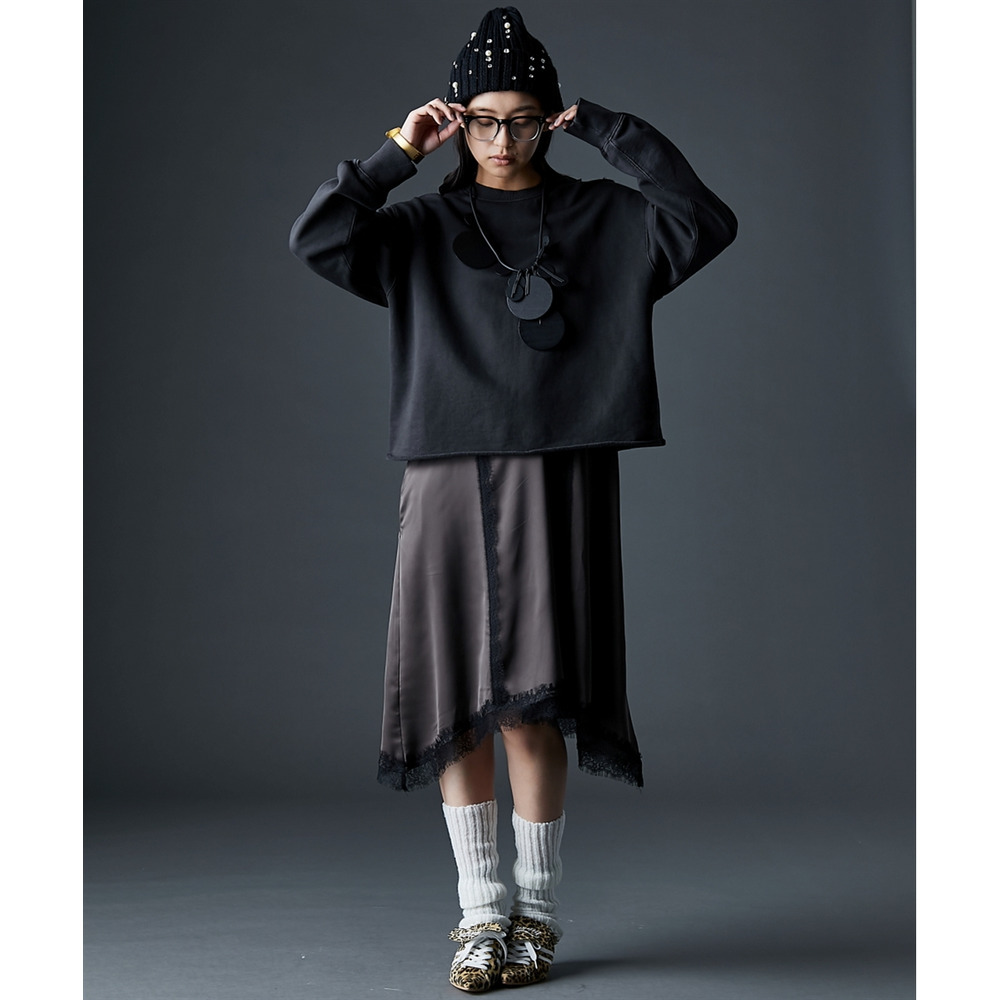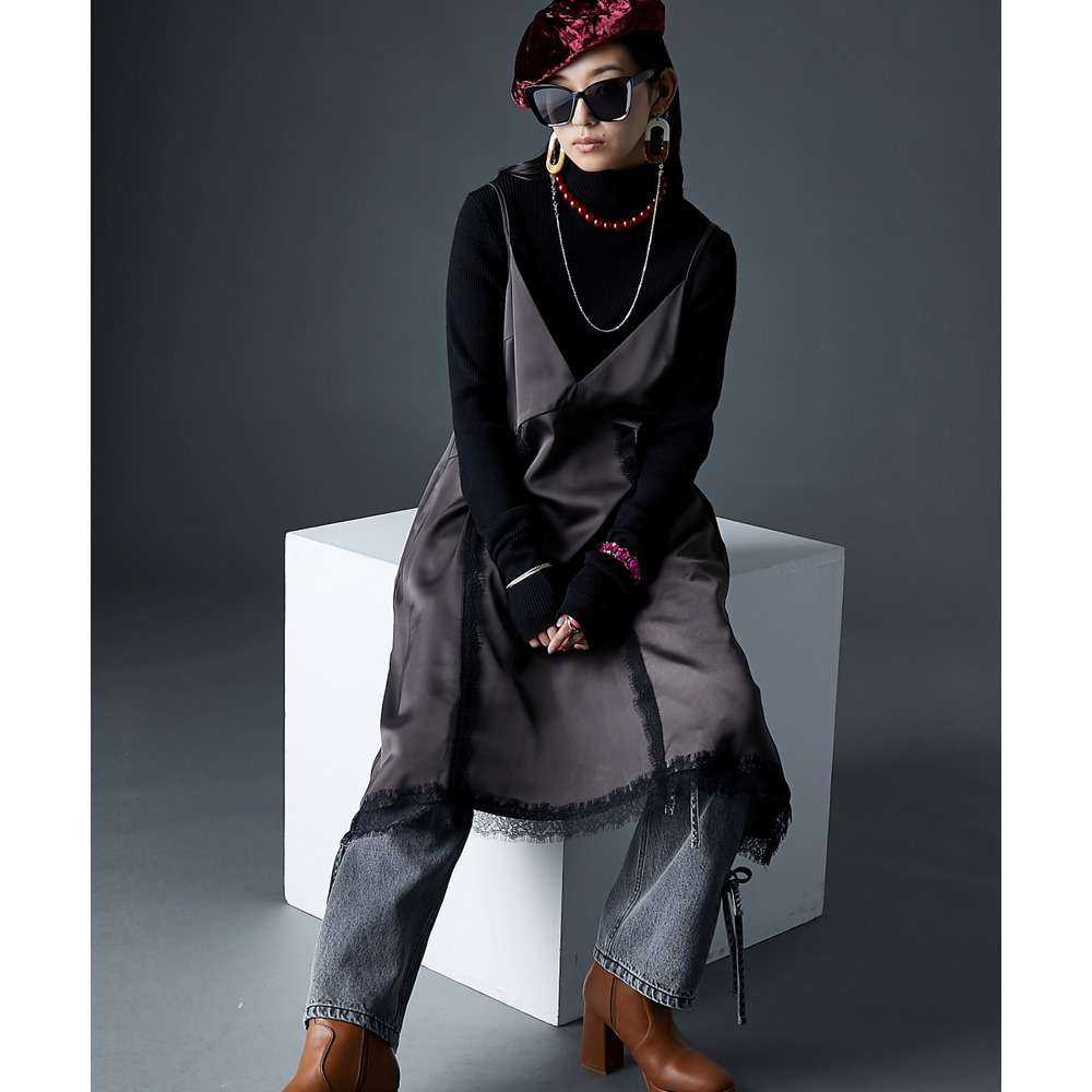 落ち感のある光沢を抑えたサテン生地と切り替え位置と裾にあしらったレースがポイント。