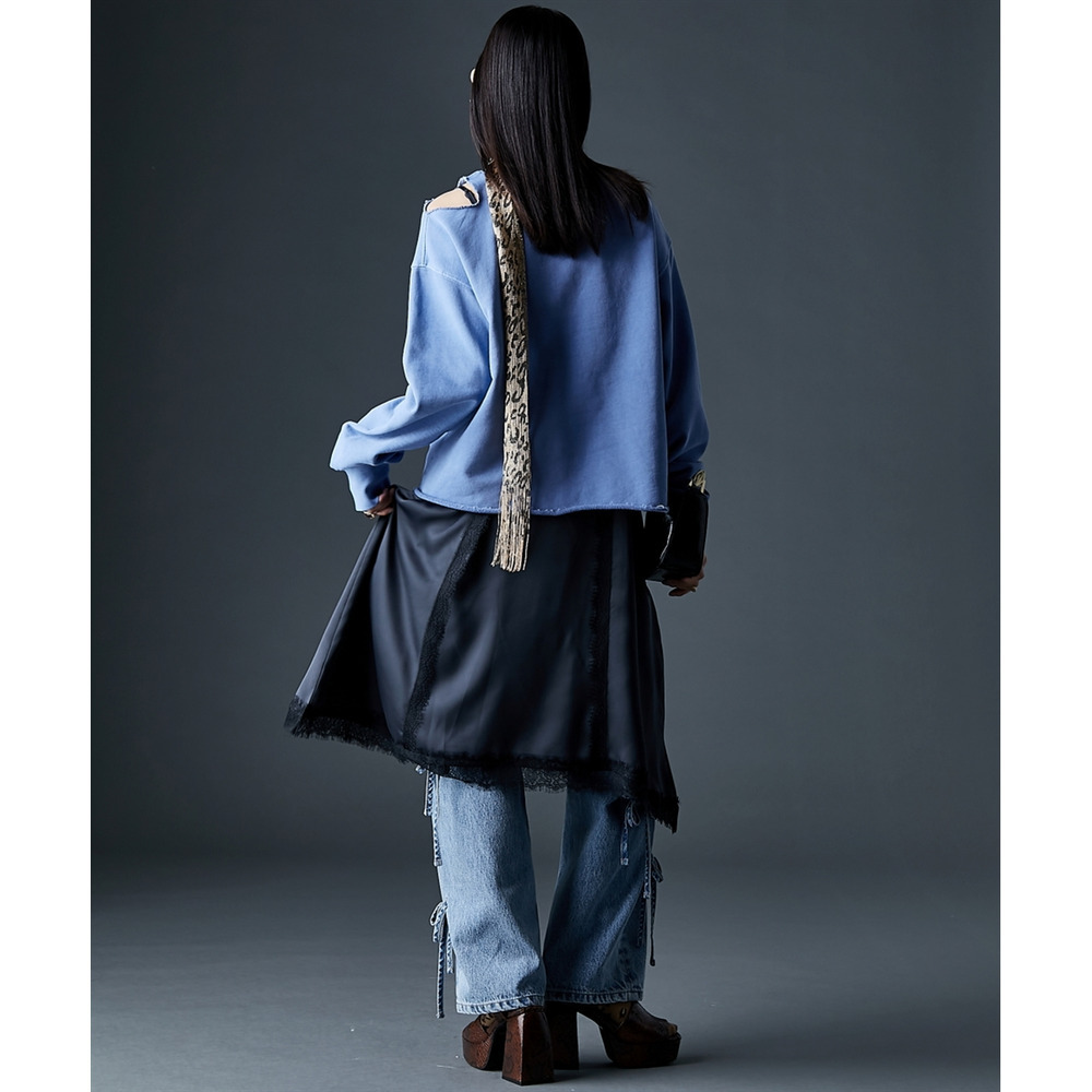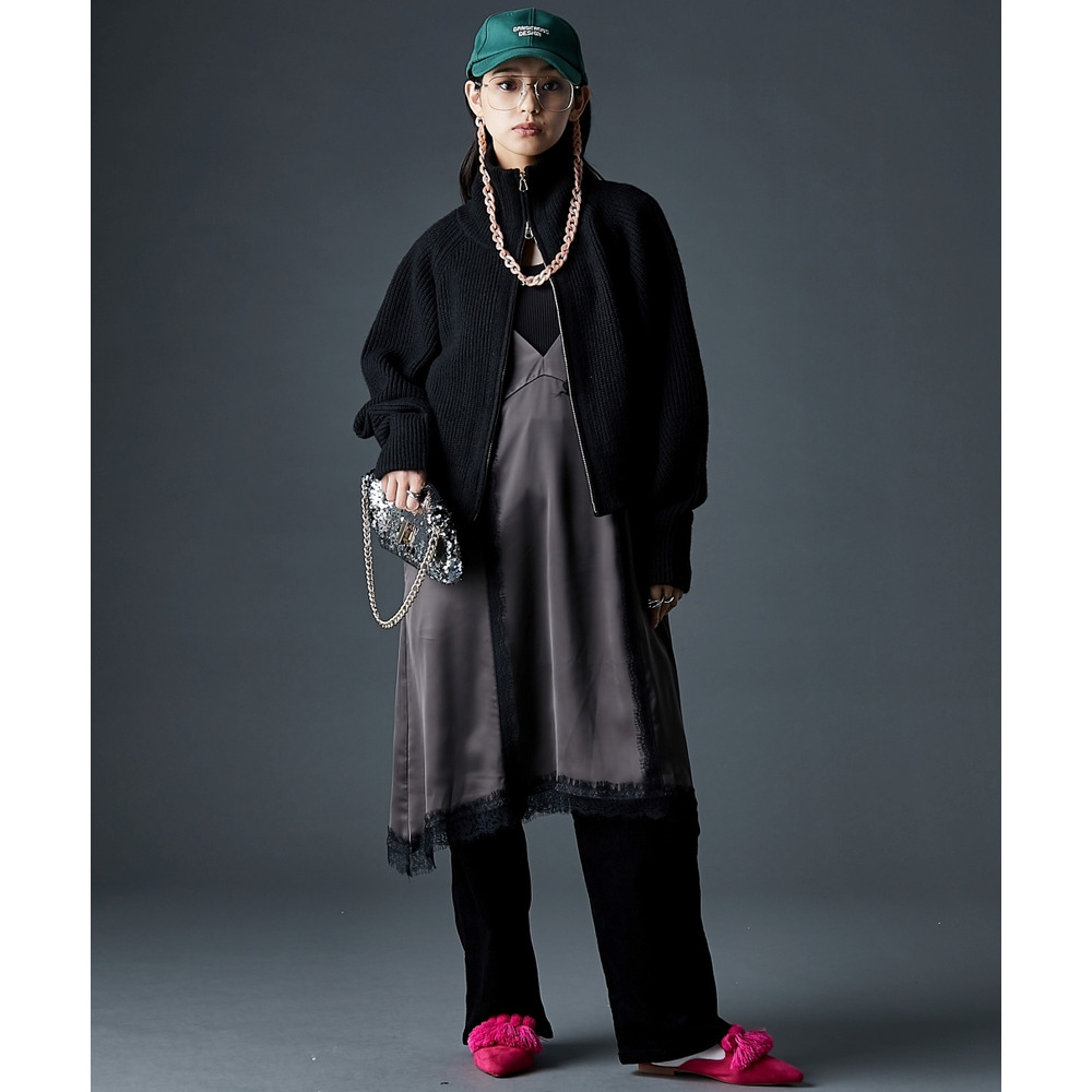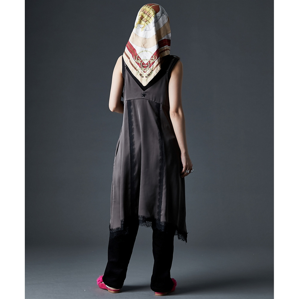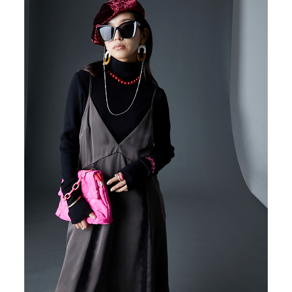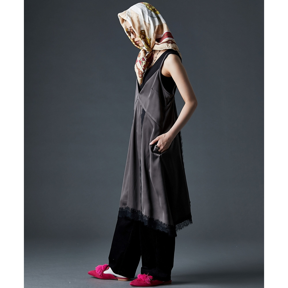落ち感のある光沢を抑えたサテン生地と切り替え位置と裾にあしらったレースがポイント。