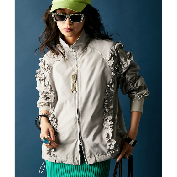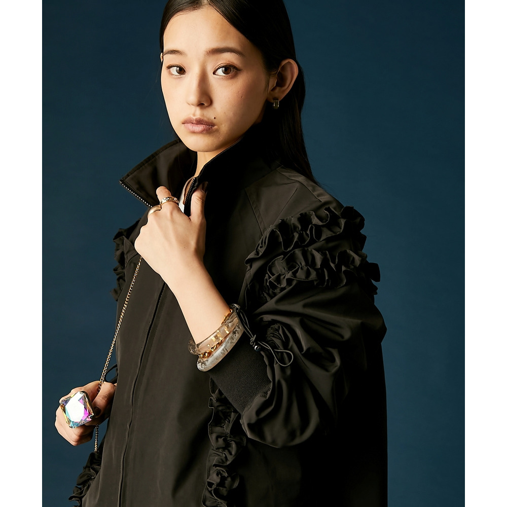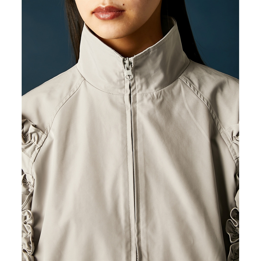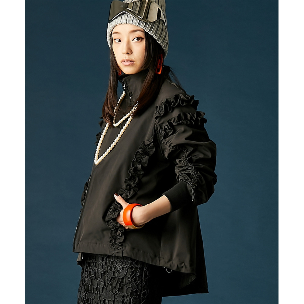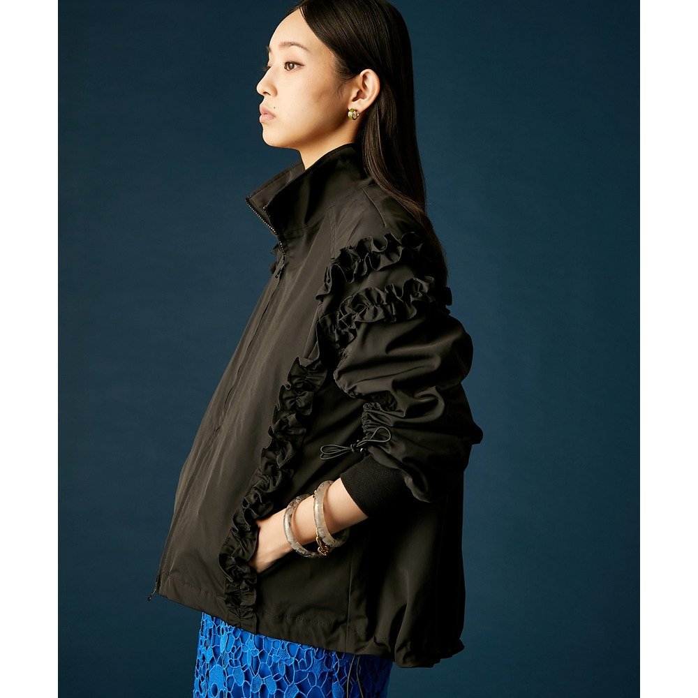 スポーティーなスタンドカラーブルゾンをベースに、袖からフロントにかけて波打つような立体的なフリルを贅沢にあしらいました。