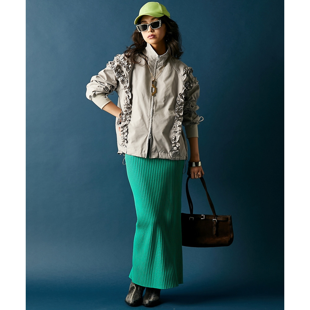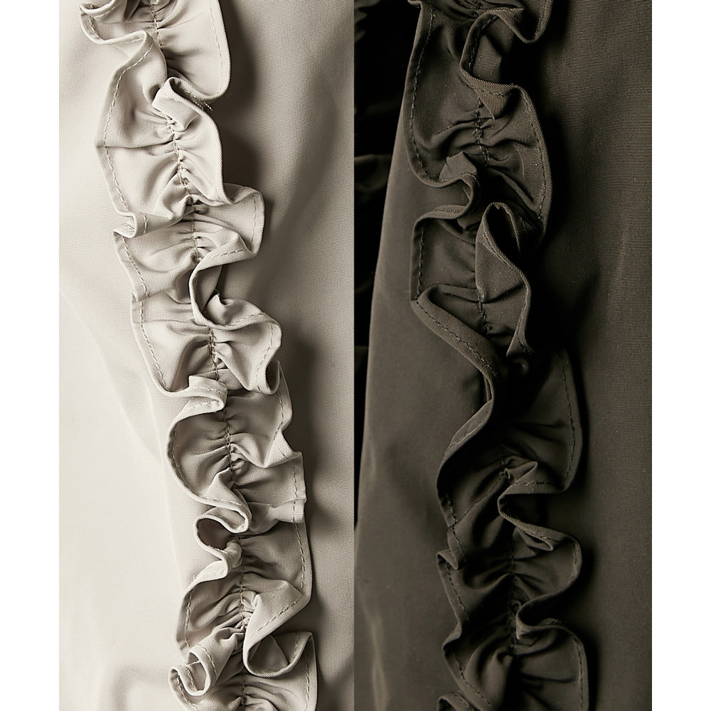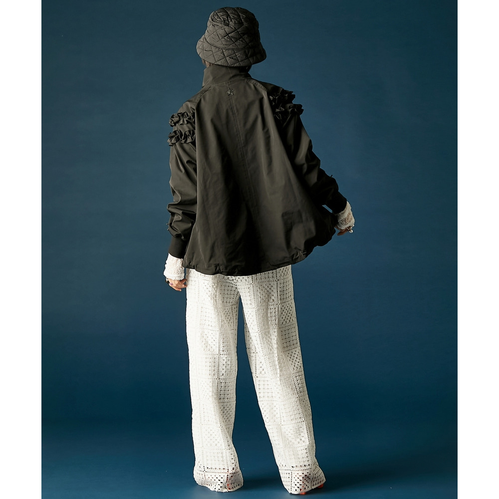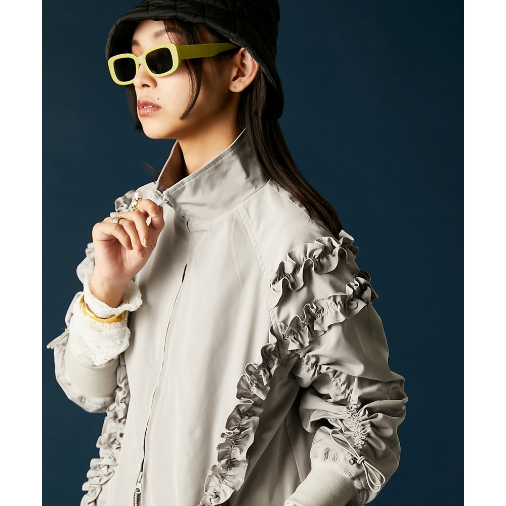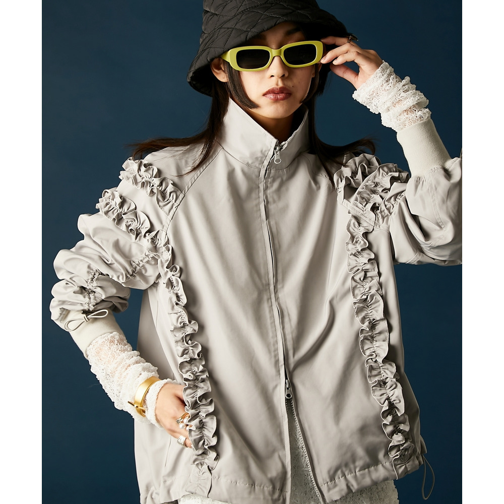 スポーティーなスタンドカラーブルゾンをベースに、袖からフロントにかけて波打つような立体的なフリルを贅沢にあしらいました。